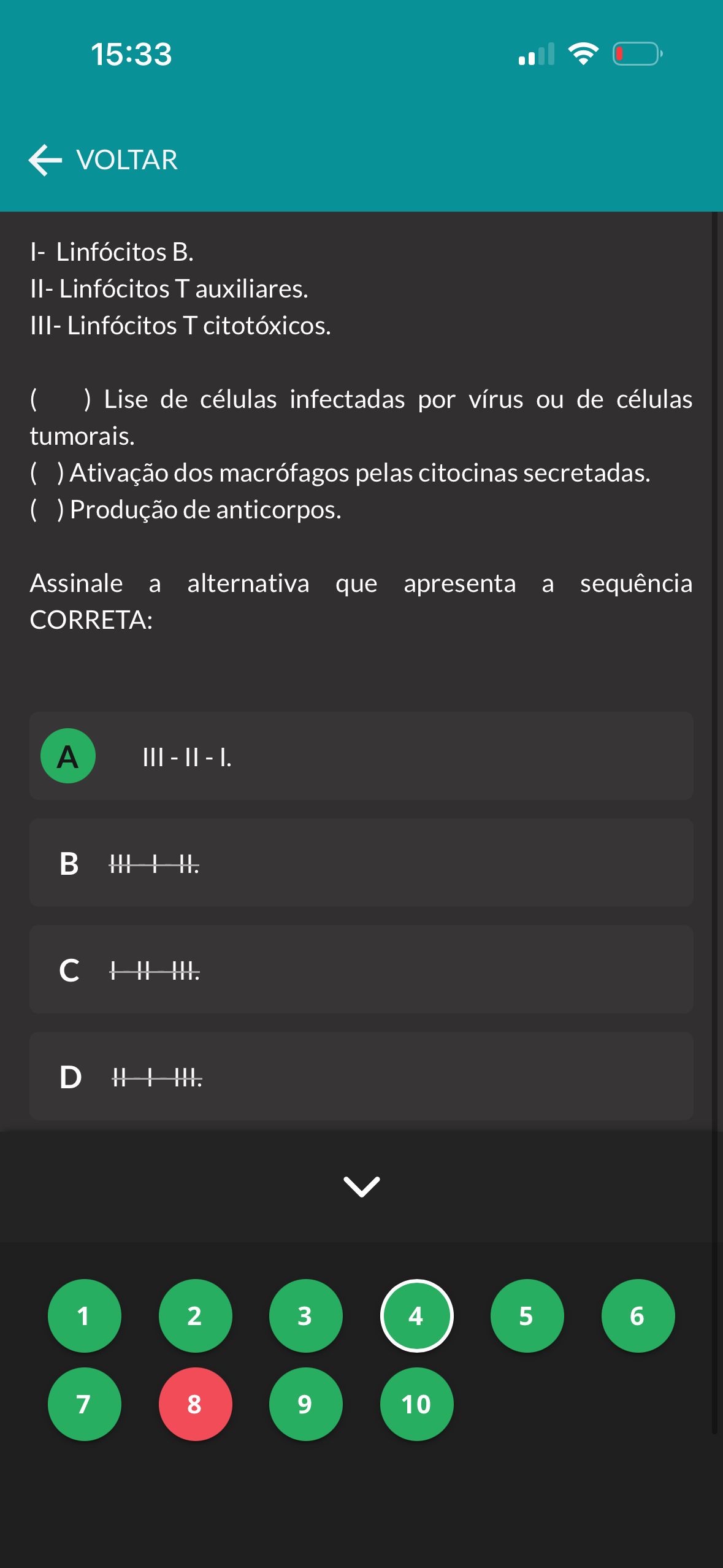 15:33 VOLTAR I- Linfócitos II- Linfócitos T auxiliares. III- Linfócitos T citotóxicos. ( ) Lise de células infectadas por vírus ou de células tumorais. Ativação dos macrófagos pelas citocinas secretadas. Produção de anticorpos. Assinale a alternativa que apresenta a sequência CORRETA: A - B c D 1 2 3 4 5 6 7 8 9 10
