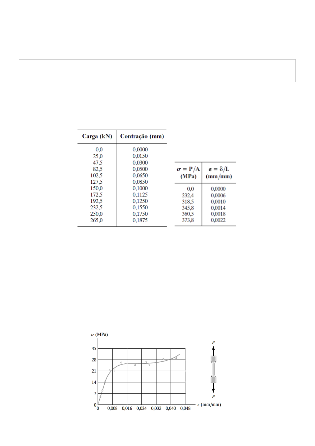 LISTA – 5 (Valor Máximo: 2,0 pontos) Disciplina: RESISTÊNCIA DOS MATERIAIS - 2301-ENGCIVIL-N09 Curso: ENGENHARIA CIVIL. Ano/Semestre: 2025/1. Professor: André L. C. da Silva/UNIGOIÁS Data de Entrega: 00/02/2026 Módulo 5 Diagrama Tensão – Deformação Conteúdo: Propriedades Mecânica dos Materiais. Ensaio de Tração-Compressão. Diagrama Tensão- deformação. Lei de Hooke. Energia de Deformação 5.1 – Um cilindro de concreto com 150 mm de diâmetro e 300 mm de comprimento de referência é testado sob compressão, Fig.5.1. Os resultados do ensaio são apresentados na tabela como carga em relação à contração. Desenhe o diagrama tensão–deformação usando escalas de 10 mm = 2 MPa e 10 mm = 0,1(10-3) mm/mm. Use o diagrama para determinar o módulo de elasticidade aproximado. Figura 5.1 – Questão 5.1 Figura 5.2 – Questão 5.2 5.2 – Os dados obtidos em um ensaio de tensão–deformação para um material cerâmico são dados na tabela, Fig.5.2. A curva é linear entre a origem e o primeiro ponto. (a) Represente o diagrama tensão-deformação e determine o módulo de elasticidade. (b) Calcule o módulo de resiliência. (c) Calcule o valor aproximado do módulo de tenacidade. A tensão de ruptura é aproximadamente r = 373,8 MPa. 5.3 – O diagrama tensão–deformação para o polietileno que é utilizado para revestir cabos coaxiais é determinado por um ensaio com um corpo de prova com comprimento de referência de 250 mm, Fig.5.3. Se uma carga P aplicada ao corpo de prova desenvolver uma deformação 0,024 mm/mm, determine o valor aproximado do comprimento do corpo de prova medido entre os pontos de referência quando a carga é removida. Considere que o corpo de prova se recupere elasticamente. Figura 5.3 – Questão 5.3 5.4 – O poste é sustentado por um pino em C e por um arame de ancoragem AB de aço A-36. Se o diâmetro do arame for 5 mm, determine quanto ele se deforma quando uma força horizontal de 15kN agir sobre o poste. Figura 5.4 – Questão 5.4 Figura 5.5 – Questão 5.5 5.5 – Os cabos de aço AB e AC sustentam a massa de 200kg, Fig.5.5. Se a tensão axial admissível para os cabos for adm = 130MPa, determine o diâmetro exigido para cada cabo. Além disso, qual é o novo comprimento do cabo AB após a aplicação da carga? Considere que o comprimento não alongado de AB seja 750 mm. Eaço = 200GPa. 5.6 – A Fig.5.6 mostra o diagrama tensão–deformação para duas barras de poliestireno. Se a área da seção transversal da barra AB for 950mm2 e a de BC for 2.500 mm2, determine a maior força P que pode ser suportada antes que qualquer dos elementos sofra ruptura. Considere que não ocorre nenhuma flambagem. Figura 5.6 – Questão 5.6 5.7 – A Fig.5.7 apresenta o diagrama tensão–deformação para uma resina de poliéster, Fig.5.7. Se a viga rígida for suportada por uma barra AB e um poste CD, ambos feitos desse material, determine a maior carga P que pode ser aplicada à viga antes da ruptura. O diâmetro da barra é 12 mm, e o diâmetro do poste é 40 mm. 5.8 – A Fig.5.8 mostra o diagrama tensão–deformação para duas barras de poliestireno. Se a área da seção transversal da barra AB for 950 mm2 e a de BC for 2500 mm2, determine a maior força P que pode ser suportada antes que qualquer dos elementos sofra ruptura. Considere que não ocorre nenhuma flambagem. Figura 5.7 – Questão 5.7 Figura 5.8 – Questão 5.8 5.9 – A Fig.5.9 apresenta o diagrama tensão–deformação para uma resina de poliéster. Se a viga rígida for suportada por uma barra AB e um poste CD, ambos feitos desse material, determine a maior carga P que pode ser aplicada à viga antes da ruptura. O diâmetro da barra é 12 mm, e o diâmetro do poste é 40 mm. Figura 5.9 – Questão 5.9. 5.10 – A viga é sustentada por um pino em C e por um cabo de ancoragem AB de aço A-36, Fig.5.10. Se o cabo tiver diâmetro de 5 mm, determine o carregamento w se a extremidade B for deslocada 18 mm para baixo. Figura 5.10 – Questão 5.10.