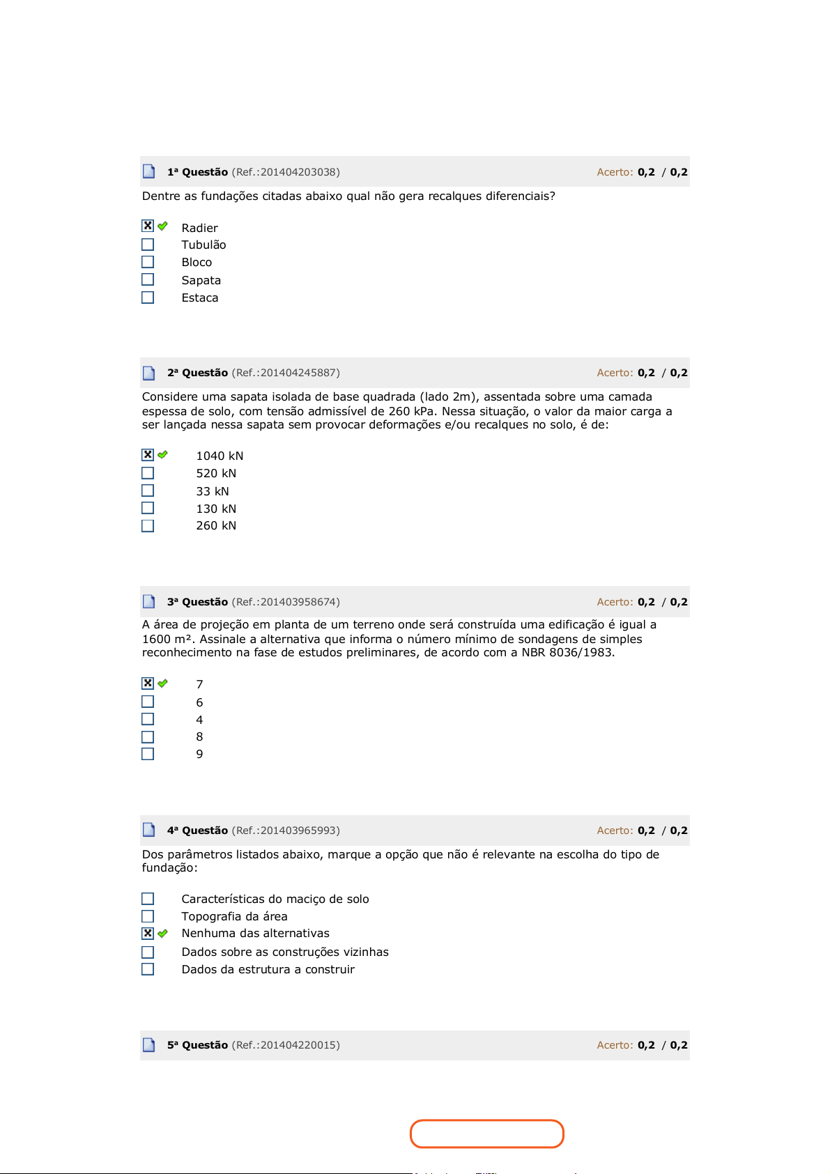Impresso por Lorrayne Crispe, E-mail lorraynecrispe@gmail.com para uso pessoal e privado. Este material pode ser protegido por direitos autorais e não pode ser reproduzido ou repassado para terceiros. 13/11/2025, 09:50:05 1a Questão (Ref.:201404203038) Acerto: 0,2 0,2 / Dentre as fundações citadas abaixo qual não gera recalques diferenciais? Radier Tubulão Bloco Sapata Estaca 2a Questão (Ref.:201404245887) Acerto: 0,2 0,2 / Considere uma sapata isolada de base quadrada (lado 2m), assentada sobre uma camada espessa de solo, com tensão admissível de 260 kPa. Nessa situação, o valor da maior carga a ser lançada nessa sapata sem provocar deformações e/ou recalques no solo, é de: 1040 kN 520 kN 33 kN 130 kN 260 kN 3a Questão (Ref.:201403958674) Acerto: 0,2 0,2 / A área de projeção em planta de um terreno onde será construída uma edificação é igual a 1600 m². Assinale a alternativa que informa o número mínimo de sondagens de simples reconhecimento na fase de estudos preliminares, de acordo com a NBR 8036/1983. 7 6 4 8 9 4a Questão (Ref.:201403965993) Acerto: 0,2 0,2 / Dos parâmetros listados abaixo, marque a opção que não é relevante na escolha do tipo de fundação: Características do maciço de solo Topografia da área Nenhuma das alternativas Dados sobre as construções vizinhas Dados da estrutura a construir 5a Questão (Ref.:201404220015) Acerto: 0,2 0,2 / Acesso vitalício + 1 ano de benefícios! Aproveitar oferta Impresso por Lorrayne Crispe, E-mail lorraynecrispe@gmail.com para uso pessoal e privado. Este material pode ser protegido por direitos autorais e não pode ser reproduzido ou repassado para terceiros. 13/11/2025, 09:50:05 Dê o nome de cada tipo de fundação superficial da figura abaixo: (A) Caixão, (B) Bloco , (C) Viga de fundação e (D) Sapata Corrida (A) Tubulão, (B) Viga de fundação , (C) Sapata Associada e (D) Sapata Corrida (A) Tubulão, (B) Sapata , (C) Grelha e (D) Radier (A) Bloco, (B) Sapata, (C) Grelha e (D) Radier (A) Bloco, (B) Sapata, (C) Sapata corrida e (D) Caixão 6a Questão (Ref.:201404220055) Acerto: 0,2 0,2 / De acordo com a norma NBR 8036 (1983), as sondagens devem ser, no mínimo, uma para cada 200m de área de projeção em planta do edifício até 2 1200m2 de área. Qual a quantidade de furos de sondagem você recomenda para serem executados na área de projeção de um edifício mostrada abaixo? Acesso vitalício + 1 ano de benefícios! Aproveitar oferta Impresso por Lorrayne Crispe, E-mail lorraynecrispe@gmail.com para uso pessoal e privado. Este material pode ser protegido por direitos autorais e não pode ser reproduzido ou repassado para terceiros. 13/11/2025, 09:50:05 1 Furo de sondagem 15 Furos de sondagens 10 Furos de sondagens 4 Furos de sondagens 5 Furos de sondagens 7a Questão (Ref.:201403273336) Acerto: 0,2 0,2 / De um modo geral os tipos de exploração de sub-solo (sondagens), mais comumente utilizados Entre nós, são (Assinale a única alternativa completa): Simples reconhecimento e colheita de amostras indeformadas; Nenhum dos itens Simples reconhecimento, colheita de amostras indeformadas e especiais; Colheitas de amostras indeformadas e especiais. Simples reconhecimento e especiais; 8a Questão (Ref.:201403273381) Acerto: 0,2 0,2 / Acesso vitalício + 1 ano de benefícios! Aproveitar oferta Impresso por Lorrayne Crispe, E-mail lorraynecrispe@gmail.com para uso pessoal e privado. Este material pode ser protegido por direitos autorais e não pode ser reproduzido ou repassado para terceiros. 13/11/2025, 09:50:05 Num programa de sondagens, o número de furos deve ser determinado conforme a área em planta de um edifício da segunte forma: no mínimo 5, de 200 a 400 m2 no mínimo 6, de 400 a 600 m2 No mínimo 4 até 200 m2 3 para cada 400 m2, de 1200 a 2400 m2 mínimo de 2 até 200 m2; adicionar 1 para cada 200 m , até 1200 m2 2 9a Questão (Ref.:201404200928) Acerto: 0,2 0,2 / Ao se construir um edifício, os seus pilares foram posicionados junto à divisa do terreno, o que impossibilitou que o centro de carga dos pilares fosse coincidente com o centro de gravidade das sapatas que constituem a fundação, ou seja, resultou em uma sapata excêntrica em relação ao pilar. Para garantir a estabilidade do conjunto estrutural, foi necessária a adoção de: sapatas assimétricas. vigas baldrame. sapatas associadas. vigas alavanca. sapatas corridas. 10a Questão (Ref.:201403273410) Acerto: 0,2 0,2 / Recalques diferenciais entre pilares vizinhos podem causar trincam as alvenarias de forma: inclinadas verticais verticais e inclinadas horizontais e inclinadas horizontais Acesso vitalício + 1 ano de benefícios! Aproveitar oferta Acesso vitalício + 1 ano de benefícios! Aproveitar oferta