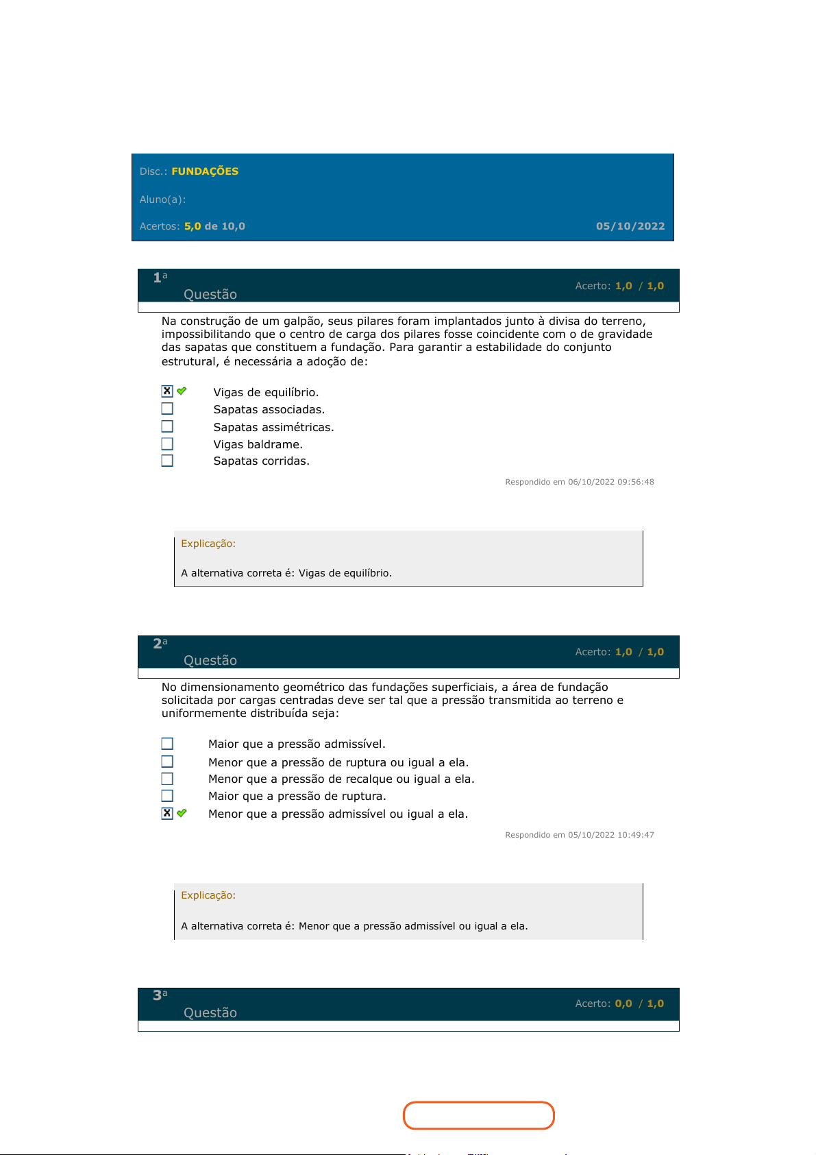 Impresso por Lorrayne Crispe, E-mail lorraynecrispe@gmail.com para uso pessoal e privado. Este material pode ser protegido por direitos autorais e não pode ser reproduzido ou repassado para terceiros. 13/11/2025, 09:42:23 Disc.: FUNDAÇÕES Aluno(a): Acertos: 5,0 de 10,0 05/10/2022 1a Questão Acerto: 1,0 / 1,0 Na construção de um galpão, seus pilares foram implantados junto à divisa do terreno, impossibilitando que o centro de carga dos pilares fosse coincidente com o de gravidade das sapatas que constituem a fundação. Para garantir a estabilidade do conjunto estrutural, é necessária a adoção de: Vigas de equilíbrio. Sapatas associadas. Sapatas assimétricas. Vigas baldrame. Sapatas corridas. Respondido em 06/10/2022 09:56:48 Explicação: A alternativa correta é: Vigas de equilíbrio. 2a Questão Acerto: 1,0 / 1,0 No dimensionamento geométrico das fundações superficiais, a área de fundação solicitada por cargas centradas deve ser tal que a pressão transmitida ao terreno e uniformemente distribuída seja: Maior que a pressão admissível. Menor que a pressão de ruptura ou igual a ela. Menor que a pressão de recalque ou igual a ela. Maior que a pressão de ruptura. Menor que a pressão admissível ou igual a ela. Respondido em 05/10/2022 10:49:47 Explicação: A alternativa correta é: Menor que a pressão admissível ou igual a ela. 3a Questão Acerto: 0,0 / 1,0 Acesso vitalício + 1 ano de benefícios! Aproveitar oferta Impresso por Lorrayne Crispe, E-mail lorraynecrispe@gmail.com para uso pessoal e privado. Este material pode ser protegido por direitos autorais e não pode ser reproduzido ou repassado para terceiros. 13/11/2025, 09:42:23 Considerando a relação interação solo-fundação, dada uma sapata de fundação superficial para um pilar com seção transversal , que transfere à 40×40cm40×40cm sapata uma carga vertical de , sendo a tensão de ruptura do solo igual 400kN400kN à . Pode-se afirmar que, 0,30MPa0,30MPa A sapata possui uma área de e funcionará como uma sapata 5m25m2 rígida se for quadrada com altura maior que . 60cm60cm A sapata possui uma área de e funcionará como uma sapata 4m24m2 rígida se for quadrada com altura maior que . 60cm60cm A sapata possui uma área de e funcionará como uma sapata 4m24m2 rígida se for quadrada com altura maior que . 45cm45cm A sapata possui uma área de e funcionará como uma sapata 4,5m24,5m2 rígida se for quadrada com altura maior que . 55cm55cm A sapata possui uma área de e funcionará como uma sapata 4m24m2 rígida se for quadrada com altura maior que . 40cm40cm Respondido em 28/10/2022 15:29:51 Explicação: Gabarito: A sapata possui uma área de e funcionará como uma sapata rígida se 4m24m2 for quadrada com altura maior que . 60cm60cm Justificativa: Primeiro deve-se encontrar a tensão admissível do solo, σadm=σultFS→σ →σadm=3003 adm=100kPaσadm=σultFS→ →σadm=3003 σadm=100kPa Cálculo da Área: σadm=PA→100=400A→A m=4 2σadm=PA→ →100=400A A=4m2 Cálculo da Altura: h≥(a a− p)3h≥(a−ap)3 h≥(2−0,30)3h≥(2−0,30)3 h m≥0,56 h≥0,56m 4a Questão Acerto: 0,0 / 1,0 Sobre como ocorrem a interação solo-fundação marque a alternativa que preencha corretamente às lacunas da afirmativa a abaixo: Um dos fatores que influenciam a interação _______________ é como ocorrem as _______________ entre os elementos. Um dos aspectos que afetam as _______________ é a _______________. Segundo a _______________, as pressões nos bordos de uma _______________ são (teoricamente) _______________. Solo-estrutura. Pressões de Contato. Pressões de Contato. Intensidade das Cargas. Teoria da Elasticidade. Sapata Rígida. Finitas. Acesso vitalício + 1 ano de benefícios! Aproveitar oferta Impresso por Lorrayne Crispe, E-mail lorraynecrispe@gmail.com para uso pessoal e privado. Este material pode ser protegido por direitos autorais e não pode ser reproduzido ou repassado para terceiros. 13/11/2025, 09:42:23 Solo-estrutura. Pressões de Bordo. Pressões de Bordo. Intensidade das Cargas. Teoria da Elasticidade. Sapata Flexível. Infinitas. Solo-estrutura. Pressões de Contato. Pressões de Contato. Intensidade das Cargas. Teoria da Elasticidade. Sapata Rígida. Infinitas. Solo-estrutura. Pressões de Contato. Pressões de Contato. Intensidade das Cargas. Teoria da Relatividade. Sapata Rígida. Finitas. Solo-solo. Pressões de Contato. Pressões de Bordo. Propriedades do Solo. Teoria da Elasticidade. Sapata Rígida. Infinitas. Respondido em 28/10/2022 15:31:48 Explicação: Gabarito: Solo-estrutura. Pressões de Contato. Pressões de Contato. Intensidade das Cargas. Teoria da Elasticidade. Sapata Rígida. Infinitas. Justificativa: Única possibilidade para a afirmativa levando-se em conta a distribuição das tensões e pressão de contato: Um dos fatores que influenciam a interação Solo-estrutura é como ocorrem as Pressões de Contato entre os elementos. Um dos aspectos que afetam as Pressões de Contato é a Intensidade das Cargas. Segundo a Teoria da Elasticidade, as pressões nos bordos de uma Sapata Rígida são (teoricamente) infinitas. 5a Questão Acerto: 1,0 / 1,0 Ao se abordar o tema de fundações, é importante ressaltar as propriedades dos materiais que serão utilizados para a construção, além das características do solo de apoio. Na literatura existe a descrição de alguns métodos de cálculo de fundação do tipo radier. Diante disso, avalie os métodos abaixo e marque (V) para verdadeiro ou (F) para falso sobre as afirmações abaixo: I. Método Estático: Semelhante as vigas de fundação, os esforços internos em radiers podem ser calculados pelos chamados métodos estáticos, que se baseiam em alguma hipótese sobre a distribuição das pressões de contato. II. Cálculo como um sistema de vigas sobre base elástica: Para o caso do sistema de vigas sobre base elástica, deve-se separar o radier em dois sistemas de faixas. Na sequência cada faixa dever
