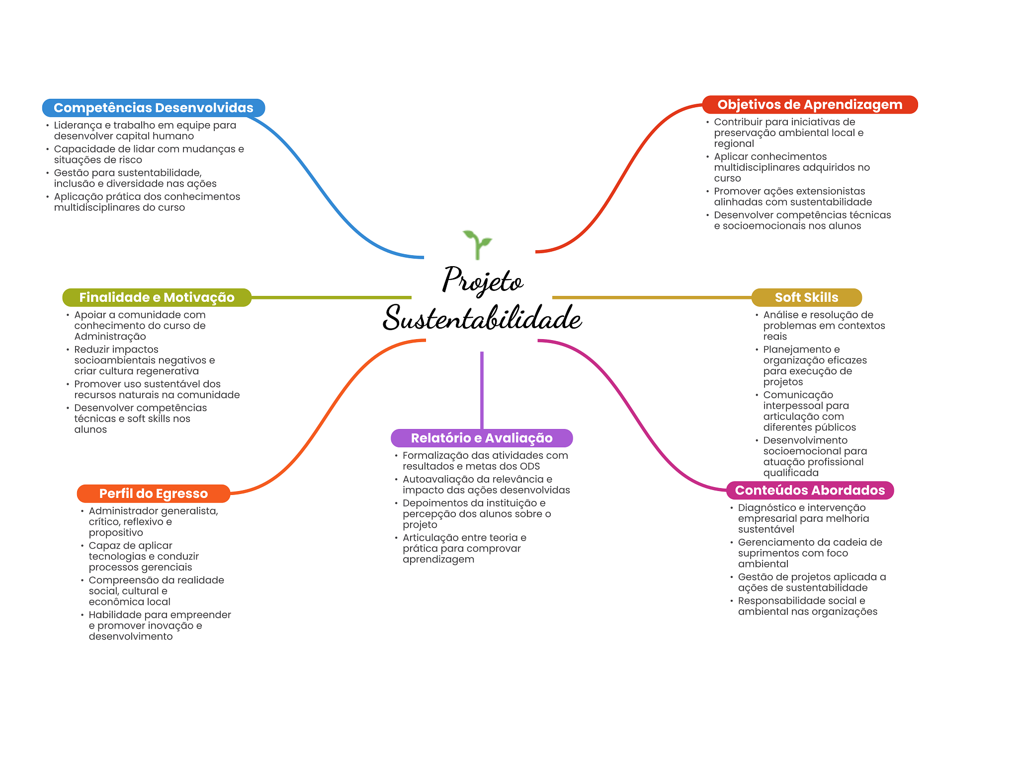 Competências Desenvolvidas Objetivos de Aprendizagem Liderança e trabalho em equipe para Contribuir para iniciativas de desenvolver capital humano preservação ambiental local e Capacidade de lidar com mudanças e regional situações de risco Aplicar conhecimentos Gestão para sustentabilidade, multidisciplinares adquiridos no curso inclusão e diversidade nas ações Aplicação prática dos conhecimentos Promover ações extensionistas alinhadas com sustentabilidade multidisciplinares do curso Desenvolver competências técnicas e socioemocionais nos alunos Projeto Finalidade e Motivação Soft Skills Apoiar a comunidade com Sustentabilidade Análise e resolução de conhecimento do curso de problemas em contextos Administração reais Reduzir impactos Planejamento e socioambientais negativos e organização eficazes criar cultura regenerativa para execução de Promover uso sustentável dos projetos recursos naturais na comunidade Comunicação Desenvolver competências interpessoal para técnicas e soft skills nos articulação com alunos diferentes públicos Relatório e Avaliação Desenvolvimento Formalização das atividades com socioemocional para resultados e metas dos ODS atuação profissional qualificada Autoavaliação da relevância e Perfil do Egresso impacto das ações desenvolvidas Conteúdos Abordados Depoimentos da instituição e Administrador generalista, Diagnóstico e intervenção percepção dos alunos sobre crítico, reflexivo e empresarial para melhoria projeto propositivo sustentável Articulação entre teoria e Capaz de aplicar Gerenciamento da cadeia de prática para comprovar tecnologias e conduzir suprimentos com foco aprendizagem processos gerenciais ambiental Compreensão da realidade Gestão de projetos aplicada a social, cultural e ações de sustentabilidade econômica local Responsabilidade social e Habilidade para empreender ambiental nas organizações e promover inovação e desenvolvimento
