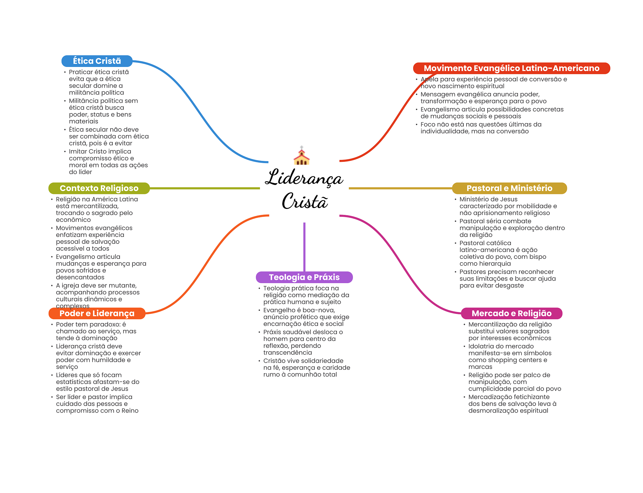 Ética Cristã Praticar ética cristã Movimento Evangélico evita que a ética Apela para experiência pessoal de conversão e secular domine a novo nascimento espiritual militância política Mensagem evangélica anuncia poder, Militância política sem transformação e esperança para povo ética cristã busca Evangelismo articula possibilidades concretas poder, status e bens de mudanças sociais e pessoais materiais Foco não está nas questões últimas da Ética secular não deve individualidade, mas na conversão ser combinada com ética cristã, pois é a evitar Imitar Cristo implica compromisso ético e moral em todas as ações do líder Liderança Contexto Religioso Pastoral e Ministério Religião na América Latina Cristã Ministério de Jesus está mercantilizada, caracterizado por mobilidade e trocando sagrado pelo não aprisionamento religioso econômico Pastoral séria combate Movimentos evangélicos manipulação e exploração dentro enfatizam experiência da religião pessoal de salvação Pastoral católica acessível a todos latino-americana é ação Evangelismo articula coletiva do povo, com bispo mudanças e esperança para como hierarquia povos sofridos e Pastores precisam reconhecer desencantados Teologia e Práxis suas limitações e buscar ajuda A igreja deve ser mutante, Teologia prática foca na para evitar desgaste acompanhando processos religião como mediação da culturais dinâmicos e prática humana e sujeito complexos Poder e Liderança Evangelho é boa-nova, anúncio profético que exige Mercado e Religião Poder tem paradoxo: é encarnação ética e social Mercantilização da religião chamado ao serviço, mas Práxis saudável desloca substitui valores sagrados tende à dominação homem para centro da por interesses econômicos Liderança cristã deve reflexão, perdendo Idolatria do mercado evitar dominação e exercer transcendência manifesta-se em símbolos poder com humildade e Cristão vive solidariedade como shopping centers e serviço na fé, esperança e caridade marcas Líderes que só focam rumo à comunhão total Religião pode ser palco de estatísticas afastam-se do manipulação, com estilo pastoral de Jesus cumplicidade parcial do povo Ser líder e pastor implica Mercadização fetichizante cuidado das pessoas e dos bens de salvação leva à compromisso com Reino desmoralização espiritual
