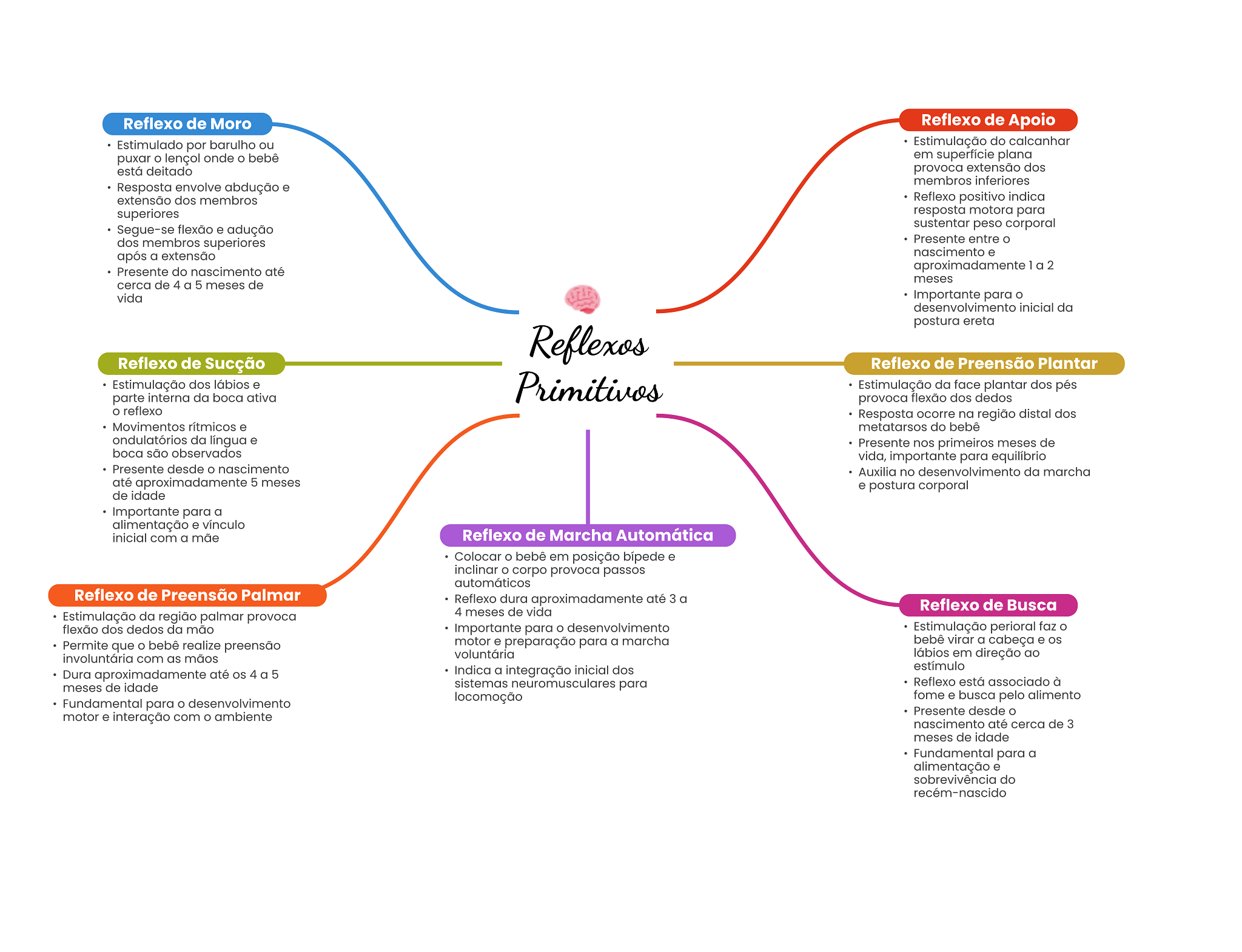 Reflexo de Moro Reflexo de Apoio Estimulado por barulho ou Estimulação do calcanhar puxar lençol onde bebê em superfície plana está deitado provoca extensão dos membros inferiores Resposta envolve abdução e extensão dos membros Reflexo positivo indica superiores resposta motora para Segue-se flexão e adução sustentar peso corporal dos membros superiores Presente entre após a extensão nascimento e Presente do nascimento até aproximadamente 1 a 2 meses cerca de 4 a 5 meses de vida Importante para desenvolvimento inicial da postura ereta Reflexos Reflexo de Sucção Reflexo de Preensão Plantar Estimulação dos lábios e Primitivos Estimulação da face plantar dos pés parte interna da boca ativa provoca flexão dos dedos reflexo Resposta ocorre na região distal dos Movimentos rítmicos e metatarsos do bebê ondulatórios da língua e Presente nos primeiros meses de boca são observados vida, importante para equilíbrio Presente desde nascimento Auxilia no desenvolvimento da marcha até aproximadamente 5 meses e postura corporal de idade Importante para a alimentação e vínculo inicial com a mãe Reflexo de Marcha Automática Colocar O bebê em posição bípede e inclinar corpo provoca passos automáticos Reflexo de Preensão Palmar Reflexo dura aproximadamente até 3 a Reflexo de Busca Estimulação da região palmar provoca 4 meses de vida flexão dos dedos da mão Importante para desenvolvimento Estimulação perioral faz Permite que bebê realize preensão motor e preparação para a marcha bebê virar a cabeça e involuntária com as mãos voluntária lábios em direção ao Indica a integração inicial dos estímulo Dura aproximadamente até OS 4 a 5 meses de idade sistemas neuromusculares para Reflexo está associado à Fundamental para desenvolvimento locomoção fome e busca pelo alimento Presente desde motor e interação com ambiente nascimento até cerca de 3 meses de idade Fundamental para a alimentação e sobrevivência do recém-nascido