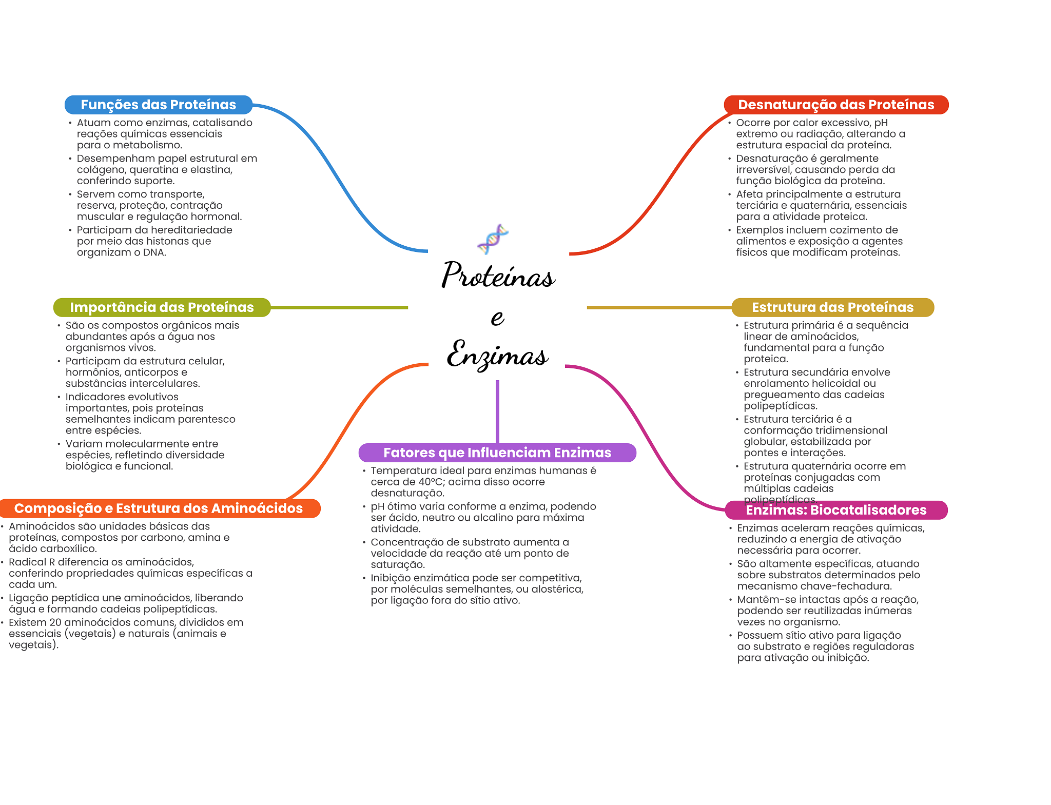 Funções das Proteínas Desnaturação das Proteínas Atuam como enzimas, catalisando Ocorre por calor excessivo, pH reações químicas essenciais extremo ou radiação, alterando a para metabolismo. estrutura espacial da proteína. Desempenham papel estrutural em Desnaturação é geralmente colágeno, queratina e elastina, irreversível, causando perda da conferindo suporte. função biológica da proteína. Servem como transporte, Afeta principalmente a estrutura reserva, proteção, contração terciária e quaternária, essenciais muscular e regulação hormonal. para a atividade proteica. Participam da hereditariedade Exemplos incluem cozimento de por meio das histonas que alimentos e exposição a agentes organizam DNA. físicos que modificam proteínas. Proteínas Importância das Proteínas Estrutura das Proteínas e São compostos orgânicos mais Estrutura primária é a sequência abundantes após a água nos linear de aminoácidos, organismos vivos. Enzimas fundamental para a função Participam da estrutura celular, proteica. hormônios, anticorpos e Estrutura secundária envolve substâncias intercelulares. enrolamento helicoidal ou Indicadores evolutivos pregueamento das cadeias importantes, pois proteínas polipeptídicas. semelhantes indicam parentesco Estrutura terciária é a entre espécies. conformação tridimensional Variam molecularmente entre globular, estabilizada por espécies, refletindo diversidade Fatores que Influenciam Enzimas pontes e interações. biológica e funcional. Temperatura ideal para enzimas humanas é Estrutura quaternária ocorre em cerca de 40°C; acima disso ocorre proteínas conjugadas com desnaturação. múltiplas cadeias polipeptídicas Composição e Estrutura dos Aminoácidos pH ótimo varia conforme a enzima, podendo Enzimas: Biocatalisadores ser ácido, neutro ou alcalino para máxima Aminoácidos são unidades básicas das atividade. Enzimas aceleram reações químicas, proteínas, compostos por carbono, amina e Concentração de substrato aumenta a reduzindo a energia de ativação ácido carboxílico. velocidade da reação até um ponto de necessária para ocorrer. Radical R diferencia os aminoácidos, saturação. São altamente específicas, atuando conferindo propriedades químicas específicas a Inibição enzimática pode ser competitiva, sobre substratos determinados pelo cada um. por moléculas semelhantes, ou alostérica, mecanismo chave-fechadura Ligação peptídica une aminoácidos, liberando por ligação fora do sítio ativo. Mantêm-se intactas após a reação, água e formando cadeias polipeptídicas. podendo ser reutilizadas inúmeras Existem 20 aminoácidos comuns, divididos em vezes no organismo. essenciais (vegetais) e naturais (animais e Possuem sítio ativo para ligação vegetais). ao substrato e regiões reguladoras para ativação ou inibição.