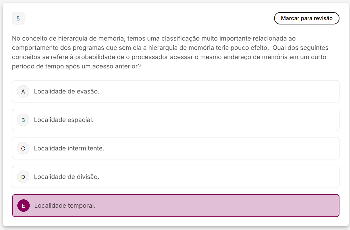 5 Marcar para revisão No conceito de hierarquia de memória, temos uma classificação muito importante relacionada ao comportamento dos programas que sem ela a hierarquia de memória teria pouco efeito. Qual dos seguintes conceitos se refere à probabilidade de O processador acessar mesmo endereço de memória em um curto período de tempo após um acesso anterior? A Localidade de evasão. B Localidade espacial. C Localidade intermitente. D Localidade de divisão. E Localidade temporal.