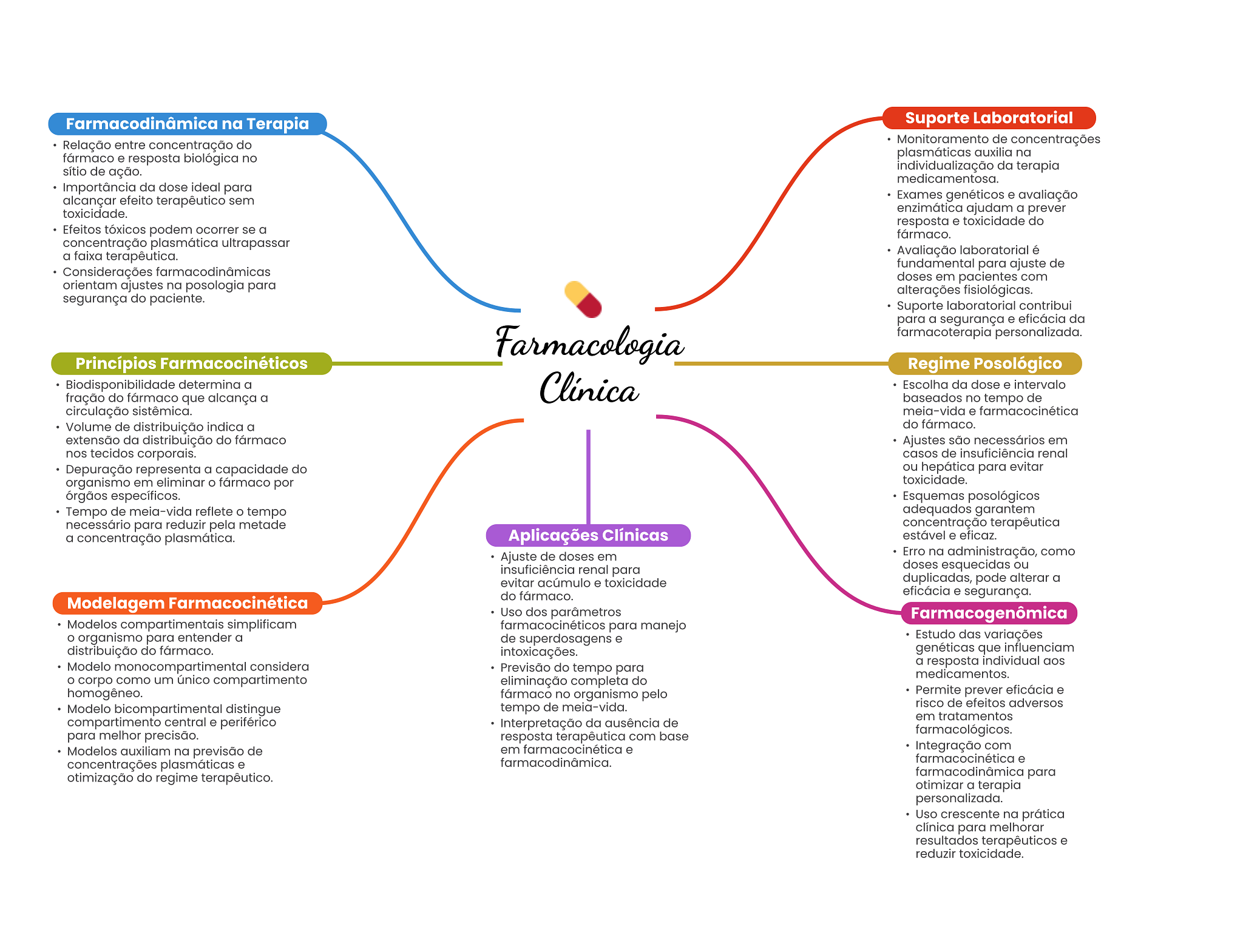 Farmacodinâmica na Terapia Suporte Laboratorial Relação entre concentração do Monitoramento de concentrações fármaco e resposta biológica no plasmáticas auxilia na sítio de ação. individualização da terapia medicamentosa. Importância da dose ideal para alcançar efeito terapêutico sem Exames genéticos e avaliação toxicidade. enzimática ajudam a prever resposta e toxicidade do Efeitos tóxicos podem ocorrer se a fármaco. concentração plasmática ultrapassar a faixa terapêutica. Avaliação laboratorial é fundamental para ajuste de Considerações farmacodinâmicas doses em pacientes com orientam ajustes na posologia para alterações fisiológicas. segurança do paciente. Suporte laboratorial contribui para a segurança e eficácia da Farmacologia farmacoterapia personalizada. Princípios Farmacocinéticos Regime Posológico Biodisponibilidade determina a fração do fármaco que alcança a Clínica Escolha da dose e intervalo baseados no tempo de circulação sistêmica. meia-vida e farmacocinética Volume de distribuição indica a do fármaco. extensão da distribuição do fármaco Ajustes são necessários em nos tecidos corporais. casos de insuficiência renal Depuração representa a capacidade do ou hepática para evitar organismo em eliminar fármaco por toxicidade. órgãos específicos. Esquemas posológicos Tempo de meia-vida reflete tempo adequados garantem necessário para reduzir pela metade concentração terapêutica a concentração plasmática. Aplicações Clínicas estável e eficaz. Ajuste de doses em Erro na administração, como insuficiência renal para doses esquecidas ou evitar acúmulo e toxicidade duplicadas, pode alterar a do fármaco. eficácia e segurança. Modelagem Farmacocinética Uso dos parâmetros Farmacogenômica Modelos compartimentais simplificam farmacocinéticos para manejo organismo para entender a de superdosagens e Estudo das variações distribuição do fármaco. intoxicações. genéticas que influenciam Modelo monocompartimental considera Previsão do tempo para a resposta individual aos medicamentos. corpo como um único compartimento eliminação completa do homogêneo. fármaco no organismo pelo Permite prever eficácia e Modelo bicompartimental distingue tempo de meia-vida. risco de efeitos adversos em tratamentos compartimento central e periférico Interpretação da ausência de para melhor precisão. resposta terapêutica com base farmacológicos. Modelos auxiliam na previsão de em farmacocinética e Integração com concentrações plasmáticas e farmacodinâmica. farmacocinética e otimização do regime terapêutico. para otimizar a terapia personalizada. Uso crescente na prática clínica para melhorar resultados terapêuticos e reduzir toxicidade.
