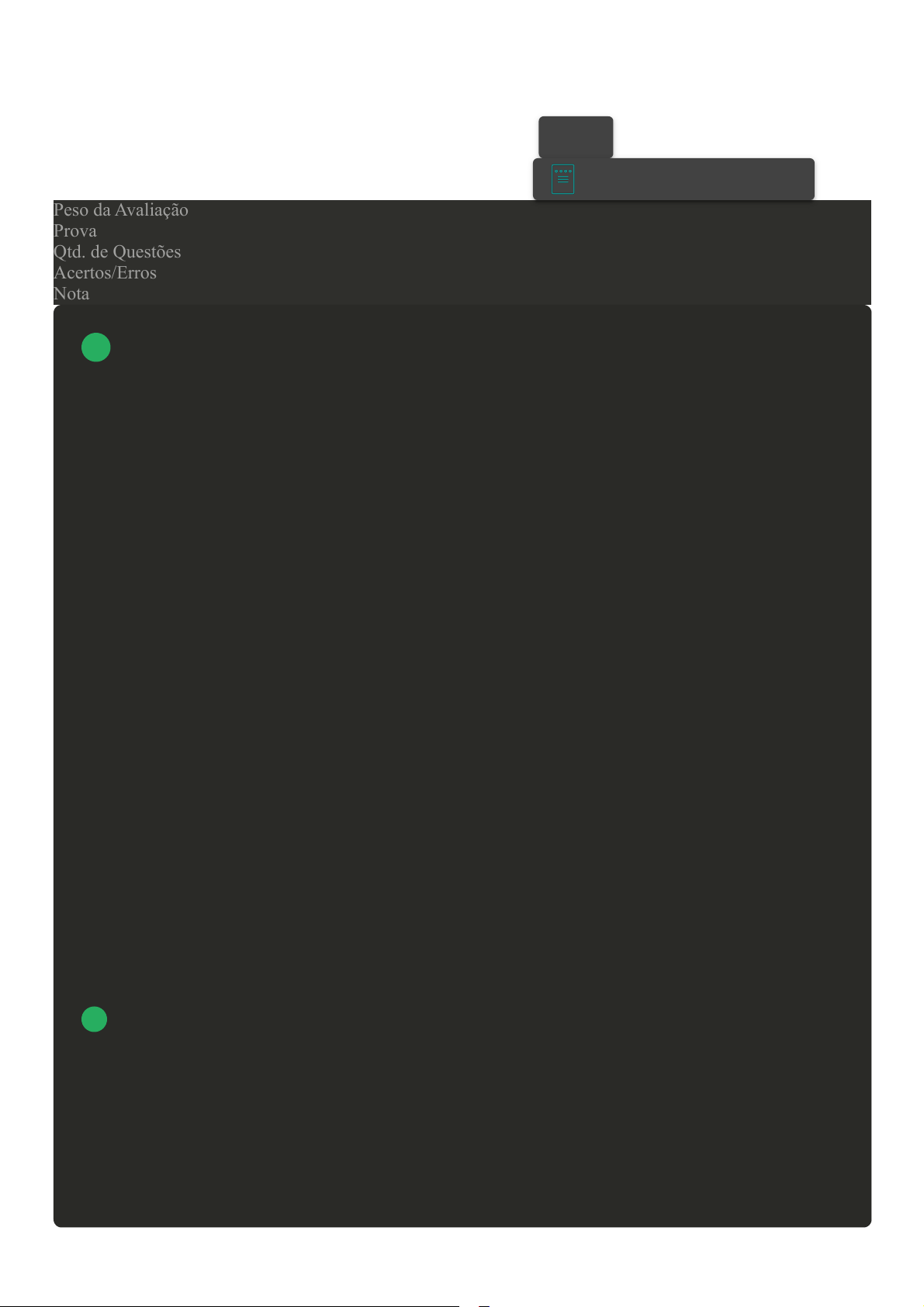Prova Impressa GABARITO | Avaliação Final (Objetiva) - Individual (Cod.:1024963) Peso da Avaliação 4,00 Prova 101319926 Qtd. de Questões 10 Acertos/Erros 8/2 Nota 8,00 A avaliação do equilíbrio ácido-base apresenta relevância na rotina clínica, pois os dados gerados fornecem informações importantes sobre a função respiratória e a perfusão tecidual do indivíduo. Sobre os gases sanguíneos e sua relação no equilíbrio ácido-base, analise as sentenças a seguir: I- O aumento da concentração de íon H+ no sangue é caracterizado como um quadro de alcalose. II- O pH, quando abaixo do valor de referência, indica uma acidose. III- A gasometria é um exame que fornece informações importantes sobre a função respiratória e a perfusão tecidual do indivíduo. IV- No exame de gasometria é possível verificar apenas as quantidades de oxigênio, gás carbônico e alterações de pH. Assinale a alternativa CORRETA: A I e IV, apenas. B I, II e III, apenas. C II e III, apenas. D III e IV, apenas. E I, III e IV, apenas. VOLTAR A+ Alterar modo de visualização 1 O osso exerce funções importantes no corpo, como locomoção, suporte e proteção dos tecidos moles, armazenamento de cálcio e fosfato e também abriga a medula óssea. Apesar de sua aparência inerte, o osso é um órgão altamente dinâmico que é continuamente reabsorvido pelos osteoclastos e neoformado pelos osteoblastos. Com relação ao metabolismo ósseo, avalie as asserções a seguir e a relação proposta entre elas: I- O cálcio sérico pode ser encontrado sob três formas distintas: cálcio ionizado, cálcio complexado e cálcio ligado a proteínas plasmáticas. PORQUE II- As causas mais comuns de hipercalcemia são o hiperparatireoidismo primário e os neoplasmas malignos. Assinale a alternativa CORRETA: A As asserções I e II são verdadeiras, e a II é uma justificativa correta da I. B As asserções I e II são verdadeiras, mas a II não é uma justificativa correta da I. C As asserções I e II são falsas. D A asserção I é uma proposição verdadeira e a II é uma proposição falsa. E A asserção I é uma proposição falsa e a II é uma proposição verdadeira. As lesões que acometem o fígado normalmente respondem com uma lesão que não apresenta sintomas, ou que por muitas vezes pode levar à icterícia. Sobre o metabolismo e as lesões hepáticas, analise as sentenças a seguir: I- O principal pigmento biliar é a bilirrubina, produto do catabolismo da fração heme da hemoglobina e de outras hemoproteínas. II- Icterícia, que se caracteriza por coloração amarelada da pele, escleras e mucosas, resulta da deposição de bilirrubina nesses locais. 2 3 III- Para ser transportada pelo sangue é necessário ter a bilirrubina ligada à albumina, uma proteína solúvel em água. IV- As anemias hemolíticas são as únicas causas clínicas capazes de gerar icterícia no paciente. Assinale a alternativa CORRETA: A I, III e IV, apenas. B II e III, apenas. C III e IV, apenas. D I e IV, apenas. E I, II e III, apenas. [Laboratório Virtual - Dosagem de Bilirrubina] Um teste de bilirrubina mede os níveis de bilirrubina no sangue. A bilirrubina é o pigmento amarelo da bile. O paciente pode ter altos níveis de bilirrubina se o fígado estiver com problemas para processar a bilirrubina na bile, ou ainda se os ductos biliares estiverem bloqueados. Com relação às observações feitas no experimento de dosagem de bilirrubinas, assinale a alternativa CORRETA: A A bilirrubina direta é a única fração excretada pelos rins em caso de aumento sérico. B A bilirrubina indireta é solúvel em sistemas aquosos. C A bilirrubina total leva em consideração tanto frações conjugadas como não conjugadas ao ácido glicurônico. D A bilirrubina conjugada é excretada do pâncreas para o intestino grosso no processo de eliminação desta substância. 4 E A bilirrubina indireta é conjugada ao ácido glicurônico. [Laboratório Virtual - Triglicerídeos] Lipoproteína é qualquer membro de um grupo de substâncias contendo lipídeos (gordura) e proteínas. Eles ocorrem tanto em complexos solúveis – como na gema de ovo e no plasma sanguíneo de mamíferos – quanto em complexos insolúveis – como nas membranas celulares. Com relação às observações feitas no experimento de triglicerídeos, assinale a alternativa CORRETA: A As frações LDL de colesterol apresentam baixo risco para formação de placas de ateroma justamente pela sua baixa concentração de triglicerídeos. B As frações de colesterol VLDL possuem maior concentração de triglicerídeos quando comparadas às frações de colesterol HDL. C As frações de colesterol HDL apresentam baixa densidade, pois têm em sua composição grandes quantidades de triglicerídeos. D Os quilomícrons são as lipoproteínas com maior concentração relativa de colesterol. E As frações de colesterol HDL são responsáveis pelo transporte de triglicerídeos da dieta para os tecidos periféricos. Diversos marcadores tumorais estão em uso para uma ampla variedade de tipos de câncer, são considerados úteis, de acordo com os critérios, na avaliação, diagnóstico, prognóstico, monitoramento e acompanhamento. Auxiliam principalmente na distinção entre os diferentes tipos de câncer. Sobre marcadores tumorais, avalie as asserções a seguir e a relação proposta entre elas: I- O antígeno carcinoembrionário (CEA) pode ser utilizado como um marcador tumoral. PORQUE II- Elevação dos seus níveis séricos são úteis no monitoramento e acompanhamento de tumores de próstata. 5 6 Assinale a alternativa CORRETA: A A asserção I é uma proposição falsa e a II é uma proposição verdadeira. B A asserção I é uma proposição verdadeira e a II é uma proposição falsa. C As asserções I e II são verdadeiras, mas a II não é uma justificativa correta da I. D As asserções I e II são verdadeiras, e a II é uma justificativa correta da I. E
