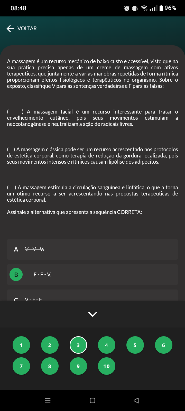 08:48 96% VOLTAR A massagem é um recurso mecânico de baixo custo e acessível, visto que na sua prática precisa apenas de um creme de massagem com ativos terapêuticos, que juntamente a várias manobras repetidas de forma rítmica proporcionam efeitos fisiológicos e terapêuticos no organismo. Sobre exposto, classifique V para as sentenças verdadeiras e F para as falsas: ( ) A massagem facial é um recurso interessante para tratar envelhecimento cutâneo, pois seus movimentos estimulam a neocolanogênese e neutralizam a ação de radicais livres. A massagem clássica pode ser um recurso acrescentado nos protocolos de estética corporal, como terapia de redução da gordura localizada, pois seus movimentos intensos e rítmicos causam lipólise dos adipócitos. A massagem estimula a circulação sanguínea e linfática, que a torna um ótimo recurso a ser acrescentando nas propostas terapêuticas de estética corporal. Assinale a alternativa que apresenta a sequência CORRETA: A V-V-V. F-F-V. 1 2 3 4 5 6 7 8 9 10