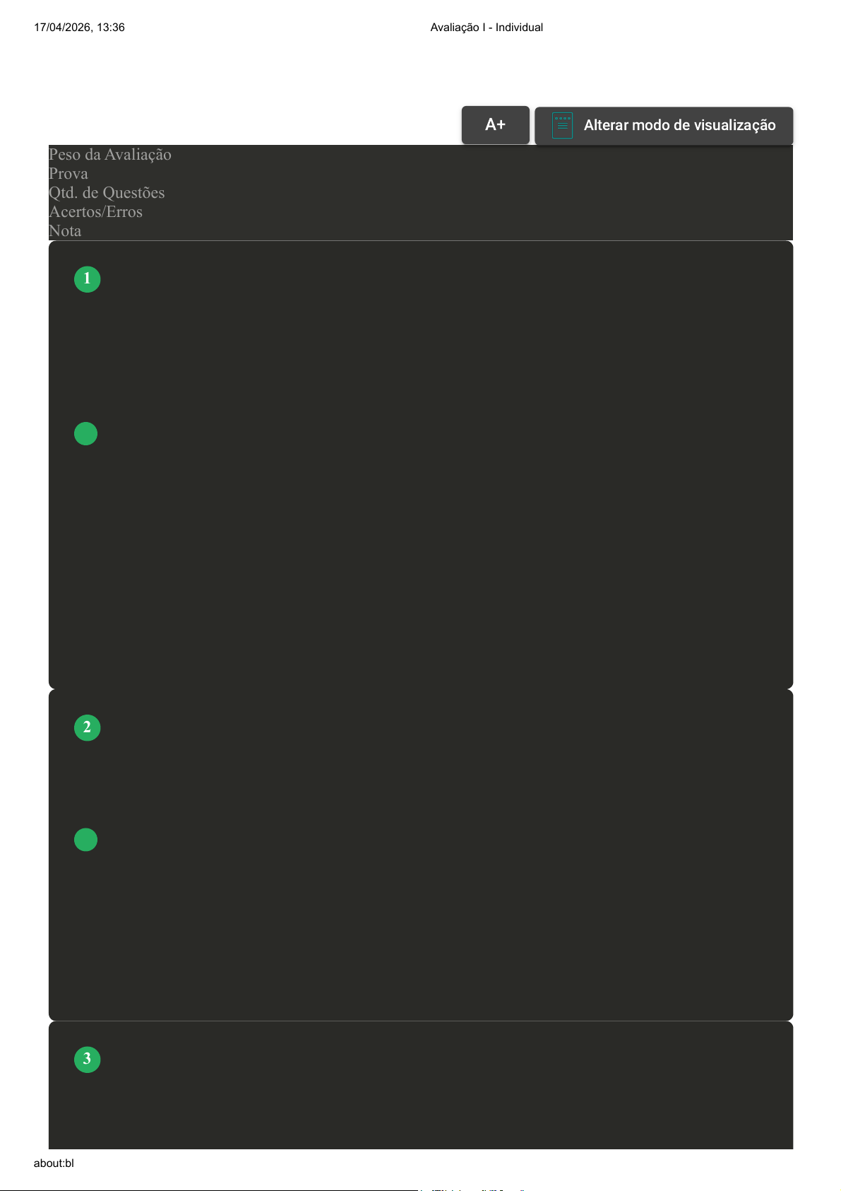 Prova Impressa GABARITO | Avaliação I - Individual (Cod.:738526) Peso da Avaliação 1,50 Prova 48598418 Qtd. de Questões 10 Acertos/Erros 10/0 Nota 10,00 Todo o processo de reparação tecidual causa o aparecimento de cinco sinais cardeais que podem variar com o tamanho e profundidade da lesão. Quais são esses sinais? A Rubor; calor; edema (tumor); dor; perda ou limitação funcional. B Rubor; frioin; edema (tumor); dor; perda ou limitação funcional. C Falta de coloração; frio; edema (tumor); dor; perda ou limitação funcional. D Rubor; calor; edema (tumor); insensibilidade; perda ou limitação funcional. Os órgãos são formados por diferentes tipos de tecidos para realizar uma função específica no corpo humano. A união de diferentes órgãos forma um sistema. O organismo é formado por diferentes níveis de organização, desde o celular ao sistêmico, no entanto, é constituído por quatro principais compostos químicos. Assinale a alternativa CORRETA que apresenta os quatro principais compostos químicos no corpo humano: A Oxigênio, hidrogênio, nitrogênio e carbono. B Sódio, potássio, nitrogênio e carbono. C Oxigênio, cálcio, nitrogênio e fósforo. D Oxigênio, hidrogênio, nitrogênio e cálcio. A célula é a unidade básica estrutural e funcional do corpo humano. Grupos de células com uma função em comum formam os tecidos. No organismo, existem diferentes tipos de tecidos. Assinale a alternativa CORRETA que apresenta os quatro tipos básicos de tecidos no corpo humano: A Ósseo, conjuntivo, muscular e nervoso. VOLTAR A+Aumentar, FonteAlterar modo de visualização 1 2 3 17/04/2026, 13:36 Avaliação I - Individual about:blank 1/4 B Epitelial, conjuntivo, muscular e nervoso. C Epitelial, muscular estriado, cardíaco e liso. D Epitelial, conjuntivo, muscular e cardíaco. A célula é a unidade básica da vida. No entanto, o corpo humano é formado por estruturas menores, como as células, até estruturas muito complexas. Assinale a alternativa CORRETA que apresenta a ordem dos níveis de organização do corpo humano: A Químico, celular, tecidual, orgânico e sistêmico. B Orgânico, sistêmico, químico, tecidual e celular. C Químico, celular, tecidual, sistêmico e orgânico. D Químico, sistêmico, orgânico, tecidual e celular. O corpo humano é pluricelular, ou seja, constituído por trilhões de células. As células são consideradas a menor parte dos organismos vivos e elementos estruturais funcionais. Assinale a alternativa CORRETA que apresenta as funções específicas das células: A Produção de energia através da mitose celular. B Regeneração através da mitose celular, reposição das células que se perderam. C Regeneração através da mitose celular, células novas se formam e células velhas morrem. D Reprodução através de reposição das células que se perderam. No estudo da Citologia, que é uma área relacionada à Fisiopatologia e que estuda as células e suas funções, o uso de microscópios se torna muito importante para o entendimento das características e funções das células. Assinale a alternativa CORRETA quanto ao microscópio eletrônico de transmissão: A Capacidade de ampliação em até cem mil vezes. B Foi criado na Holanda no século XV. C Tem um limite de resolução de 0,2 mm. D Capacidade de ampliar em até um milhão de vezes. 4 5 6 17/04/2026, 13:36 Avaliação I - Individual about:blank 2/4 Vivemos em um universo onde existe milhares de organismos vivos que usam os corpos de outros organismos para sobrevirem ou proliferarem. Esse é o caso para vírus, bactérias e fungos. Nesse sentido, existe dentro da epidemiologia um processo chamado de história natural da doença. Assinale a alternativa CORRETA quanto à história natural da doença: A Refere-se especificamente à maneira com que um vírus ataca o organismo. B Inter-relações do agente, do suscetível e do meio ambiente. C Refere-se apenas ao estímulo patológico que gera o processo. D Falha do sistema de proteção e a morte do sistema. O corpo humano é constituído por diversos tipos de células, aproximadamente 130 tipos que se distinguem por suas funções e formas específicas. Uma célula típica nos seres humanos é composta por diferentes partes. Assinale a alternativa CORRETA que apresenta as organelas celulares: A Peroxissomos, lisossomos e ribossomos. B Mitocôndrias, retículos endoplasmáticos e complexos de golgi. C Núcleo celular, centríolos e vacúolos. D Núcleo celular, citoplasma e membrana plasmática. A Patologia é uma disciplina fundamental para os profissionais da saúde e está dividida em patologia geral e anatomia patológica ou patologia sistêmica. A patologia engloba diferentes áreas, como Etiologia, Patogenia e Fisiopatologia. Quanto ao estudo da anatomia patológica, assinale a alternativa CORRETA: A Estuda as alterações fisiopatológicas de cada estrutura de órgãos do corpo. B Estuda a junção dos processos normais e patológicos que acontecem no corpo humano. C Estuda as causas gerais e origens de um determinado fenômeno. D Estuda os mecanismos básicos das doenças e tecidos frente a estímulos diversos. Sabemos que o cálcio é o elemento estrutural do sistema esquelético, e uma deficiência de cálcio na alimentação pode reduzir a resistência óssea. Essa redução da resistência óssea pode levar a quê? 7 8 9 10 17/04/2026, 13:36 Avaliação I - Individual about:blank 3/4 A Reumatismo. B Endometriose. C Reticulose. D Osteoporose. Imprimir 17/04/2026, 13:36 Avaliação I - Individual about:blank 4/4