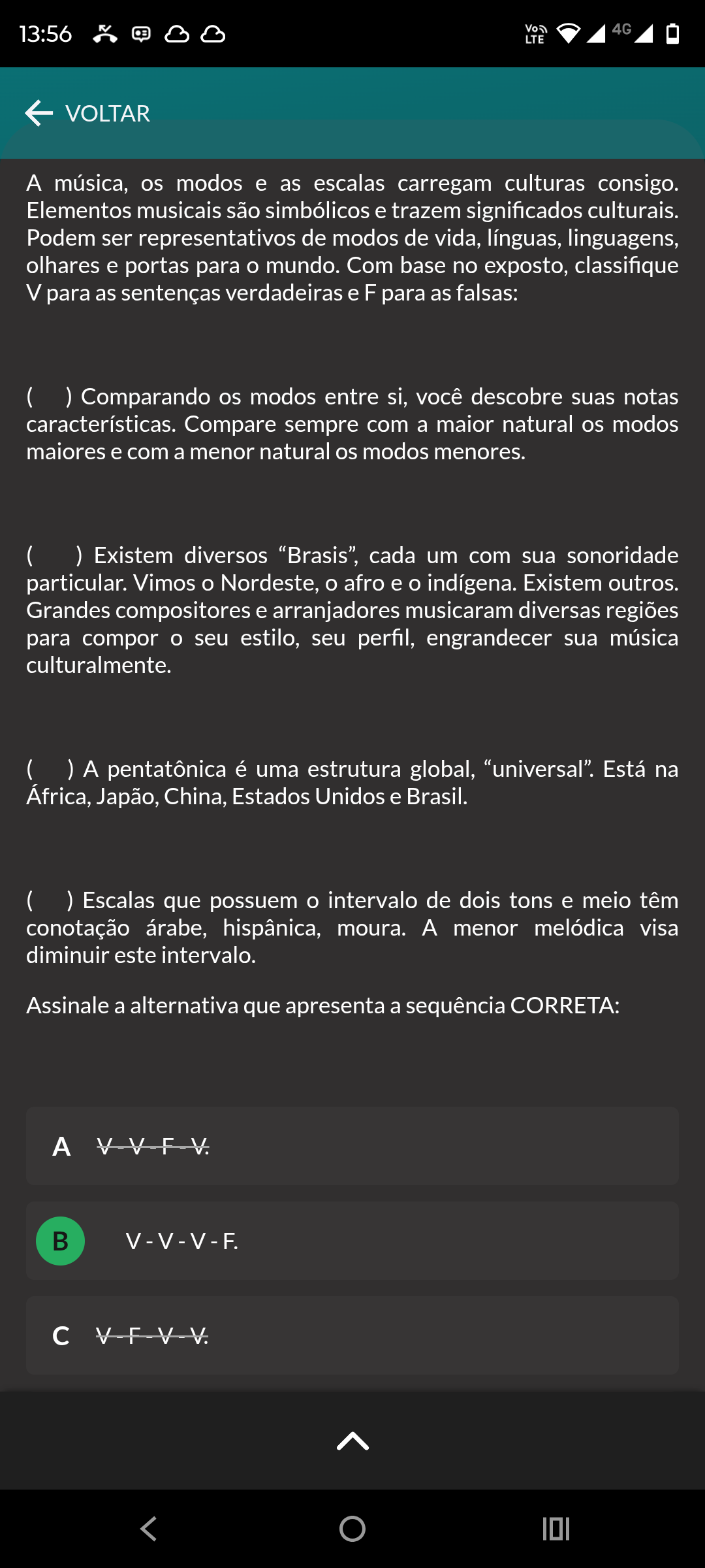 13:56 4G LTE VOLTAR A música, os modos e as escalas carregam culturas consigo. Elementos musicais são simbólicos e trazem significados culturais. Podem ser representativos de modos de vida, línguas, linguagens, olhares e portas para mundo. Com base no exposto, classifique V para as sentenças verdadeiras e F para as falsas: ( ) Comparando os modos entre si, você descobre suas notas características. Compare sempre com a maior natural os modos maiores e com a menor natural os modos menores. ( ) Existem diversos "Brasis", cada um com sua sonoridade particular. Vimos Nordeste, o afro e indígena. Existem outros. Grandes compositores e arranjadores musicaram diversas regiões para compor seu estilo, seu perfil, engrandecer sua música culturalmente. ( ) A pentatônica é uma estrutura global, "universal". Está na África, Japão, China, Estados Unidos e Brasil. ( ) Escalas que possuem intervalo de dois tons e meio têm conotação árabe, hispânica, moura. A menor melódica visa diminuir este intervalo. Assinale a alternativa que apresenta a sequência CORRETA: V-V-F-V. B V-V-V-F. c V-F-V-V.