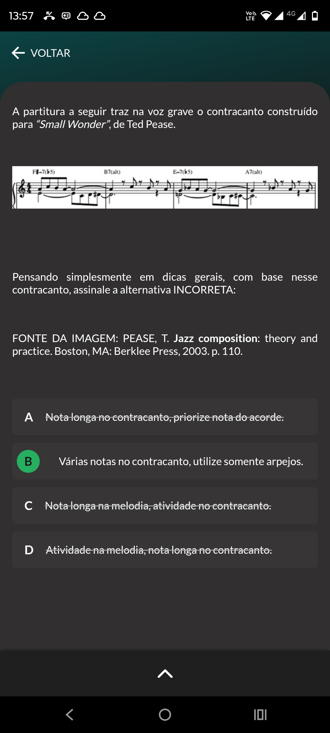 13:57 4G LTE VOLTAR A partitura a seguir traz na voz grave contracanto construído para "Small Wonder", de Ted Pease. B7(alt) E-7(b5) A7(alt) Pensando simplesmente em dicas gerais, com base nesse contracanto, assinale a alternativa INCORRETA: FONTE DA IMAGEM: PEASE, Jazz composition: theory and practice. Boston, MA: Berklee Press, 2003. p. 110. A Nota longa no contracanto, priorize nota do acorde. B Várias notas no contracanto, utilize somente arpejos. c Nota longa na melodia, atividade no contracanto. D Atividade na melodia, nota longa no contracanto.