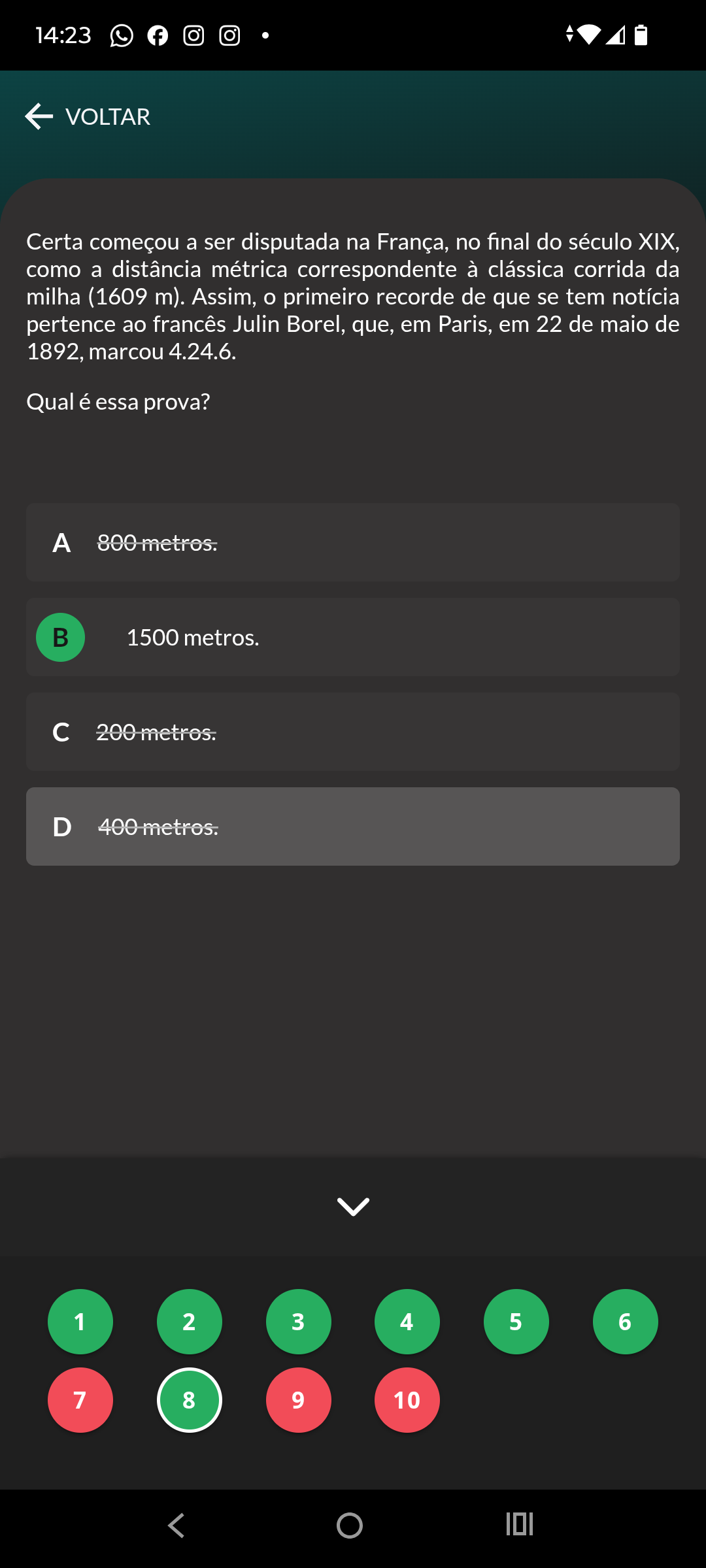 14:23 f VOLTAR Certa começou a ser disputada na França, no final do século XIX, como a distância métrica correspondente à clássica corrida da milha (1609 m). Assim, o primeiro recorde de que se tem notícia pertence ao francês Julin Borel, que, em Paris, em 22 de maio de 1892, marcou 4.24.6. Qual é essa prova? 800 metros. B 1500 metros. c 200 metros. D 400 metros. 1 2 3 4 5 6 7 8 9 10