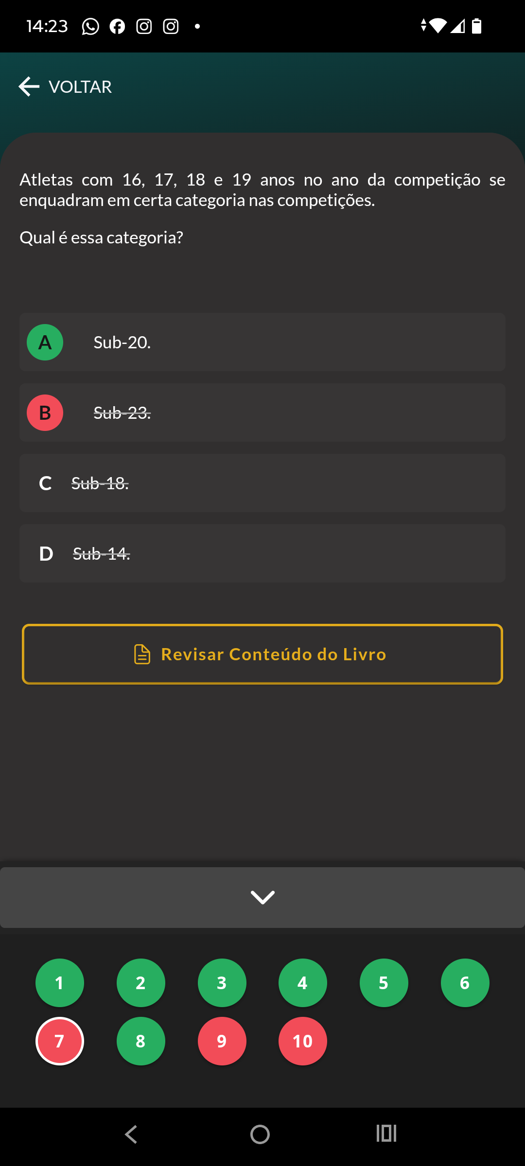 14:23 f VOLTAR Atletas com 16, 17, 18 e 19 anos no ano da competição se enquadram em certa categoria nas competições. Qual é essa categoria? A Sub-20. B Sub-23. c Sub-18. D Sub-14. Revisar Conteúdo do Livro 1 2 3 4 5 6 7 8 9 10
