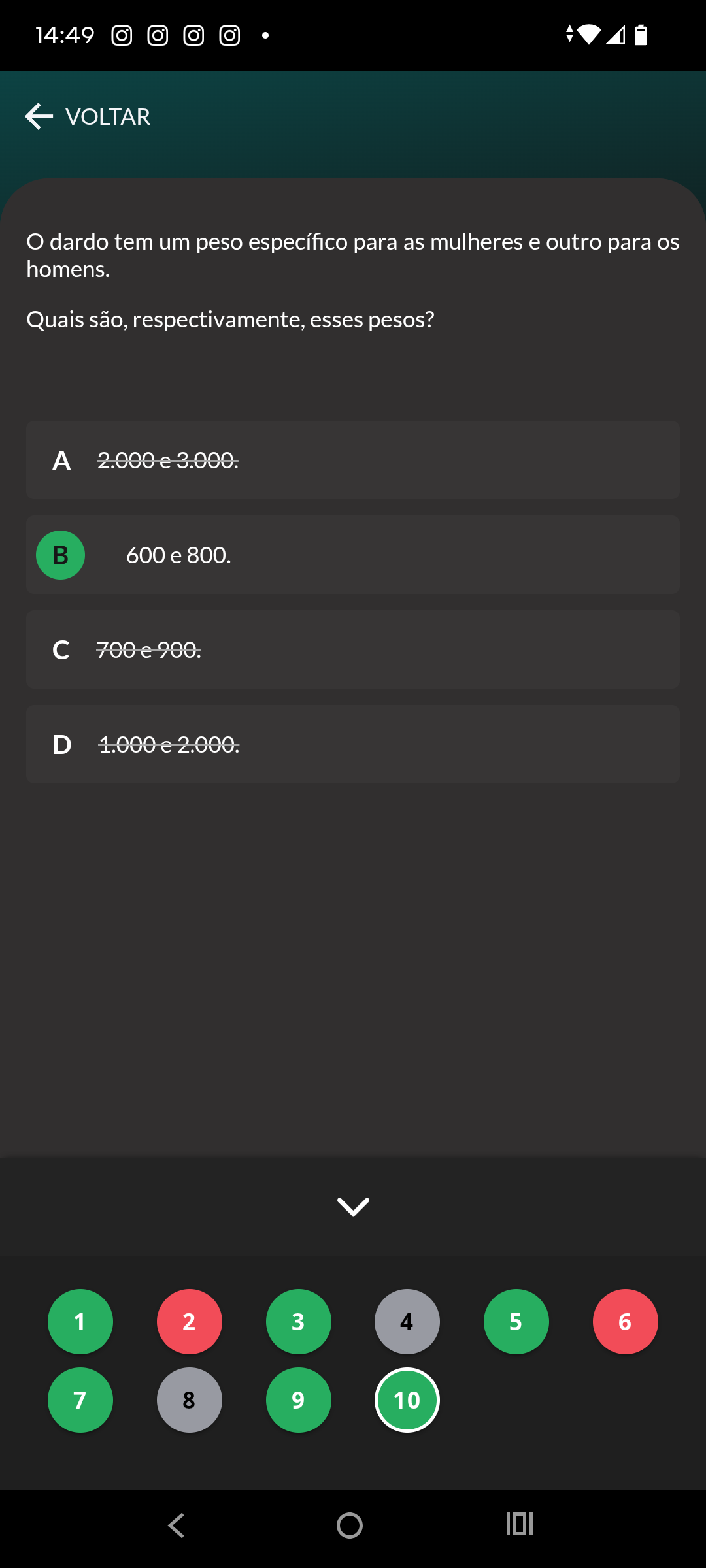 14:49 VOLTAR dardo tem um peso específico para as mulheres e outro para os homens. Quais são, respectivamente, esses pesos? A B 600 e 800. c D 1 2 3 4 5 6 7 8 9 10