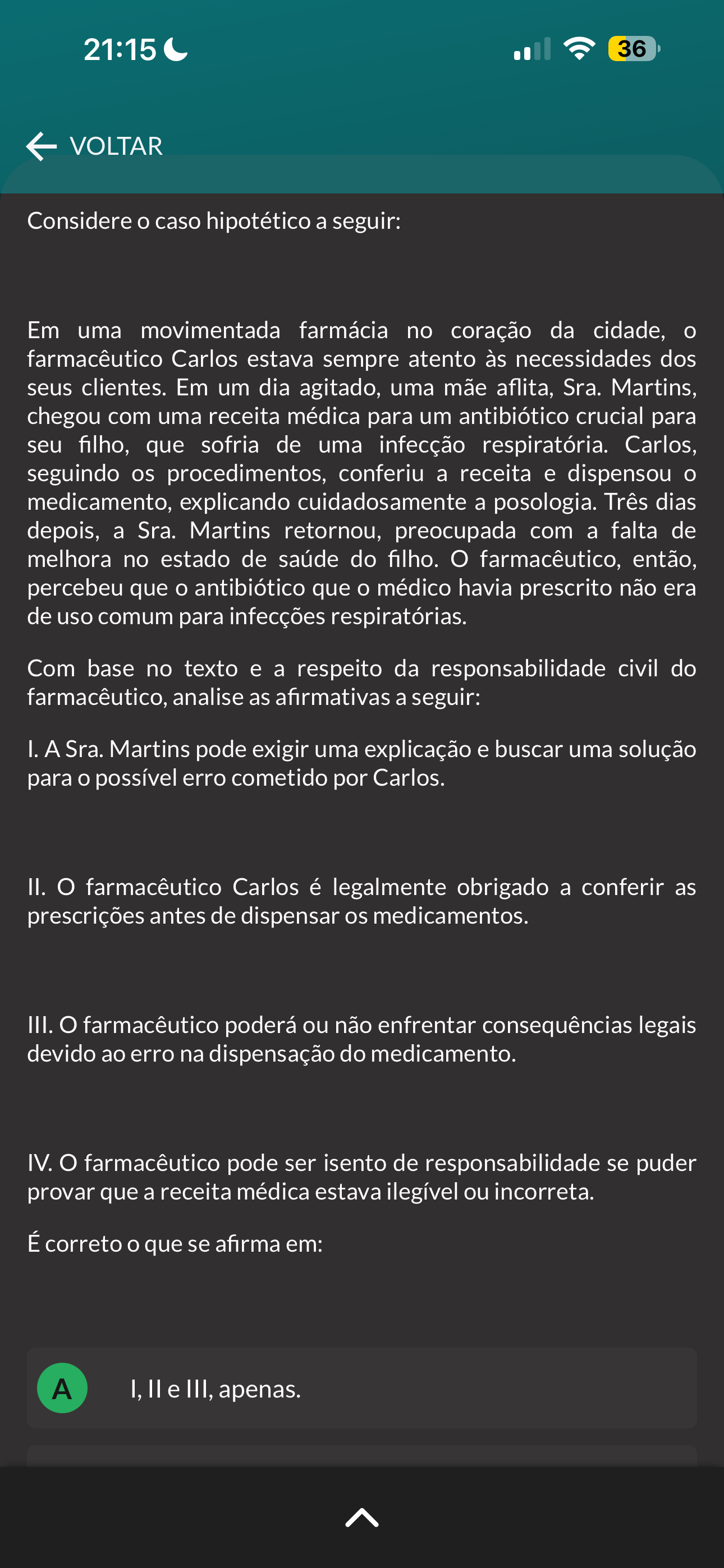 21:15 36 VOLTAR Considere caso hipotético a seguir: Em uma movimentada farmácia no coração da cidade, farmacêutico Carlos estava sempre atento às necessidades dos seus clientes. Em um dia agitado, uma mãe aflita, Sra. Martins, chegou com uma receita médica para um antibiótico crucial para seu filho, que sofria de uma infecção respiratória. Carlos, seguindo os procedimentos, conferiu a receita e dispensou medicamento, explicando cuidadosamente a posologia. Três dias depois, a Sra. Martins retornou, preocupada com a falta de melhora no estado de saúde do filho. farmacêutico, então, percebeu que antibiótico que médico havia prescrito não era de uso comum para infecções respiratórias. Com base no texto e a respeito da responsabilidade civil do farmacêutico, analise as afirmativas a seguir: I. A Sra. Martins pode exigir uma explicação e buscar uma solução para possível erro cometido por Carlos. II. farmacêutico Carlos é legalmente obrigado a conferir as prescrições antes de dispensar os medicamentos. III. farmacêutico poderá ou não enfrentar consequências legais devido ao erro na dispensação do medicamento. IV. farmacêutico pode ser isento de responsabilidade se puder provar que a receita médica estava ilegível ou incorreta. É correto que se afirma em: A I, e III, apenas.