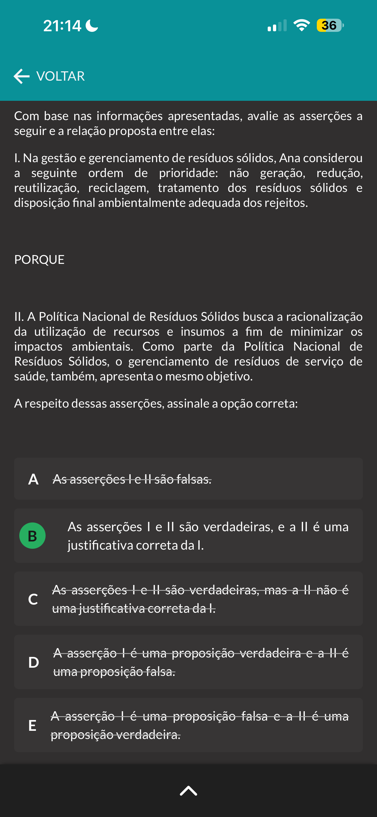 21:14 36 VOLTAR Com base nas informações apresentadas, avalie as asserções a seguir e a relação proposta entre elas: I. Na gestão e gerenciamento de resíduos sólidos, Ana considerou a seguinte ordem de prioridade: não geração, redução, reutilização, reciclagem, tratamento dos resíduos sólidos e disposição final ambientalmente adequada dos rejeitos. PORQUE II. A Política Nacional de Resíduos Sólidos busca a racionalização da utilização de recursos e insumos a fim de minimizar os impactos ambientais. Como parte da Política Nacional de Resíduos Sólidos, gerenciamento de resíduos de serviço de saúde, também, apresenta mesmo objetivo. A respeito dessas asserções, assinale a opção correta: A As asserções le são falsas. As asserções I e são verdadeiras, e a II é uma justificativa correta da I. As asserções le são verdadeiras, mas a não é c uma justificativa correta da A asserção lé uma proposição verdadeira e a é D uma proposição falsa. A asserção é uma proposição falsa e a é uma E proposição verdadeira.