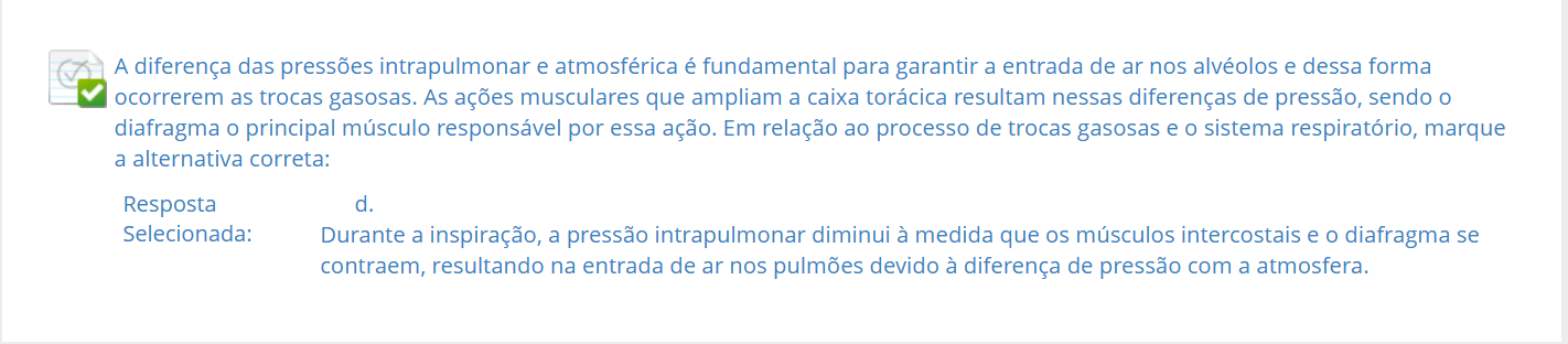 A diferença das pressões intrapulmonar e atmosférica é fundamental para garantir a entrada de ar nos alvéolos e dessa forma ocorrerem as trocas gasosas. As ações musculares que ampliam a caixa torácica resultam nessas diferenças de pressão, sendo O diafragma O principal músculo responsável por essa ação. Em relação ao processo de trocas gasosas e sistema respiratório, marque a alternativa correta: Resposta d. Selecionada: Durante a inspiração, a pressão intrapulmonar diminui à medida que os músculos intercostais e diafragma se contraem, resultando na entrada de ar nos pulmões devido à diferença de pressão com a atmosfera.