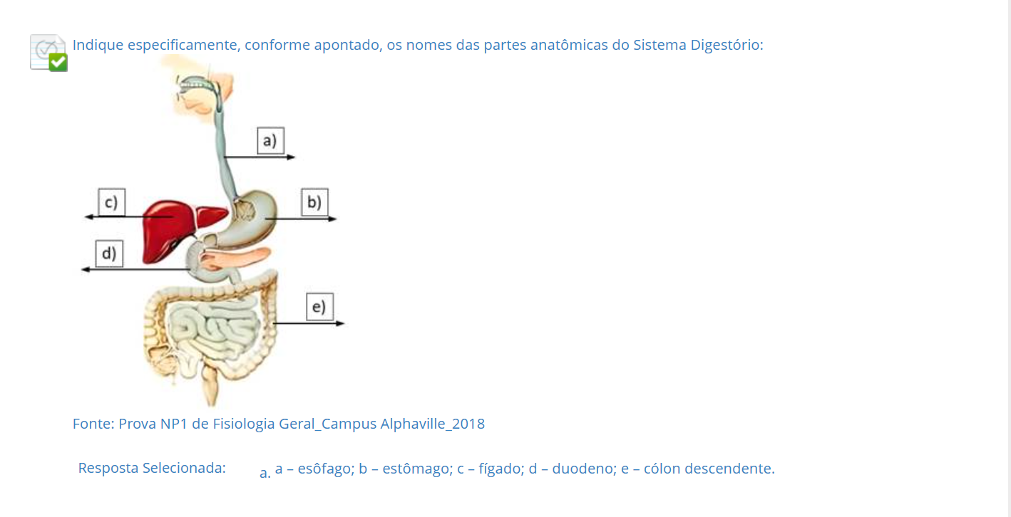 Indique especificamente, conforme apontado, os nomes das partes anatômicas do Sistema Digestório: a) c) b) d) e) Fonte: Prova NP1 de Fisiologia Geral_Campus Alphaville_2018 Resposta Selecionada: a. a - esôfago; b - estômago; - fígado; - duodeno; e - cólon descendente.