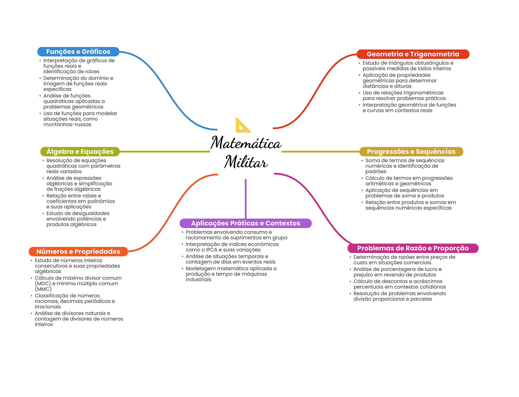 Funções e Gráficos Geometria e Trigonometria Interpretação de gráficos de Estudo de triângulos obtusângulos e funções reais e possíveis medidas de lados inteiros identificação de raízes Determinação do domínio e Aplicação de propriedades geométricas para determinar imagem de funções reais distâncias e alturas específicas Uso de relações trigonométricas Análise de funções quadráticas aplicadas a para resolver problemas práticos problemas geométricos Interpretação geométrica de funções e curvas em contextos reais Uso de funções para modelar situações reais, como montanhas-russas Matemática Álgebra e Equações Progressões e Sequências Resolução de equações Militar Soma de termos de sequências quadráticas com parâmetros numéricas e identificação de reais variados padrões Análise de expressões Cálculo de termos em progressões algébricas e simplificação aritméticas e geométricas de frações algébricas Aplicação de sequências em Relação entre raízes e problemas de soma e produtos coeficientes em polinômios Relação entre produtos e somas em e suas aplicações sequências numéricas específicas Estudo de desigualdades envolvendo potências e produtos algébricos Aplicações Práticas e Contextos Problemas envolvendo consumo e racionamento de suprimentos em grupo Interpretação de econômicos Números e Propriedades como IPCA e suas variações Problemas de Razão e Proporção Análise de situações temporais e Determinação de razões entre preços de Estudo de números inteiros contagem de dias em eventos reais custo em situações comerciais consecutivos e suas propriedades algébricas Modelagem matemática aplicada a Análise de porcentagens de lucro e produção e tempo de máquinas Cálculo de máximo divisor comum prejuízo em revenda de produtos industriais (MDC) e mínimo múltiplo comum Cálculo de descontos e acréscimos (MMC) percentuais em contextos cotidianos Classificação de números Resolução de problemas envolvendo racionais, decimais periódicos e divisão proporcional e parcelas irracionais Análise de divisores naturais e contagem de divisores de números inteiros
