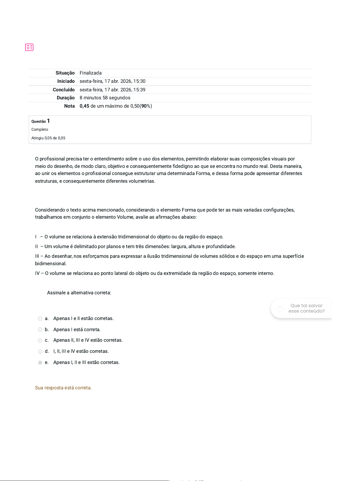 Situação Finalizada Iniciado sexta-feira, 17 abr. 2026, 15:30 Concluído sexta-feira, 17 abr. 2026, 15:39 Duração 8 minutos 58 segundos Nota 0,45 de um máximo de 0,50(90%) Questão 1 Completo Atingiu 0,05 de 0,05 O profissional precisa ter o entendimento sobre o uso dos elementos, permitindo elaborar suas composições visuais por meio do desenho, de modo claro, objetivo e consequentemente fidedigno ao que se encontra no mundo real. Desta maneira, ao unir os elementos o profissional consegue estruturar uma determinada Forma, e dessa forma pode apresentar diferentes estruturas, e consequentemente diferentes volumetrias. Considerando o texto acima mencionado, considerando o elemento Forma que pode ter as mais variadas configurações, trabalhamos em conjunto o elemento Volume, avalie as afirmações abaixo: I – O volume se relaciona à extensão tridimensional do objeto ou da região do espaço. II – Um volume é delimitado por planos e tem três dimensões: largura, altura e profundidade. III – Ao desenhar, nos esforçamos para expressar a ilusão tridimensional de volumes sólidos e do espaço em uma superfície bidimensional. IV – O volume se relaciona ao ponto lateral do objeto ou da extremidade da região do espaço, somente interno. Assinale a alternativa correta: a. Apenas I e II estão corretas. b. Apenas I está correta. c. Apenas II, III e IV estão corretas. d. I, II, III e IV estão corretas. e. Apenas I, II e III estão corretas. Sua resposta está correta. Que tal salvar esse conteúdo? Questão 2 Completo Atingiu 0,05 de 0,05 Para o profissional, desenhar não envolve somente a técnica, trata-se de um processo em que a imaginação ganha voz, e o registro da ideia se manifesta combinando papel e o meio pigmentado que se deseja utilizar para que a composição gráfica se manifeste. É por meio do desenho que o olhar criativo do artista, arquiteto, designer ou ilustrador se manifesta, gerando uma representação de caráter bi ou tridimensional, mesmo sobre uma base bidimensional, essa é a mágica da técnica essencial aos profissionais criativos e projetistas. Assim, com base nesta informação, analise as asserções abaixo: I. As imagens que surgem na mente normalmente são nebulosas, resumidas e muito enganosas. Mesmo quando nítidas e claras, podem vir à mente e então desaparecer de repente. A menos que as capturemos em um desenho, elas podem facilmente cair no esquecimento e ser substituídas por outras no fluxo da consciência. PORQUE II. Assim, desenhar é uma extensão natural e necessária do pensamento visual. À medida que a imagem mental guia o movimento de nossos olhos e da mão no papel, o desenho que emerge simultaneamente se funde com a imagem em nossa mente. A respeito dessas asserções, assinale a opção correta: a. As asserções I e II são proposições falsas. b. As asserções I e II são proposições verdadeiras, mas a II não é uma justificativa correta da I. c. A asserção I é uma proposição verdadeira e a II é uma proposição falsa. d. As asserções I e II são proposições verdadeiras e a II é uma justificativa correta da I. e. A asserção I é uma proposição falsa e a II é uma proposição verdadeira. Sua resposta está correta. Que tal salvar esse conteúdo? Questão 3 Completo Atingiu 0,05 de 0,05 Para desenvolver um projeto o entendimento e o uso dos elementos , é primordial, para que o profissional consiga elaborar suas composições visuais por meio do desenho, de modo claro, objetivo e consequentemente fidedigno ao que se encontra no mundo real. Considerando os aspectos gerais da forma do objeto que podemos estruturá-lo de maneira legível em um desenho, o processo de percepção visual e o exercício de observação do objeto de sua relação com os demais objetos ao redor é de extrema importância para que haja coerência no desenho. Com base nesta informação analise as asserções abaixo: I. Ao calcular as proporções gerais de um único objeto (comparando sua largura aparente com sua altura aparente), é importante que se lembre de diversos fatores: o caráter geométrico desse objeto (cilindro, sólido retilíneo etc.), sua orientação no espaço e sua posição no campo de visão em relação ao observador. PORQUE II. Cada fator pode fazer a proporção observada parecer bem diferente do que você esperaria quando baseado em seu conhecimento conceitual do objeto. A respeito dessas asserções, assinale a opção correta: a. As asserções I e II são proposições verdadeiras e a II é uma justificativa correta da I. b. As asserções I e II são proposições falsas. c. As asserções I e II são proposições verdadeiras, mas a II não é uma justificativa correta da I. d. A asserção I é uma proposição falsa e a II é uma proposição verdadeira. e. A asserção I é uma proposição verdadeira e a II é uma proposição falsa. Sua resposta está correta. Que tal salvar esse conteúdo? Questão 4 Completo Atingiu 0,05 de 0,05 Com a proliferação de inúmeros apelos visuais expressos em todos os ambientes que nos afetam diariamente, é gerada uma “concorrência”, no sentido de tentar buscar impacto efetivo no momento de idealizar e comunicar uma determinada mensagem. Para que uma mensagem se estabeleça no campo visual, ou seja, para que visualmente compreendamos a mensagem por trás da imagem, ou para com a imagem, é necessário que conheçamos os elementos que estruturam qualquer composição visual. Considerando o texto mencionado, abordando o processo de entendimento dos elementos que compõem uma estrutura visual, com o Ponto, pode ser classificado como: a. Um ponto tem gramatura ou largura, quando se torna invisível, e não estabelece uma posição no espaço. b. Um ponto tem dimensão ou escala, quando se torna invisível, estabelece uma posição no espaço. c. Um ponto não tem planejamento ou estrutura, quando se torna invisível, estabelece uma proporção no espaço. d.