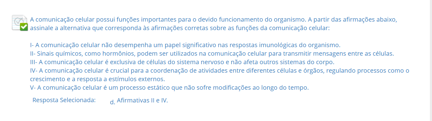 A comunicação celular possui funções importantes para O devido funcionamento do organismo. A partir das afirmações abaixo, assinale a alternativa que corresponda às afirmações corretas sobre as funções da comunicação celular: I- A comunicação celular não desempenha um papel significativo nas respostas imunológicas do organismo. II- Sinais químicos, como hormônios, podem ser utilizados na comunicação celular para transmitir mensagens entre as células. III- A comunicação celular é exclusiva de células do sistema nervoso e não afeta outros sistemas do corpo. IV- A comunicação celular é crucial para a coordenação de atividades entre diferentes células e órgãos, regulando processos como crescimento e a resposta a estímulos externos. V- A comunicação celular é um processo estático que não sofre modificações ao longo do tempo. Resposta Selecionada: d. Afirmativas II e IV.