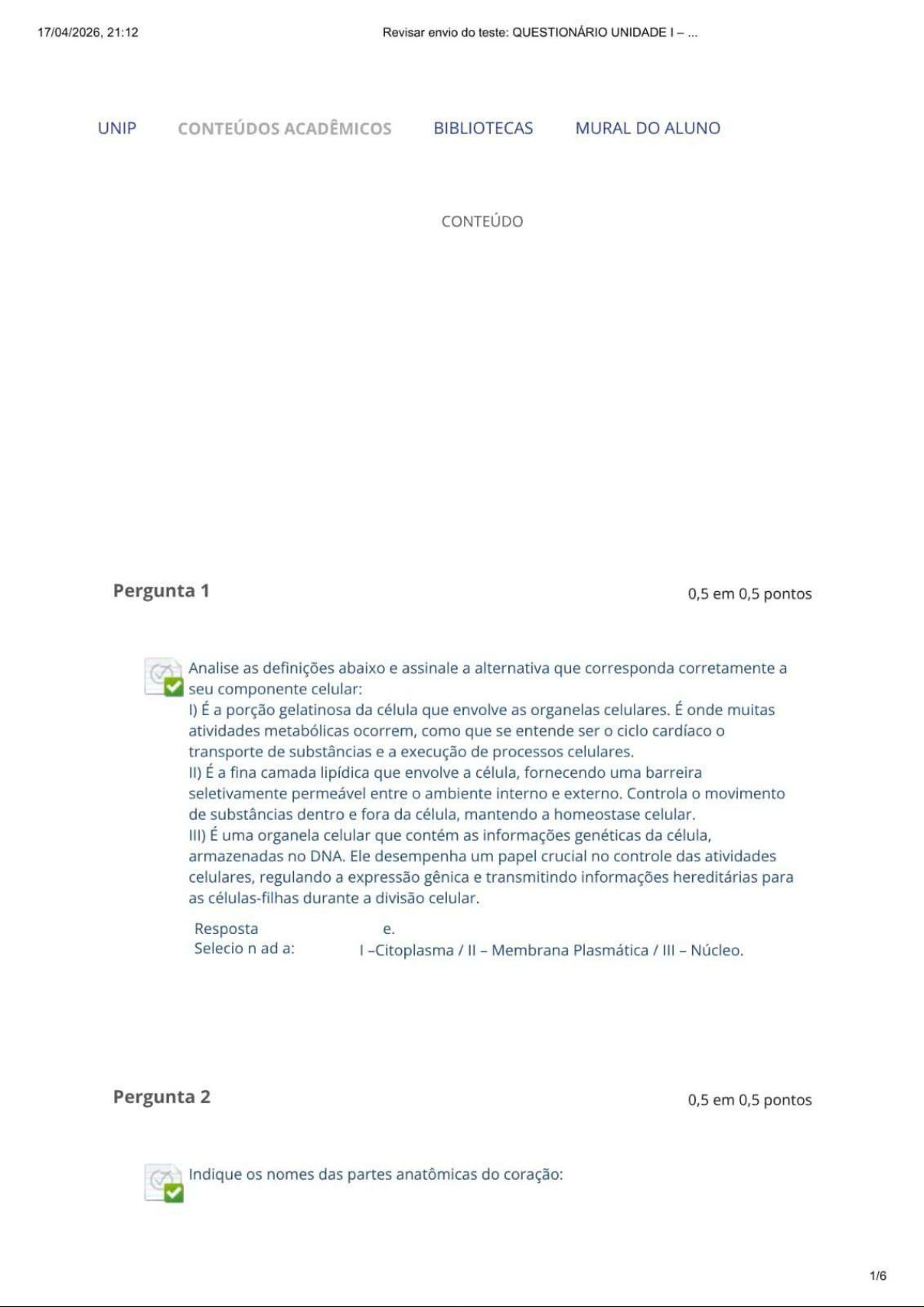 17/04/2026, 21:12 Revisar envio do teste: QUESTIONÁRIO UNIDADE I UNIP CONTEÚDOS ACADÊMICOS BIBLIOTECAS MURAL DO ALUNO CONTEÚDO Pergunta 1 0,5 em 0,5 pontos Analise as definições abaixo e assinale a alternativa que corresponda corretamente a seu componente celular: É a porção gelatinosa da célula que envolve as organelas celulares. É onde muitas atividades metabólicas ocorrem, como que se entende ser o ciclo cardíaco o transporte de substâncias e a execução de processos celulares. II) É a fina camada lipídica que envolve a célula, fornecendo uma barreira seletivamente permeável entre ambiente interno e externo. Controla movimento de substâncias dentro e fora da célula, mantendo a homeostase celular. III) É uma organela celular que contém as informações genéticas da célula, armazenadas no DNA. Ele desempenha um papel crucial no controle das atividades celulares, regulando a expressão gênica e transmitindo informações hereditárias para as células-filhas durante a divisão celular. Resposta e. Selecio n ad a: I -Citoplasma / Membrana Plasmática / III Núcleo. Pergunta 2 0,5 em 0,5 pontos Indique os nomes das partes anatômicas do coração: 1/617/04/2026, 21:12 Revisar envio do teste: QUESTIONÁRIO UNIDADE I c) a) d) b) e) F nt e:ht t p:/ / pt .dreamst ime.co m/ fo t grafi a-de-st ck -ro y alt y -free-anat mia-humana-d -CO ra% C3% A7% C3% -image10452637 Resposta b. Selecio n ad a: a -veia cava superior; b válvula tricúspide; artéria aorta; válvula pulmonar; e ventrículo esquerdo. Pergunta 3 0,5 em 0,5 pontos A diferença das pressões intrapulmonar e atmosférica é fundamental para garantir a entrada de ar nos alvéolos e dessa forma ocorrerem as trocas gasosas. As ações musculares que ampliam a caixa torácica resultam nessas diferenças de pressão, sendo diafragma principal músculo responsável por essa ação. Em relação ao processo de trocas gasosas e sistema respiratório, marque a alternativa correta: Resposta d. Selecio n ad a: Durante a inspiração, a pressão intrapulmonar diminui à medida que os músculos intercostais e diafragma se contraem, resultando na entrada de ar nos pulmões devido à diferença de pressão com a atmosfera. Pergunta 4 0 em 0,5 pontos Indique especificamente, conforme apontado, os nomes das partes anatômicas do Sistema Digestório: 2/617/04/2026, 21:12 Revisar envio do teste: QUESTIONÁRIO UNIDADE I a) c) b) d) e) Fonte: Prova NP1 de Fisiologia Geral_Campus Alphaville_2018 Resposta e. Selecio n ad a: a -esôfago; b fígado; estômago; d pâncreas; e intestino grosso. Pergunta 5 0,5 em 0,5 pontos A comunicação celular possui funções importantes para devido funcionamento do organismo. A partir das afirmações abaixo, assinale a alternativa que corresponda às afirmações corretas sobre as funções da comunicação celular: A comunicação celular não desempenha um papel significativo nas respostas imunológicas do organismo. Sinais químicos, como hormônios, podem ser utilizados na comunicação celular para transmitir mensagens entre as células. III- A comunicação celular é exclusiva de células do sistema nervoso e não afeta outros sistemas do corpo. IV- A comunicação celular é crucial para a coordenação de atividades entre diferentes células e órgãos, regulando processos como 0 crescimento e a resposta a estímulos ex t ern V-A comunicação celular é um processo estático que não sofre modificações ao longo do tempo. Resposta Selecionada: d. Afirmativas e IV. Pergunta 6 0,5 em 0,5 pontos 3/617/04/2026, 21:12 I Qual é a função principal do sistema cardiovascular no corpo humano? Resposta b. Selecio n ad a: Transportar nutrientes e oxigênio para as células e remover resíduos metabólicos. Pergunta 7 0,5 em 0,5 pontos Uma pesquisa produzida pelas Universidades de Toronto e Western Ontário, no Canadá, revela que a prática de exercícios físicos pode auxiliar portadores de doenças respiratórias, amenizando os sintomas dessas enfermidades. No estudo, uma das doenças mais mencionadas é a asma, que afeta 300 milhões de pessoas no mundo. levantamento constatou que a atividade física aumenta a constrição brônquica nos portadores, levando à diminuição dos sintomas ou até mesmo à eliminação do problema (Jornal Santuário de Aparecida). Sobre sistema respiratório, marque a alternativa que corresponde aos itens apontados na figura: 1 2 3 4 5 6 7 Fonte: Prova NP1 de Fisiologia Geral_Campus Chácara_2018 Resposta b. Selecio n ad a: 3-Cartilagens da laringe: tubulação com funções de produzir a voz e com válvula que impede passagem de alimento. Pergunta 8 0,5 em 0,5 pontos esquema a seguir apresenta um conjunto de órgãos numerados do sistema digestório. As funções de absorção de água e produção da insulina são realizadas, respectivamente, por: 4/617/04/2026, 21:12 Revisar envio do teste: QUESTIONÁRIO UNIDADE I II III IV V Fonte: Prova NP1 de Fisiologia Geral_Campus Jundiaí_2018 Resposta Selecionada: d. Ve III. Pergunta 9 0,5 em 0,5 pontos Considere as seguintes etapas da digestão: I - Absorção de alimentos. - Adição de ácido clorídrico ao suco digestivo. III Início da digestão das proteínas. IV Adição de bile e do suco pancreático ao suco digestivo. V Início da digestão do amido. Dentre esses processos, ocorrem no intestino delgado apenas: Resposta Selecionada: a. e IV. Pergunta 10 0,5 em 0,5 pontos Homeostase é processo para restabelecimento do equilíbrio do corpo. Para isso há dois sistemas que auxiliam diretamente nesse processo, quais são eles? Analise as alternativas abaixo e selecione a que corresponde corretamente a esses dois sistemas: Resposta b. Selecio n ad a: Osistema nervoso e sistema endócrino são os principais sistemas que auxiliam diretamente no processo de homeostase. sistema nervoso transmite sinais elétricos e endócrino utiliza hormônios. OK 5/6