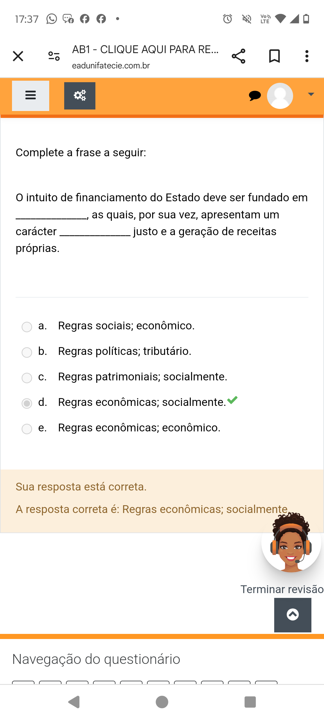 17:37 LTE AB1 - CLIQUE AQUI PARA RE... X eadunifatecie.com.br Complete a frase a seguir: intuito de financiamento do Estado deve ser fundado em , as quais, por sua vez, apresentam um carácter justo e a geração de receitas próprias. a. Regras sociais; econômico. b. Regras políticas; tributário. Regras patrimoniais; socialmente. d. Regras econômicas; socialmente. e. Regras econômicas; econômico. Sua resposta está correta. A resposta correta é: Regras econômicas; socialmente Terminar revisão Navegação do questionário