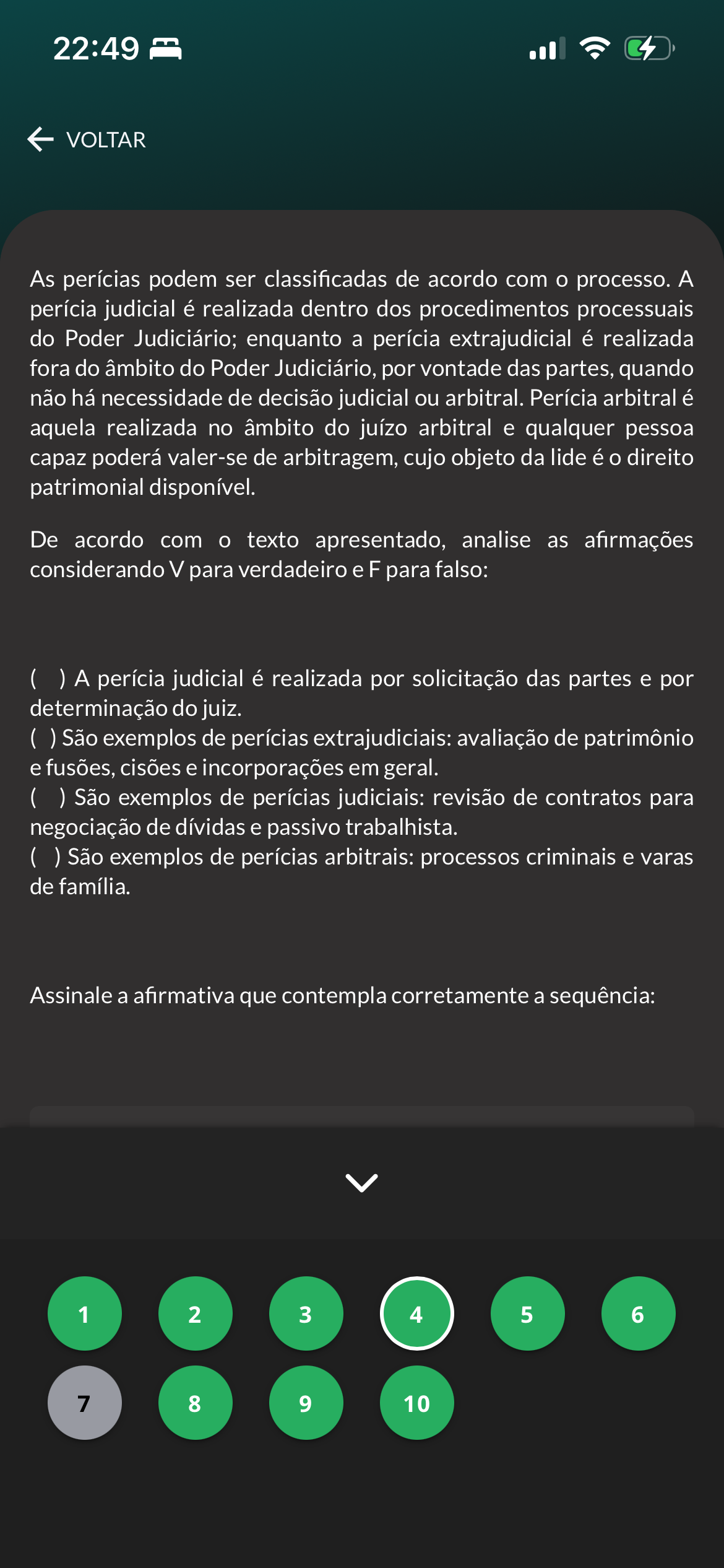 22:49 VOLTAR As perícias podem ser classificadas de acordo com o processo. A perícia judicial é realizada dentro dos procedimentos processuais do Poder Judiciário; enquanto a perícia extrajudicial é realizada fora do âmbito do Poder Judiciário, por vontade das partes, quando não há necessidade de decisão judicial ou arbitral. Perícia arbitral é aquela realizada no âmbito do juízo arbitral e qualquer pessoa capaz poderá valer-se de arbitragem, cujo objeto da lide é direito patrimonial disponível. De acordo com texto apresentado, analise as afirmações considerando V para verdadeiro e F para falso: A perícia judicial é realizada por solicitação das partes e por determinação do juiz. ( ) São exemplos de perícias extrajudiciais: avaliação de patrimônio e fusões, cisões e incorporações em geral. ( ) São exemplos de perícias judiciais: revisão de contratos para negociação de dívidas e passivo trabalhista. ( ) São exemplos de perícias arbitrais: processos criminais e varas de família. Assinale a afirmativa que contempla corretamente a sequência: 1 2 3 4 5 6 7 8 9 10