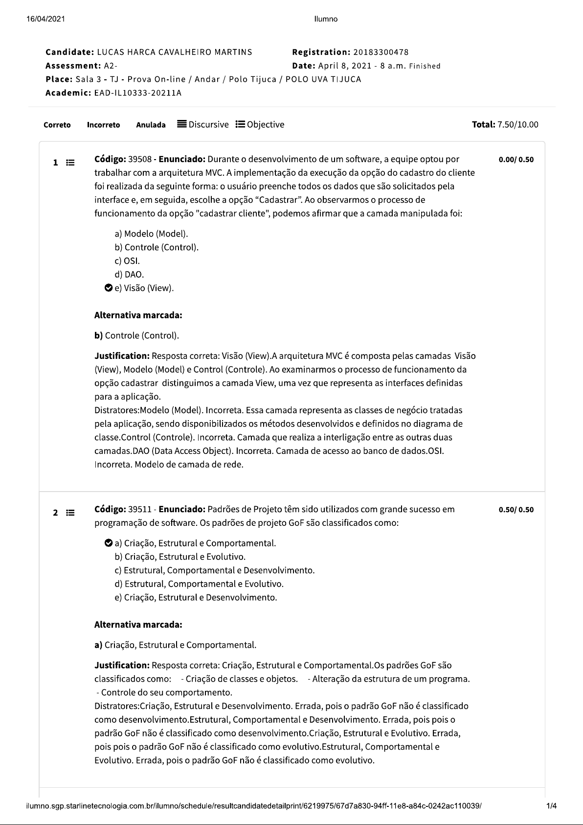 16/04/2021 llumno Candidate: LUCAS HARCA CAVALHEIRO MARTINS Registration: 20183300478 Assessment: A2- Date: April 8, 2021 8 a.m. Finished Place: Sala 3 TJ Prova On-line / Andar / Polo Tijuca / POLO UVA TIJUCA Academic: EAD-IL10333-20211A Correto Incorreto Anulada Discursive Objective Total: 7.50/10.00 1 Código: 39508 Enunciado: Durante o desenvolvimento de um software, a equipe optou por trabalhar com a arquitetura MVC. A implementação da execução da opção do cadastro do cliente foi realizada da seguinte forma: o usuário preenche todos os dados que são solicitados pela interface e, em seguida, escolhe a opção "Cadastrar". Ao observarmos o processo de funcionamento da opção "cadastrar cliente", podemos afirmar que a camada manipulada foi: a) Modelo (Model). b) Controle (Control). c) OSI. d) DAO. e) Visão (View). Alternativa marcada: b) Controle (Control). Justification: Resposta correta: Visão (View).A arquitetura MVC é composta pelas camadas Visão (View), Modelo (Model) e Control (Controle). Ao examinarmos o processo de funcionamento da opção cadastrar distinguimos a camada View, uma vez que representa as interfaces definidas para a aplicação. (Model). Incorreta. Essa camada representa as classes de negócio tratadas pela aplicação, sendo disponibilizados os métodos desenvolvidos e definidos no diagrama de classe.Control (Controle). Incorreta. Camada que realiza a interligação entre as outras duas camadas.DAO (Data Access Object). Incorreta. Camada de acesso ao banco de dados.OSI. Incorreta. Modelo de camada de rede. 2 Código: 39511 Enunciado: Padrões de Projeto têm sido utilizados com grande sucesso em programação de software. Os padrões de projeto GoF são classificados como: a) Criação, Estrutural e Comportamental. b) Criação, Estrutural e Evolutivo. c) Estrutural, Comportamental e Desenvolvimento. d) Estrutural, Comportamental e Evolutivo. e) Criação, Estrutural e Desenvolvimento. Alternativa marcada: a) Criação, Estrutural e Comportamental. Justification: Resposta correta: Criação, Estrutural e Comportamental.Os padrões GoF são classificados como: Criação de classes e objetos. Alteração da estrutura de um programa. Controle do seu comportamento. Distratores:Criação, Estrutural e Desenvolvimento. Errada, pois o padrão GoF não é classificado como desenvolvimento.Estrutural, Comportamental e Desenvolvimento. Errada, pois pois o padrão GoF não é classificado como Estrutural e Evolutivo. Errada, pois pois o padrão GoF não é classificado como evolutivo.Estrutural, Comportamental e Evolutivo. Errada, pois o padrão GoF não é classificado como evolutivo. 1/416/04/2021 llumno 3 Código: 39528 Enunciado: Os Diagramas de Pacotes são frequentemente utilizados em conjunto com outros diagramas (classes, componentes, implantação etc.) para demonstrar como esses elementos são agrupados. Dito isso, leia cada afirmação apresentada a seguir para determinar aquelas que são Nós de uma infraestrutura de hardware não podem ser agrupados em um pacote.II Um pacote representa um grupo de elementos que pode se relacionar com outros pacotes por meio de uma relação de Em uma dependência do tipo > uma alteração do pacote destino influencia no pacote origem.IV Um pacote pode ser utilizado para representar subsistemas, o qual pode ser constituído de vários subsistemas. É correto o que se afirma em: a) e III, apenas. b) e IV, apenas. c) e IV, apenas. d) e III, apenas. e) le II, apenas. Alternativa marcada: c) e IV, apenas. Justification: Resposta correta: e IV, Um pacote representa um grupo de elementos que pode se relacionar com outros pacotes por meio de uma relação de dependência.Correta. Um pacote pode relacionar-se com outros. Os relacionamentos permitidos entre pacotes são de dependência, refinamento e generalização (herança). IV. Um pacote pode ser utilizado para representar subsistemas, o qual pode ser constituído de vários subsistemas.Correta. Os pacotes representam subsistemas, exemplo, posso ter pacote que representa um sistema integrado de gestão empresarial, e este por sua vez ser constituídos pelos pacotes de Compras e Finanças. Distratores:I. Nós de uma infraestrutura de hardware não podem ser agrupados em um pacote. Incorreta, pois um pacote pode agrupar classes, componentes, nós de infraestrutura de hardware, entre outros, podendo inclusive um pacote conter outros pacotes. III. Em uma dependência do tipo > uma alteração do pacote destino influencia no pacote origem. Incorreta, pois na dependência do tipo > o conteúdo público do pacote de destino é adicionado ao pacote de origem. Já na dependência simples uma alteração do pacote destino influencia no pacote origem. 4 Código: 39506 Enunciado: Durante o desenvolvimento de um software optou-se por trabalhar com a arquitetura baseada em componentes, mas posteriormente surgiu a dúvida sobre qual arquitetura implementar. Sabe-se que a equipe de desenvolvimento precisa de uma arquitetura que permita a um computador executar programas em outro pela rede, como se estivesse sendo executado localmente. Considerando esse caso, indique a arquitetura adequada: a) COM/COM+ (Component Object Model). b) MVC (Modelo View Control). c) CMM (CORBA Component Model). d) DCOM (Distributed Component Object). e) EJB (JavaBeans e Entreprise JavaBeans). Alternativa marcada: d) DCOM (Distributed Component Object). Justification: Resposta correta: DCOM Distributed Component Object.A arquitetura DCOM permite que objetos COM comuniquem-se pela rede. Essa arquitetura representa uma evolução da COM/COM+, sendo que a diferença entre elas é que a DCOM atua em sistemas distribuídos. Distratores:COM/COM+ (Component Object Model). Incorreta. A arquitetura COM consiste em um padrão de interface binária, que permite o acoplamento entre aplicações independentemente da linguagem desenvolvida.EJB (JavaBeans e Entreprise JavaBeans). Incorreta. A arquitetura EJB tem como objetivo 