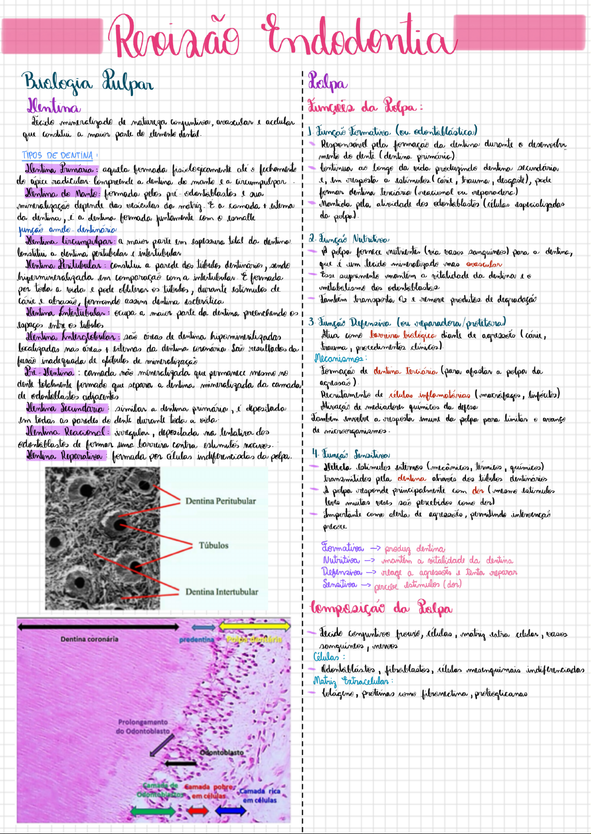 Revisão Pulpar Polpa da mineralizado de natureza l que a parte do elemento dental. Formativa (ou Responsovel pela formação da dentina durante o TIPOS DE DENTINA: mento do dente (dentina primária) aqulla formada até I longo da vida produzindo dentina do apice Compreende a dentina do manto l a d, resposta a estímulos desgaste), pode do Manto formada pelos l wa formar dentina terciária (reacional on mineralização depende das da matriz E a camada + Mantida pela dos (células especializadas da dentina, a dentina formada com da amelo- dentinária a parte total da dentina 2. Nutritiva a peritubular intertubular polpa nutrientes (via vasos para a dentina, Hentina Peritubular a parede dos túbulos sendo que i um tecido mineralizado mas avascular comparação com a E formada Esse suprimento a vitalidade da dentina por toda a vida l pode durante de metabolismo dos l formando assim dentina - transporta l remove produtos de degradação ocupa a parte da dentina preenchendo os entre tubulos 3. lou são áreas de dentina como barreira biológica diante de localizadas áreas externas da dentina coronária Sao resultados da procedimentos clinicos) fusão inadequada de de mineralização Mecanismos: camada mineralizada que no de dentina terciária (para afastar a polpa da dente totalmente formado que separa a dentina mineralizada da camada de adjacentes Recrutamento de células similar a dentina primária, depositada de mediadores quimicos da defesa todas as paredes do dente durante toda a envolve a imune da polpa para limitar Reacional depositada tentativa dos de de formar dma contra Hentina Reparativa formada por da polpa. 4. externos (mecânicos, quimitos) transmitidos pela através dos polpa responde principalmente com dor estimulos Dentina Peritubular leves como dor) Importante como alerta de Túbulos Formativa produz dentina Nutritiva mantém a vitalidade da dentina reage a agressoes tenta reparar Sensitiva Dentina Intertubular percebe estimulos (dor) da Dentina coronária predentina decido conjuntivo matriz extra vasos news Células: - indiferenciadas Matriz Extracelular: 1 fibronectina proteoglicanas Prolongamento do Odontoblasto Odontoblasto Camada Camada rica em células em célulasEX: LIMA Instrumentação Do 0,40 mm D1 = 0,02 mm 0,42 Preparo do SCR D2 0,40+ 0,02 + mm 0,44 D3 D16 (0,02x + mm objetivo da terapia endodontica i elemento dental a Padrão 0,32 mm no final dos 16 mm de ponta ativa saúde, a a mm Preparo Mecânico a modelagem 20 mm Do = número da lima dos SCR realizados durante preparo do canal radicular 25 mm - Modelagem obtenção de um canal cirurgico, realizado da 30 mm wm instruments manuals l que 35 mm conicidade, paredes para ou incisal lisas 40 mm que contenha toda sua extensão I canal de modo a alterar a forma original do canal radicular que mantenha Sabendo- se que em D 16 o diâmetro da lima (tipo K) é 0,52mm, qual forame apical, também ma é o número da lima? E a cor do cabo deste instrumento? 0,32 a) 40 amarelo b) 30 azul 40 preto ICS ICS MI MI MS MS Canal Canal Cinirgico Canal Canal Canal Canal c) 20 amarelo contendo em toda contendo em toda contendo em toda extensão sua extensão sua extensão d) 60 azul ação conjugada de quimicas l de que visa limpeza Limas NITI variada do SCR Limas conicidade padrão 0,02 mm OBJETIVOS PREPARO QUÍMICO MECÂNICO Limpar eliminar restos l l outros materiais estranhos de toda extensão do CDR Comprimento do dente ma radiografia ,Ajudada pela CPC Comprimento de patência do canal (todo comprimento do dente) de forma adequada canal radicular the CAD Comprimento aparente do dente forma para receber uma CTP Comprimento de trabalho provisório MODELAGEM CRT CRD- CRT CTP = CDR de trabalho CT CT = CPC- mm 1) LIMA DE AÇO INOXIDÁVEL (Manual) Baixa flexibilidade - Indicada para ou currectura Boa tatil (usada com movimentos de Lolução Errigadera - Maior risco de transporte, fratura Bactericida lusto Dissolver materia 2) LIMA NITI a layer Menor rigidez l flexibilidade Biocompativel irritar saudáveis) Indicadas para canais on Lubrificar canal memoria de forma HIPOCLORITO DE SÓDIO 0,5% 5,25%) risco de quebra - materia orgânica VANTAGENS NITI X AÇO INOXIDAVEL - Efficientes contra incluindo Menor tempo de trabalho os de Irradicar ( fungos Forma final do + antralizada Removem minimamente a smlar layer l a dentina Menor deslocamento Biocompativel desde que ultilizado dentro do canal de material para periapice (dor - o Menor do proficional - Maior concentração = main atividade bacteriana = lonicidade dos dissolução de orgânica Hipoclorito de atua de contra lanal cônico instrumentos apresentam conicidade de LIMAS K E - Age interferindo metabólicas à Parte ativa 16 mm do (causa ao DNA microbiano) 0,02 mm a cada mm CLOREXIDINA 2% - Não é de orgânica D₀ D16 1 - Não possui efetividade superior ao - 16 mm para alérgicos ao HipocloritoÁCIDO ETICENODIAMINOTETRACÉTICO (EDTA) TIPOS da smlar layer PARAMONOCLOROFENOL CANFORADO (PMCC) - Previne apical Ação antimicrabiana - acesso das irrigadoras pela promoção da - lurto período de atuação 24-48 hs dos túbulos dentinários Baixa tensão superficial Ultilizado após a instrumentação por 5 min) - Não de penetração mas canal deve estar SEMPRE imundado com solução irrigadara durante seu preparo !!! - Não produtos tóxicos da atividade Agitação mecânica da solução clean) potencializa seu efeito Age soments lm bactérias aeróbicas lamais amplos l retos + eficiência INDICAÇÃO lanais l atrésicos * com polpa NECROSADA onde NÃO foi possível realizar I PROPIEDADES SOLUÇÕES preparo químico mecânico Baixa tensão superficial - Baixa OSTOPORIM Medicação kntracanal reduz as dyesas teciduais - Antibiotico auxilia no combate a eventual durante a instrumentação por infiltração através da Bacterias principais por problemas restauração Ramificações do principal das limas com polpa VITAL onde NÃO foi possível realizar necessidade de medicação intracanal 