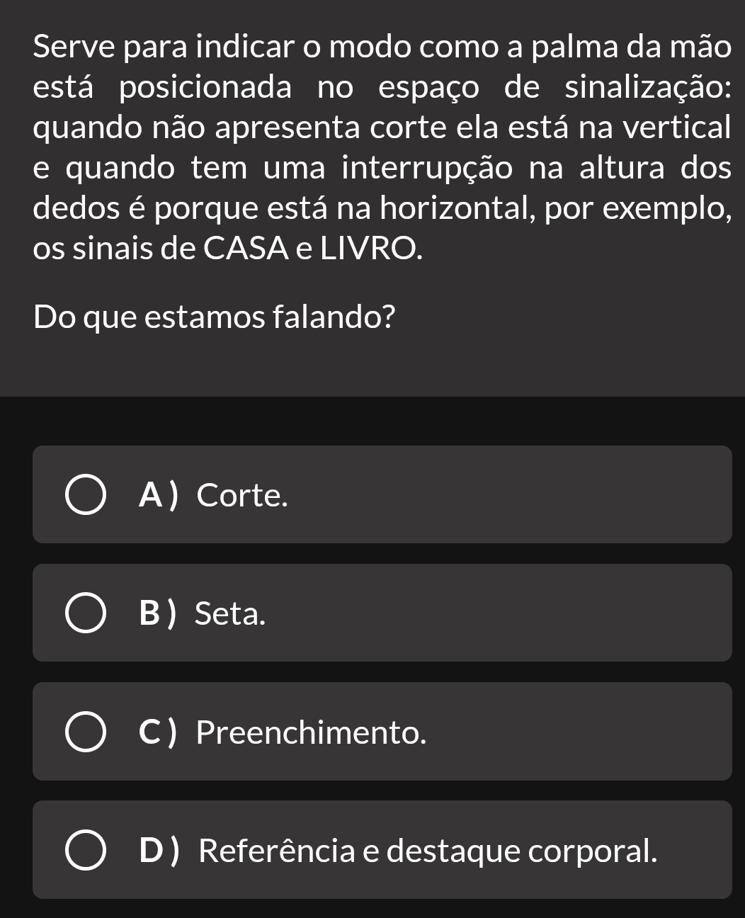 Serve para indicar modo como a palma da mão está posicionada no espaço de sinalização: quando não apresenta corte ela está na vertical e quando tem uma interrupção na altura dos dedos é porque está na horizontal, por exemplo, os sinais de CASA e LIVRO. Do que estamos falando? A) Corte. B) Seta. C) Preenchimento. D) Referência e destaque corporal.