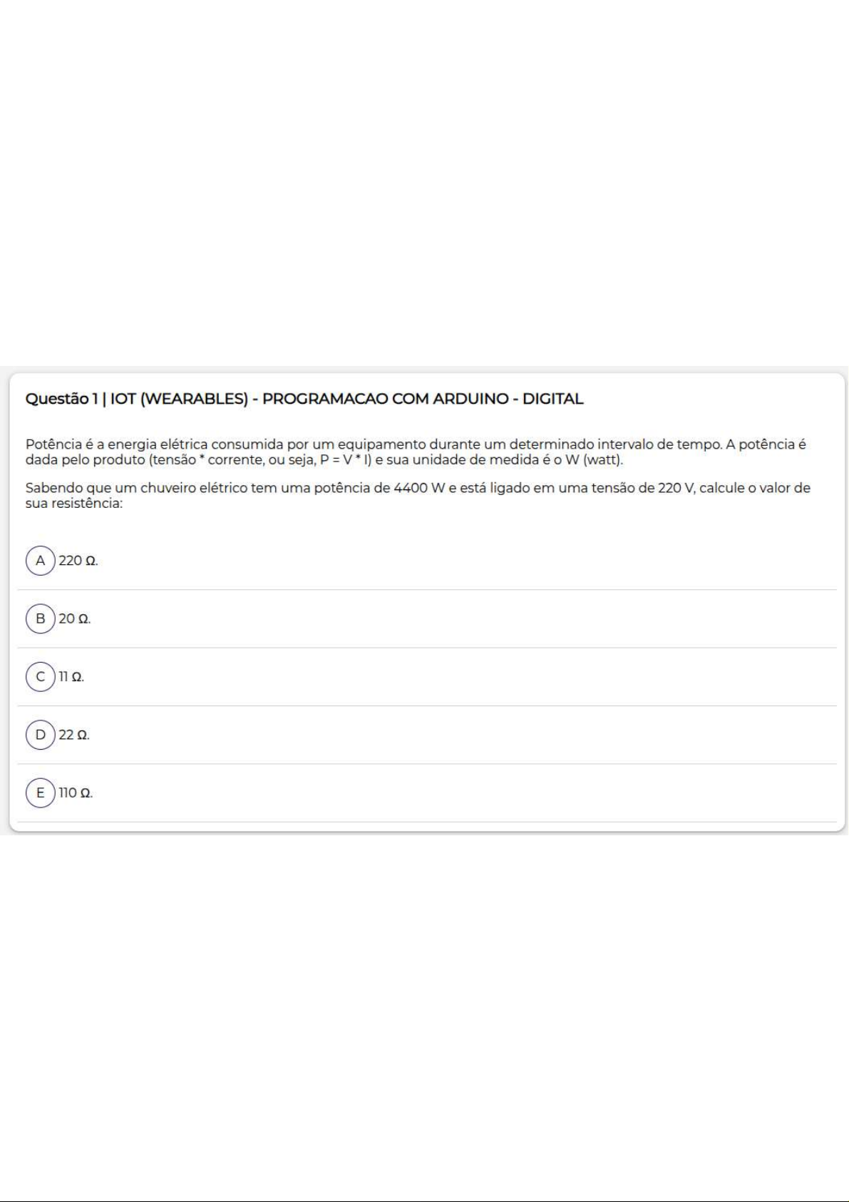 Questão 1 IOT (WEARABLES) - PROGRAMACAO COM ARDUINO - DIGITAL Potência é a energia elétrica consumida por um equipamento durante um determinado intervalo de tempo. A potência é dada pelo produto (tensão * corrente, ou seja, P = V*I) e sua unidade de medida é W (watt). Sabendo que um chuveiro elétrico tem uma potência de 4400 W e está ligado em uma tensão de 220 V, calcule valor de sua resistência: A 220 Ω. 20 Ω. D Ω. E 110 Ω.Questão 2 IOT (WEARABLES) PROGRAMACAO COM ARDUINO - DIGITAL Um circuito de alerta usado em um automóvel possui dois sensores de entrada: sensor de indicação do cinto de segurança e sensor do motor.Este circuito aciona um pequeno alarme, alertando motorista conforme a Tabela 2. Tabela 2 CINTO MOTOR ALARME Travado Desligado Desligado Travado Ligado Desligado Destravado Desligado Desligado Destravado Ligado Ligado Baseado nestas informações e no conteúdo estudado, assinale tipo de porta lógica que foi usada neste circuito para acionamento do alarme: A AND. B XOR. OR. D XNOR. E NOT.Questão 3 IOT (WEARABLES) PROGRAMACAO COM ARDUINO DIGITAL A principal diferença entre corrente alternada e corrente contínua é que a corrente contínua percorre sempre um mesmo sentido dentro de um circuito elétrico, enquanto a corrente alternada varia sentido em função do tempo. Considerando texto acima e os conteúdos abordados na unidade, analise as asserções a seguir e a relação proposta entre elas: I. A distribuição da energia elétrica pelas concessionárias é feita com uso da corrente alternada. Porque: II. A corrente alternada permite que a distribuição de energia não sofra muitas perdas devido à distância que precisa percorrer. A seguir, assinale a alternativa correta: A As asserções I e II são proposições verdadeiras, e a II é uma justificativa correta da I. As asserções I e são proposições falsas. A asserção I é uma proposição verdadeira, e a é uma proposição falsa. D As asserções I e são proposições verdadeiras, mas a não é uma justificativa correta da I. E A asserção I é uma proposição falsa, e a é uma proposição verdadeira.Questão 4 I IOT (WEARABLES) PROGRAMACAO COM ARDUINO DIGITAL Os Resistores são componentes eletrônicos usados para limitar a corrente elétrica em um circuito. Os resistores podem ser fixos ou variáveis, e são muito utilizados para acoplagem de circuitos e também como sensores. A Figura 8 ilustra dois modelos de resistores variáveis. LDR Potenciômetro Figura 8 Resistores variáveis autor (2019) A partir dos componentes ilustrados na Figura 8 e do conteúdo estudado nesta unidade, podemos afirmar que: I. O LDR pode ser usado como sensor para acionamento automático de uma lâmpada se ambiente estiver escuro. II. LDR pode ser usado como sensor em um robô para identificar uma linha escura em um trajeto a ser seguido. III. potenciômetro pode ser usado como sensor para identificar a variação de temperatura. IV. potenciômetro pode ser usado como sensor para identificar pulsos ultrassônicos. Está correto apenas que se afirma em: A I, III e IV. B e III. I e II. D III e IV. E I e IV.Questão 5 I IOT (WEARABLES) - PROGRAMACAO COM ARDUINO DIGITAL Sistema Internacional de Unidades, ou simplesmente SI, é sistema mais utilizado no mundo moderno para a padronização das unidades de medida, adotando-se uma unidade para cada grandeza física. Considerando essas informações e conteúdo estudado, analise as afirmativas a seguir e assinale V para a(s) verdadeira(s) e F para a(s) falsa(s): I. A unidade que representa a tensão é volt. II. A unidade que representa a corrente elétrica é ohm. III. A unidade que representa a potência é watt. IV. A unidade que representa a resistência elétrica é ampère. Agora, assinale a alternativa que apresenta a sequência correta: A B V,V,V,F. F,V,F,V. D V,F,V,F. EQuestão 6 IOT (WEARABLES) PROGRAMACAO COM ARDUINO - DIGITAL Eletrônica é ramo da ciência que estuda uso de circuitos formados por componentes elétricos e eletrônicos, com objetivo principal de armazenar, transmitir ou processar informações. Sobre conceitos de eletrônica estudados, avalie as afirmativas a seguir e assinale com V a(s) alternativa(s) verdadeiras(s) e com F a(s) falsa(s): A eletrônica divide-se em duas partes, a analógica e a digital. II. A eletrônica digital trabalha com quantidades fracionadas e decimais. III. A eletrônica analógica pode ser encontrada de forma aplicada nos reprodutores de discos de vinil. IV. A tensão elétrica é medida em ampère. Agora, assinale a opção que corresponde à sequência correta: A F,F,V,F. B V,F,F,F. F,V,V,F. D V,F,V,F. E V,F,V,V.Questão 7 I IOT (WEARABLES) PROGRAMACAO COM ARDUINO DIGITAL A plataforma Arduino é composta pela placa Arduino e pelo software Arduino. Com relação ao hardware, Arduino possui placas que são otimizadas para trabalhar com projetos específicos. Assim, considerando as informações apresentadas e conteúdos estudados, analise as placas a seguir e associe-as com suas respectivas características: 1) Arduino UNO 2) Arduino DUE 3) Arduino NANO 4) Arduino YUM Versão desenvolvida especialmente para loT. Versão ideal para iniciantes. Versão indicada para uso na protoboard. Versão potente com processador ARM de 32 bits. Agora, assinale a alternativa que apresenta a sequência correta: A 4,1,2,3. 1,2,4,3. 2,4,3,1. D 4,1,3,2. E 3,1,2,4.Questão 8 I IOT (WEARABLES) - PROGRAMACAO COM ARDUINO - DIGITAL Um projeto de alarme residencial possui dois sensores de entrada (janela e porta) e um atuador sonoro (sirene) usado como saída, conforme ilustrado na Figura 7. Janela ? Sirene Porta Figura 7 Projeto de um alarme - autor (2019) Para esse projeto, vamos considerar como 0 (zero) a janela aberta e 1 (um) a janela fechada. mesmo vale para a porta, 0 (zero) porta aberta e 1 (um) porta fechada, vamos também considerar como (zero) a sirene desligada e 1 (um) a sirene ligada. Considerando essas informações