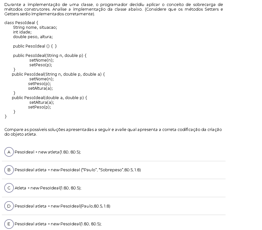 Durante a implementação de uma 0 programador decidiu aplicar 0 conceito de sobrecarga de métodos construtores. Analise a implementação da classe abaixo. (Considere que 05 métodos Setters e Getters serão implementados corretamente). class PesoIdeal { String nome, situacao; int idade; double peso, altura; public PesoIdeal { } public PesoIdeal(String n, double p) { setNome(n); setPeso(p); } public PesoIdeal(String n, double p, double a) { setNome(n); setPeso(p); setAltura(a); } public PesoIdeal(double a, double p) { setAltura(a); setPeso(p); } } Compare as possíveis soluções apresentadas a seguir e avalie qual apresenta a correta codificação da criação do objeto atleta. A Pesoldeal = new atleta B Pesoldeal atleta = new Pesoldeal "Sobrepeso" Atleta = new Pesoldeal D Pesoldeal atleta = new Pesoldeal atleta = new