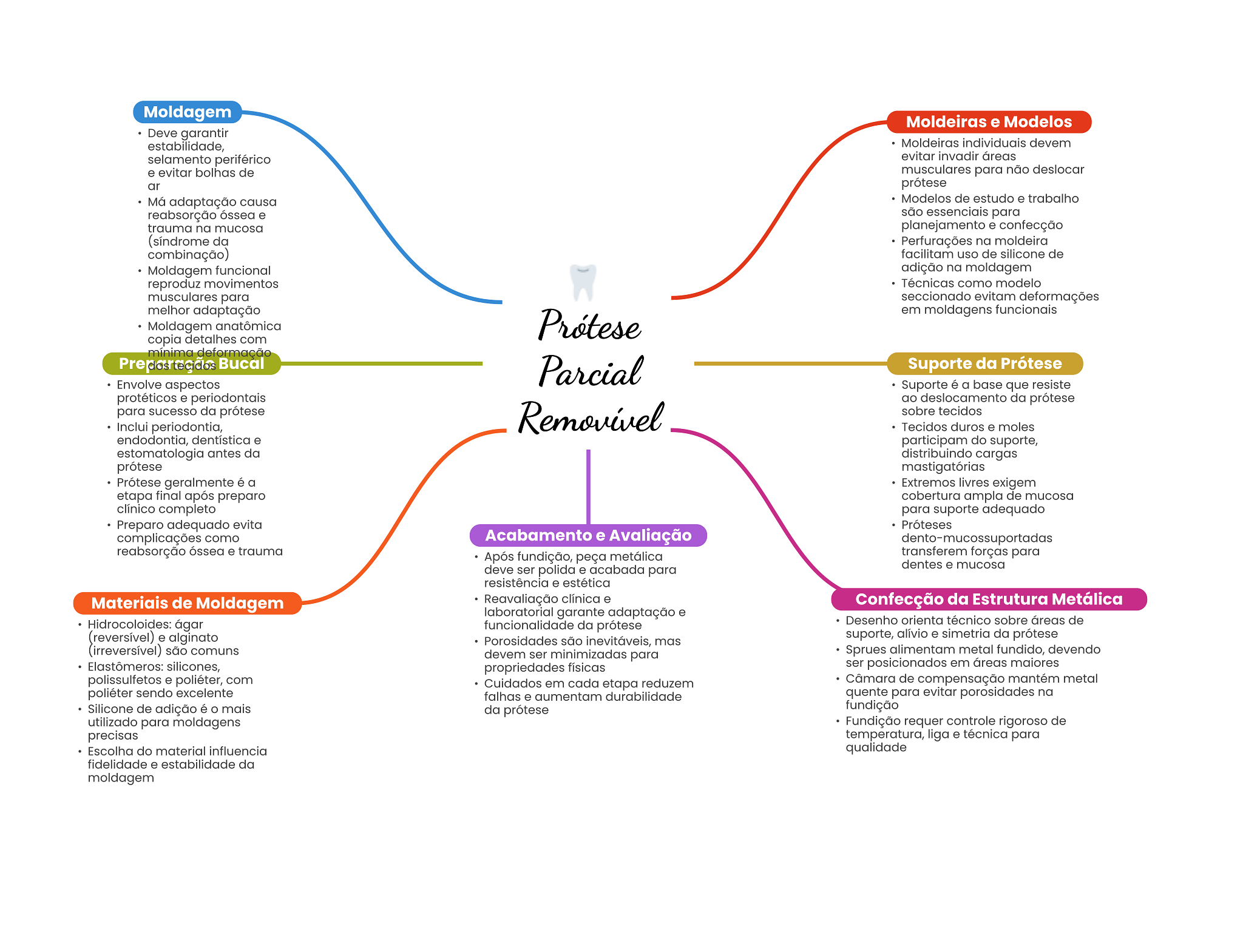 Moldagem Moldeiras e Modelos Deve garantir estabilidade, Moldeiras individuais devem selamento periférico evitar invadir áreas e evitar bolhas de musculares para não deslocar ar prótese Má adaptação causa Modelos de estudo e trabalho reabsorção óssea e são essenciais para trauma na mucosa planejamento e confecção (síndrome da Perfurações na moldeira combinação) facilitam uso de silicone de Moldagem funcional adição na moldagem reproduz movimentos Técnicas como modelo musculares para seccionado evitam deformações melhor adaptação em moldagens funcionais Moldagem anatômica Prótese copia detalhes com mínima deformação Bucal Parcial Suporte da Prótese Envolve aspectos Suporte é a base que resiste protéticos e periodontais ao deslocamento da prótese para sucesso da prótese Inclui periodontia, Removivel sobre tecidos Tecidos duros e moles endodontia, dentística e participam do suporte, estomatologia antes da distribuindo cargas prótese mastigatórias Prótese geralmente é a Extremos livres exigem etapa final após preparo cobertura ampla de mucosa clínico completo para suporte adequado Preparo adequado evita Próteses complicações como Acabamento e Avaliação dento-mucossuportadas reabsorção óssea e trauma Após fundição, peça metálica transferem forças para deve ser polida e acabada para dentes e mucosa resistência e estética Materiais de Moldagem Reavaliação clínica e Confecção da Estrutura Metálica laboratorial garante adaptação e Hidrocoloides: ágar funcionalidade da prótese Desenho orienta técnico sobre áreas de (reversível) e alginato suporte, alívio e simetria da prótese Porosidades são inevitáveis, mas (irreversível) são comuns devem ser minimizadas para Sprues alimentam metal fundido, devendo Elastômeros: silicones, propriedades físicas ser posicionados em áreas maiores polissulfetos e poliéter, com Cuidados em cada etapa reduzem Câmara de compensação mantém metal poliéter sendo excelente falhas e aumentam durabilidade quente para evitar porosidades na Silicone de adição é mais da prótese fundição utilizado para moldagens Fundição requer controle rigoroso de precisas temperatura, liga e técnica para Escolha do material influencia qualidade fidelidade e estabilidade da moldagem