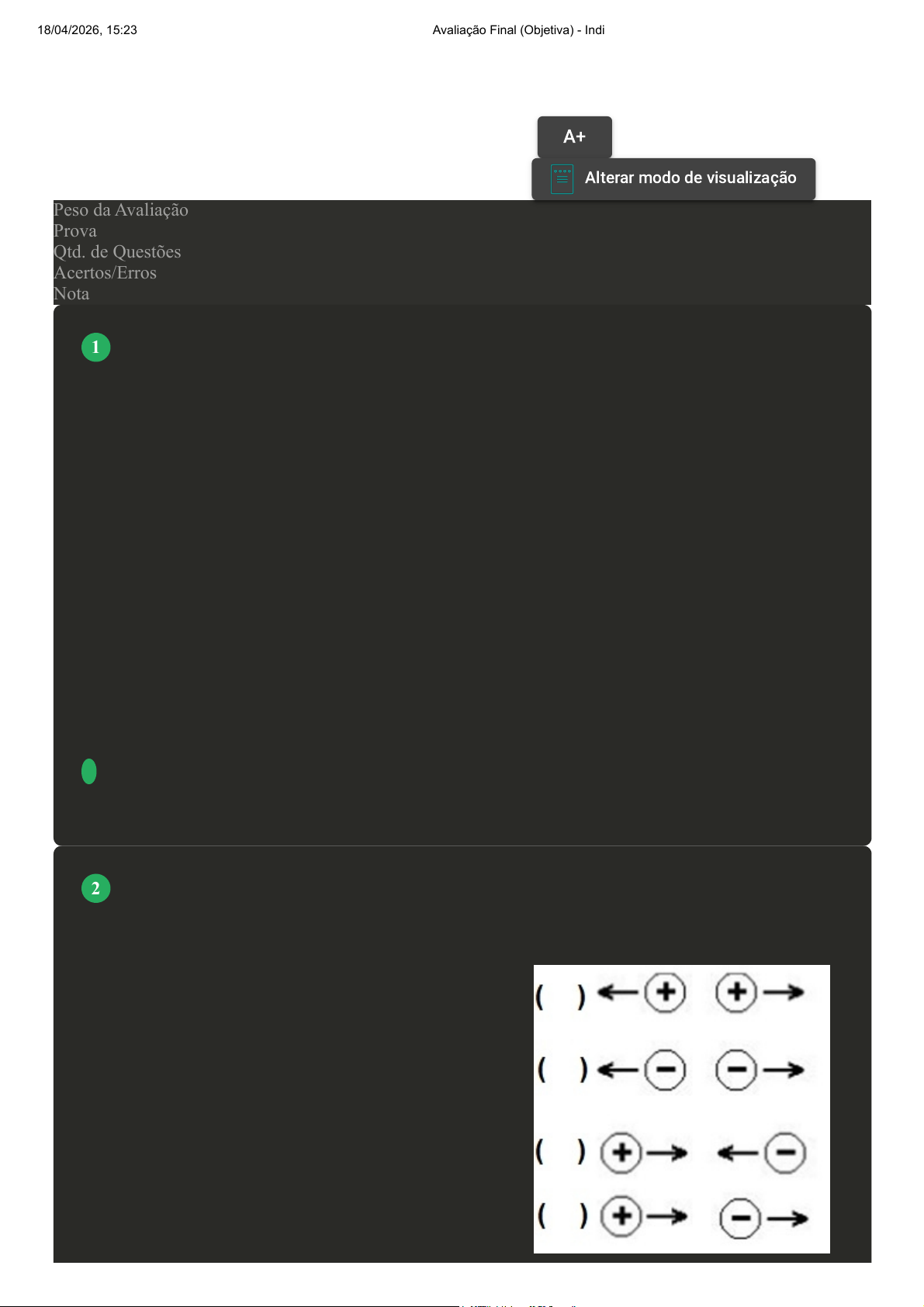 Prova Impressa GABARITO | Avaliação Final (Objetiva) - Individual (Cod.:1594752) Peso da Avaliação 4,00 Prova 115240877 Qtd. de Questões 10 Acertos/Erros 6/4 Nota 6,00 Diferentemente dos condutores, os isolantes são materiais que não conduzem bem a corrente elétrica. Alguns exemplos de isolantes são: vidro, cerâmica, plástico etc. Em condições normais, esses materiais não têm elétrons livres. Sobre a movimentação dos elétrons nos condutores, assinale a alternativa CORRETA: A Nos condutores metálicos, os elétrons da camada de valência não estão ligados ao núcleo do átomo e podem facilmente ser libertados, tornando-se elétrons livres. B Nos condutores metálicos, os elétrons da camada de soltura estão fracamente ligados ao núcleo do átomo e podem facilmente ser libertados, tornando-se elétrons livres. C Nos condutores metálicos, os netritos da camada de valência estão fracamente ligados ao núcleo do átomo e podem facilmente ser libertados, tornando-se elétrons livres. D Nos condutores metálicos, os elétrons da camada de valência estão fracamente ligados ao núcleo do átomo e podem facilmente ser libertados, tornando-se elétrons livres. A lei das cargas elétricas foi formulada por Charles Augustin Coulomb, relaciona-se às forças de atração e repulsão entre duas cargas elétricas puntiformes, com dimensão e massa desprezível. Com relação às regras de forças entre cargas, classifique V para as sentenças verdadeiras e F para as falsas: Assinale a alternativa que apresenta a sequência CORRETA: VOLTAR A+Aumentar, Fonte Alterar modo de visualização 1 2 18/04/2026, 15:23 Avaliação Final (Objetiva) - Individual about:blank 1/5 A F - F - V - F. B V - V - V - F. C V - F - V - V. D F - V - F - V. A Lei de Faraday relaciona a força eletromotriz gerada entre os terminais de um condutor sujeito à variação de fluxo magnético com o módulo da variação do fluxo em função de um intervalo de tempo em que esta variação acontece. O sinal negativo da expressão é uma consequência da Lei de Lenz, onde a corrente induzida tem um sentido que gera um fluxo induzido oposto ao fluxo indutor. Observe a figura a seguir, que ilustra um ímã natural próximo de uma espira circular. De acordo com a Lei de Faraday, como as interações entre o imã e a espira terão condições de induzir uma corrente na espira? I- Aproximar e/ou afastar o ímã da espira. II- Aproximar e/ou afastar a espira do ímã. III- Girar a espira e manter o ímã parado. IV- Manter o ímã no interior da espira. Assinale a alternativa CORRETA: A As sentenças I, II e III estão corretas. B As sentenças I, II e IV estão corretas. C As sentenças II, III e IV estão corretas. D As sentenças I, III e IV estão corretas. Visando à proteção e viabilizar manobras em circuitos e sistemas elétricos existem diversos dispositivos eletroeletrônicos disponíveis. Para que os equipamentos e sistemas elétricos sejam protegidos, é importante que sejam utilizados dispositivos de proteção inseridos nos circuitos elétricos. Com relação a esse tema, classifique V para as sentenças verdadeiras e F para as falsas: ( ) Fusíveis são dispositivos de proteção de baixíssimo custo e baseiam-se no princípio do fenômeno conhecido como efeito Joule. ( ) Relés térmicos são dispositivos de interrupção da corrente elétrica constituídos por lâminas unidas de metais com coeficientes de dilatação térmica diferentes. ( ) Nobreaks são dispositivos utilizados normalmente em manobras de atraso na energização e desenergização de circuitos elétricos. ( ) Relés de tempo são dispositivos que fornecem energia suplementar ao sistema elétrico durante uma falha de fornecimento na rede principal. 3 4 18/04/2026, 15:23 Avaliação Final (Objetiva) - Individual about:blank 2/5 Assinale a alternativa que apresenta a sequência CORRETA: A V - F - V - F. B F - V - F - V. C F - F - V - V. D V - V - F - F. A proteção dos sistemas elétricos é relevante para a manutenção do fornecimento de energia elétrica aos consumidores e para a segurança dos equipamentos e, assim como do próprio usuário. Sobre os quatro grupos de dispositivos de proteção de circuitos elétricos, assinale a alternativa CORRETA: A Fusíveis, geradores, capacitores e interruptores de fuga. B Fusíveis, relés térmicos, disjuntore e resistores. C Fusíveis, geradores, resistores e interruptores de fuga. D Fusíveis, relés térmicos, disjuntores e interruptores de fuga. O conjunto de todas as linhas do campo magnético que emergem entre os polos de um ou mais ímãs chama-se fluxo magnético, é uma grandeza física referente à quantidade de linhas de campo que percorrem uma determinada área. Sobre as características do fluxo magnético, analise as seguintes sentenças: I- O número de linhas de força num campo magnético estabelece o valor do fluxo. II- A frequência do fluxo determina a quantidade de linhas atuantes num campo magnético e estabelece o valor do fluxo. III- Quanto maior o número de linhas de força, maior o fluxo e mais forte será o campo magnético. IV- A unidade de fluxo magnético é o Weber (Wb). Assinale a alternativa CORRETA: A As sentenças I, III e IV estão corretas. B As sentenças I e II estão corretas. C As sentenças II, III e IV estão corretas. Revisar Conteúdo do Livro 5 6 18/04/2026, 15:23 Avaliação Final (Objetiva) - Individual about:blank 3/5 D As sentenças II e III estão corretas. Chamado SCR, o retificador controlado de silício é um tipo de tiristor, mais comum e muito utilizado. Os tiristores são dispositivos semicondutores que operam em regime de chaveamento, ou seja, podem estar conduzindo corrente ou não. Considerando esse assunto, classifique V para as sentenças verdadeiras e F para as falsas: ( ) Muito aplicado em ações de chaveamento eletrônico de corrente, o SCR é a abreviação de Silicon Computer Recover. ( ) Trabalhando de forma semelhante a