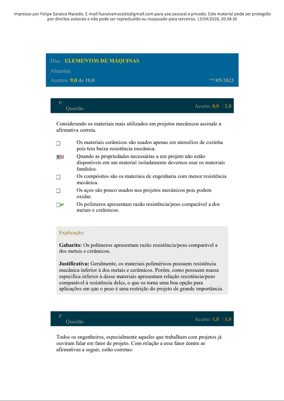 Impresso por Felipe Saraiva Macedo, E-mail para uso pessoal e privado. Este material pode ser protegido por direitos autorais e não pode ser reproduzido ou repassado para terceiros. 13/04/2026, 20:34:36 Disc.: ELEMENTOS DE MÁQUINAS Aluno(a): Acertos: 9,0 de 10,0 **/05/2023 Questão Acerto: 0,0 / 1,0 Considerando os materiais mais utilizados em projetos mecânicos assinale a afirmativa correta. Os materiais cerâmicos são usados apenas em utensílios de cozinha pois tem baixa resistência mecânica. Quando as propriedades necessárias a um projeto não estão disponíveis em um material isoladamente devemos usar os materiais fundidos. Os compósitos são os materiais de engenharia com menor resistência mecânica. Os aços são pouco usados nos projetos mecânicos pois podem oxidar. Os polímeros apresentam razão resistência/peso comparável a dos metais e cerâmicos. Explicação: Gabarito: Os polímeros apresentam razão resistência/peso comparável a dos metais e cerâmicos. Justificativa: Geralmente, os materiais poliméricos possuem resistência mecânica inferior à dos metais e cerâmicos. Porém, como possuem massa específica inferior à desse materiais apresentam relação resistência/peso comparável à resistência deles, o que os torna uma boa opção para aplicações em que o peso é uma restrição do projeto de grande importância. Questão Acerto: 1,0 / 1,0 Todos os engenheiros, especialmente aqueles que trabalham com projetos já ouviram falar em fator de projeto. Com relação a esse fator dentre as afirmativas a seguir, estão corretas:Impresso por Felipe Saraiva Macedo, E-mail fsaraivamacedo@gmail.com para uso pessoal e privado. Este material pode ser protegido por direitos autorais e não pode ser reproduzido ou repassado para terceiros. 13/04/2026, 20:34:36 I O fator de projeto é calculado ao final da fase de cálculo e depende das decisões tomadas e dos arredondamentos feitos. II O fator de projeto é definido pelo projetista para compensar as incertezas associadas às propriedades do material e às hipóteses simplificadoras adotadas. III Muita das vezes o fator de projeto é recomendado por associações profissionais ou empresariais, bem como em normas técnicas. Apenas I está correta. II e III estão corretas. I e II estão corretas. Apenas III está correta. Apenas II está correta. Explicação: Gabarito: II e III estão corretas. Justificativa: O fator de projeto é definido antes da fase se cálculos com a finalidade de compensar as incertezas associadas às propriedades dos materiais selecionados e às hipóteses simplificadoras. A decisão sobre seu valor depende da experiência do projetista ou sua equipe, mas, em muitos casos, será condicionada por recomendações de associações profissionais, produtores e normas técnicas. Acerto: 1,0 / 1,0 Questão A escolha dos critérios para análise de falha são um passo importante para o sucesso de um projeto mecânico. Acerca dos critérios de falha, assinale a alternativa correta com relação às alternativas abaixo. I O material utilizado não influencia a escolha do critério a utilizar; II Materiais dúcteis e frágeis falham de forma semelhante quando submetidos a carregamento estático; III Materiais frágeis sob carregamento estático falham devido à tensão normal; IV Na fratura sob carregamento estático, materiais dúcteis apresentam deformação plástica.Impresso por Felipe Saraiva Macedo, E-mail fsaraivamacedo@gmail.com para uso pessoal e privado. Este material pode ser protegido por direitos autorais e não pode ser reproduzido ou repassado para terceiros. 13/04/2026, 20:34:36 II, III e IV. III e IV. I, II e III. II e III. I e II. Explicação: Gabarito: III e IV. Justificativa: Os critérios de falhas devem ser selecionados de acordo com o tipo de carregamento (estático ou dinâmico) e, para o carregamento estático, em função do material (frágil ou dúctil), pois a fratura decorrente de carregamento estático é diferente em materiais dúcteis (geralmente devido ao cisalhamento e com grande deformação plástica) e frágeis (que falham devido à tensão normal ou axial, com pouquíssima ou nenhuma deformação plástica. Questão Acerto: 1,0 / 1,0 Considerando o diagrama de corpo livre da figura abaixo assinale a alternativa que apresenta o diagrama de esforço cortante (DEC) e o diagrama de momento fletor (DMF) corretos. Fonte: (BUDYNAS e NISBETT, 2011, pg 1020 a 1023) DEC DMF V MImpresso por Felipe Saraiva Macedo, E-mail para uso pessoal e privado. Este material pode ser protegido por direitos autorais e não pode ser reproduzido ou repassado para terceiros. 13/04/2026, 20:34:36 X DEC DMF V M + DEC DMF V M DEC DMF V M + + DEC DMF V M + + Explicação: Gabarito: DEC DMF V M + Justificativa: A partir do DCL apresentado vemos que há uma reação positiva no apoio do lado esquerdo de valor \(R_1\). Conforme caminhamos para a direita a partir desse apoio temos a carga uniformemente distribuída \(w\). O esforço cortante ao longo da viga pode ser calculado pela expressão \(V = {wl \over 2} wx\). A expressão do momento fletor é dada por \(M = {wlx \over 2} {wx^2 \over 2}\). Portanto o gráfico do esforço cortante éImpresso por Felipe Saraiva Macedo, E-mail fsaraivamacedo@gmail.com para uso pessoal e privado. Este material pode ser protegido por direitos autorais e não pode ser reproduzido ou repassado para terceiros. 13/04/2026, 20:34:36 uma reta com inclinação negativa variando de \over 2}\) a \over 2}\). Já o gráfico de momento fletor é uma parábola, saindo de 0 no apoio à esquerda e retornando ao valor nulo no apoio à direita devido à simetria do problema, com valor máximo em \({1 over 2}\). Acerto: 1,0 / 1,0 Questão Uma junta consiste de oito parafusos totalmente rosqueados de cabeça hexagonal M12 com \(L = 40\) (um parafuso mostrado na figura abaixo) unindo duas chapas do mesmo material, uma com espessura de \(20 mm\) e a outra com espessura de \(25 mm\).