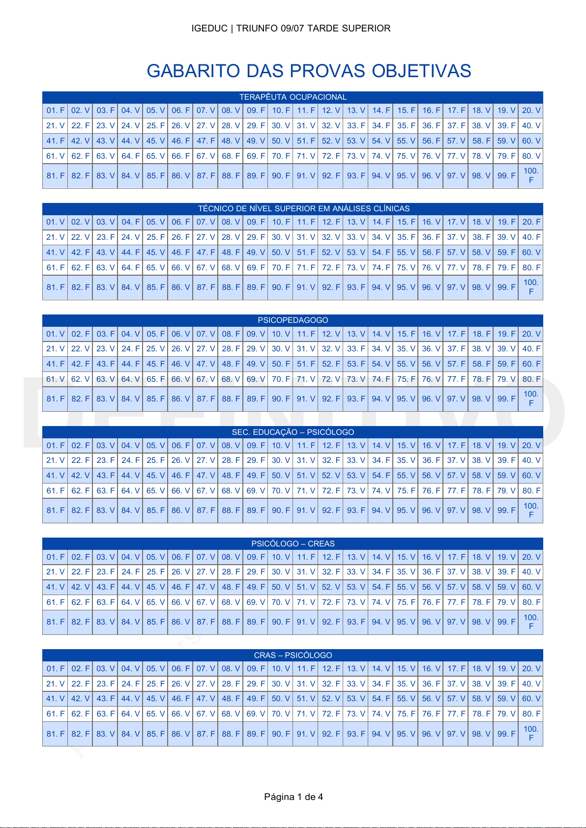 pcimarkpci MDAwMDowMDAwOjAwMDA6MDAwMDowMDAwOmZmZmY6YThlNDo1NmMz:TW9uLCAyNCBNYXIgMjAyNSAxMDoxMzozMiAtMDMwMA== www.pciconcursos.com.br DEFINITIVO IGEDUC | TRIUNFO 09/07 TARDE SUPERIOR Página 1 de 4 GABARITO DAS PROVAS OBJETIVAS TERAPÊUTA OCUPACIONAL 01. F 02. V 03. F 04. V 05. V 06. F 07. V 08. V 09. F 10. F 11. F 12. V 13. V 14. F 15. F 16. F 17. F 18. V 19. V 20. V 21. V 22. F 23. V 24. V 25. F 26. V 27. V 28. V 29. F 30. V 31. V 32. V 33. F 34. F 35. F 36. F 37. F 38. V 39. F 40. V 41. F 42. V 43. V 44. V 45. V 46. F 47. F 48. V 49. V 50. V 51. F 52. V 53. V 54. V 55. V 56. F 57. V 58. F 59. V 60. V 61. V 62. F 63. V 64. F 65. V 66. F 67. V 68. F 69. F 70. F 71. V 72. F 73. V 74. V 75. V 76. V 77. V 78. V 79. F 80. V 81. F 82. F 83. V 84. V 85. F 86. V 87. F 88. F 89. F 90. F 91. V 92. F 93. F 94. V 95. V 96. V 97. V 98. V 99. F 100. F TÉCNICO DE NÍVEL SUPERIOR EM ANÁLISES CLÍNICAS 01. V 02. V 03. V 04. F 05. V 06. F 07. V 08. V 09. F 10. F 11. F 12. F 13. V 14. F 15. F 16. V 17. V 18. V 19. F 20. F 21. V 22. V 23. F 24. V 25. F 26. F 27. V 28. V 29. F 30. V 31. V 32. V 33. V 34. V 35. F 36. F 37. V 38. F 39. V 40. F 41. V 42. F 43. V 44. F 45. V 46. F 47. F 48. F 49. V 50. V 51. F 52. V 53. V 54. F 55. V 56. F 57. V 58. V 59. F 60. V 61. F 62. F 63. V 64. F 65. V 66. V 67. V 68. V 69. F 70. F 71. F 72. F 73. V 74. F 75. V 76. V 77. V 78. F 79. F 80. F 81. F 82. F 83. V 84. V 85. F 86. V 87. F 88. F 89. F 90. F 91. V 92. F 93. F 94. V 95. V 96. V 97. V 98. V 99. F 100. F PSICOPEDAGOGO 01. V 02. F 03. F 04. V 05. F 06. V 07. V 08. F 09. V 10. V 11. F 12. V 13. V 14. V 15. F 16. V 17. F 18. F 19. F 20. V 21. V 22. V 23. V 24. F 25. V 26. V 27. V 28. F 29. V 30. V 31. V 32. V 33. F 34. V 35. V 36. V 37. F 38. V 39. V 40. F 41. F 42. F 43. F 44. F 45. F 46. V 47. V 48. F 49. V 50. F 51. F 52. F 53. F 54. V 55. V 56. V 57. F 58. F 59. F 60. F 61. V 62. V 63. V 64. V 65. F 66. V 67. V 68. V 69. V 70. F 71. V 72. V 73. V 74. F 75. F 76. V 77. F 78. F 79. V 80. F 81. F 82. F 83. V 84. V 85. F 86. V 87. F 88. F 89. F 90. F 91. V 92. F 93. F 94. V 95. V 96. V 97. V 98. V 99. F 100. F SEC. EDUCAÇÃO – PSICÓLOGO 01. F 02. F 03. V 04. V 05. V 06. F 07. V 08. V 09. F 10. V 11. F 12. F 13. V 14. V 15. V 16. V 17. F 18. V 19. V 20. V 21. V 22. F 23. F 24. F 25. F 26. V 27. V 28. F 29. F 30. V 31. V 32. F 33. V 34. F 35. V 36. F 37. V 38. V 39. F 40. V 41. V 42. V 43. F 44. V 45. V 46. F 47. V 48. F 49. F 50. V 51. V 52. V 53. V 54. F 55. V 56. V 57. V 58. V 59. V 60. V 61. F 62. F 63. F 64. V 65. V 66. V 67. V 68. V 69. V 70. V 71. V 72. F 73. V 74. V 75. F 76. F 77. F 78. F 79. V 80. F 81. F 82. F 83. V 84. V 85. F 86. V 87. F 88. F 89. F 90. F 91. V 92. F 93. F 94. V 95. V 96. V 97. V 98. V 99. F 100. F PSICÓLOGO – CREAS 01. F 02. F 03. V 04. V 05. V 06. F 07. V 08. V 09. F 10. V 11. F 12. F 13. V 14. V 15. V 16. V 17. F 18. V 19. V 20. V 21. V 22. F 23. F 24. F 25. F 26. V 27. V 28. F 29. F 30. V 31. V 32. F 33. V 34. F 35. V 36. F 37. V 38. V 39. F 40. V 41. V 42. V 43. F 44. V 45. V 46. F 47. V 48. F 49. F 50. V 51. V 52. V 53. V 54. F 55. V 56. V 57. V 58. V 59. V 60. V 61. F 62. F 63. F 64. V 65. V 66. V 67. V 68. V 69. V 70. V 71. V 72. F 73. V 74. V 75. F 76. F 77. F 78. F 79. V 80. F 81. F 82. F 83. V 84. V 85. F 86. V 87. F 88. F 89. F 90. F 91. V 92. F 93. F 94. V 95. V 96. V 97. V 98. V 99. F 100. F CRAS – PSICÓLOGO 01. F 02. F 03. V 04. V 05. V 06. F 07. V 08. V 09. F 10. V 11. F 12. F 13. V 14. V 15. V 16. V 17. F 18. V 19. V 20. V 21. V 22. F 23. F 24. F 25. F 26. V 27. V 28. F 29. F 30. V 31. V 32. F 33. V 34. F 35. V 36. F 37. V 38. V 39. F 40. V 41. V 42. V 43. F 44. V 45. V 46. F 47. V 48. F 49. F 50. V 51. V 52. V 53. V 54. F 55. V 56. V 57. V 58. V 59. V 60. V 61. F 62. F 63. F 64. V 65. V 66. V 67. V 68. V 69. V 70. V 71. V 72. F 73. V 74. V 75. F 76. F 77. F 78. F 79. V 80. F 81. F 82. F 83. V 84. V 85. F 86. V 87. F 88. F 89. F 90. F 91. V 92. F 93. F 94. V 95. V 96. V 97. V 98. V 99. F 100. F pcimarkpci MDAwMDowMDAwOjAwMDA6MDAwMDowMDAwOmZmZmY6YThlNDo1NmMz:TW9uLCAyNCBNYXIgMjAyNSAxMDoxMzozMiAtMDMwMA== www.pciconcursos.com.br DEFINITIVO IGEDUC | TRIUNFO 09/07 TARDE SUPERIOR Página 2 de 4 PSICÓLOGO 01. F 02. F 03. V 04. V 05. V 06. F 07. V 08. V 09. F 10. V 11. F 12. F 13. V 14. V 15. V 16. V 17. F 18. V 19. V 20. V 21. V 22. F 23. F 24. F 25. F 26. V 27. V 28. F 29. F 30. V 31. V 32. F 33. V 34. F 35. V 36. F 37. V 38. V 39. F 40. V 41. V 42. V 43. F 44. V 45. V 46. F 47. V 48. F 49. F 50. V 51. V 52. V 53. V 54. F 55. V 56. V 57. V 58. V 59. V 60. V 61. F 62. F 63. F 64. V 65. V 66. V 67. V 68. V 69. V 70. V 71. V 72. F 73. V 74. V 75. F 76. F 77. F 78. F 79. V 80. F 81. F 82. F 83. V 84. V 85. F 86. V 87. F 88. F 89. F 90. F 91. V 92. F 93. F 94. V 95. V 96. V 97. V 98. V 99. F 100. F PROFISSIONAL DE EDUCAÇÃO FÍSICA 01. F 02. F 03. F 04. F 05. F 06. V 07. F 08. V 09. V 10. F 11. V 12. V 13. V 14. F 15. V 16. F 17. F 18. V 19. V 20. V 21. V 22. F 23. V 24. F 25. F 26. F 27. F 28. V 29. F 30. F 31. V 32. V 33. V 34. V 35. F 36. V 37. F 38. V 39. V 40. F 41. F 42. F 43. V 44. V 45. F 46. V 47. F 48. F 49. V 50. V 51. F 52. F 53. F 54. V 55. V 56. V 57. V 58. V 59. F 60. V 61. V 62. V 63. F 64. F 65. F 66. F 67. F 68. V 69. F 70. V 71. V 72. F 73. F 74. V 75. V 76. F 77. V 78. F 79. V 80. V 81. F 82. F 83. V 84. V 85. F 86. V 87. F 88. F 89. F 90. F 91. V 92. F 93. F 94. V 95. V 96. V 97. V 98. V 99. F 100. F ODONTÓLOGO – PSF 01. V 02. F 03. V 04. V 05. F 06. V 07. V 08. F 09. V 10. F 11. F 12. F 13. V 14. V 15. V 16. V 17. V 18. V 19. V 20. F 21. V 22. F 23. V 24. V 25. F 26. F 27. V 28. F 29. F 30. F 31. F 32. F 33. V 34. V 35. V 36. V 37. V 38. F 39. F 40. V 41. F 42. V 43. F 44. V 45. F 46. V 47. F 48. F 49. F 50. V 51. F 52. V 53. F 54. V 55. F 56. F 57. V 58. V 59. F 60. V 61. F 62. F 63. V 64. F 65. F 66. F 67. V 68. V 69. F 70. F 71. V 72. V 73. V 74. F 75. V 76. F 77. F 78. V 79. V 80. F 81. F 82. F 83. V 84. V 85. F 86. V 87. F 88. F 89. F 90. F 91