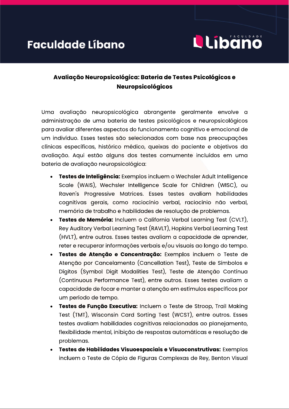 FACULDADE Faculdade Líbano Libano Avaliação Neuropsicológica: Bateria de Testes Psicológicos e Neuropsicológicos Uma avaliação neuropsicológica abrangente geralmente envolve a administração de uma bateria de testes psicológicos e neuropsicológicos para avaliar diferentes aspectos do funcionamento cognitivo e emocional de um indivíduo. Esses testes são selecionados com base nas preocupações clínicas específicas, histórico médico, queixas do paciente e objetivos da avaliação. Aqui estão alguns dos testes comumente incluídos em uma bateria de avaliação neuropsicológica: Testes de Inteligência: Exemplos incluem Wechsler Adult Intelligence Scale (WAIS), Wechsler Intelligence Scale for Children (WISC), ou Raven's Progressive Matrices. Esses testes avaliam habilidades cognitivas gerais, como raciocínio verbal, raciocínio não verbal, memória de trabalho e habilidades de resolução de problemas. Testes de Memória: Incluem California Verbal Learning Test (CVLT), Rey Auditory Verbal Learning Test (RAVLT), Hopkins Verbal Learning Test (HVLT), entre outros. Esses testes avaliam a capacidade de aprender, reter e recuperar informações verbais e/ou visuais ao longo do tempo. Testes de Atenção e Concentração: Exemplos incluem Teste de Atenção por Cancelamento (Cancellation Test), Teste de Símbolos e Dígitos (Symbol Digit Modalities Test), Teste de Atenção Contínua (Continuous Performance Test), entre outros. Esses testes avaliam a capacidade de focar e manter a atenção em estímulos específicos por um período de tempo. Testes de Função Executiva: Incluem Teste de Stroop, Trail Making Test Wisconsin Card Sorting Test (WCST), entre outros. Esses testes avaliam habilidades cognitivas relacionadas ao planejamento, flexibilidade mental, inibição de respostas automáticas e resolução de problemas. Testes de Habilidades Visuoespaciais e Visuoconstrutivas: Exemplos incluem Teste de Cópia de Figuras Complexas de Rey, Benton VisualFACULDADE Faculdade Líbano Libano Retention Test (BVRT), entre outros. Esses testes avaliam a capacidade de perceber, interpretar e reproduzir informações visuais e espaciais. Testes de Linguagem: Incluem Boston Naming Test (BNT), Teste de Fluência Verbal, Teste de Compreensão Auditiva, entre outros. Esses testes avaliam habilidades linguísticas, como vocabulário, fluência verbal, compreensão auditiva e expressão verbal. Além desses testes, uma avaliação neuropsicológica completa também pode incluir medidas de funcionamento emocional, comportamental e psicossocial, como inventários de sintomas de depressão, ansiedade e avaliação de habilidades adaptativas. seleção específica dos testes depende das necessidades do paciente, do quadro clínico e dos objetivos da avaliação. Os resultados dos testes são interpretados à luz do histórico médico e clínico do paciente para ajudar a formular um diagnóstico diferencial e um plano de tratamento adequado. avaliação neuropsicológica é um processo detalhado que envolve a utilização de uma variedade de testes psicológicos e neuropsicológicos para avaliar as funções cognitivas, emocionais e comportamentais de uma pessoa. Essa avaliação é geralmente realizada por um neuropsicólogo, que é um profissional especializado na intersecção entre psicologia e neurociência. Existem várias baterias de testes psicológicos e neuropsicológicos que podem ser usadas em uma avaliação neuropsicológica, e a seleção específica depende das queixas ou áreas de preocupação do paciente, bem como dos objetivos da avaliação. Alguns dos testes comuns incluem: 1. WISC-IV Função Avaliada: Escala Wechsler de Inteligência para Crianças, permite a avaliação da inteligência geral, em alguns subdomínios (habilidade verbal e de execução) e fornece a medida de QI. Público-alvo: Crianças e Adolescentes de 06 a 16 anos.FACULDADE Faculdade Líbano Libano Escala Wechsler IV é uma das versões mais recentes da Wechsler Intelligence Scale for Children, desenvolvida por David Wechsler. Ela foi projetada para avaliar a inteligência em crianças e adolescentes, com idades entre 6 e 16 anos e 11 meses. WISC-IV foi publicada em 2003, substituindo a versão anterior, a WISC-III. Assim como suas predecessoras, a WISC-IV é composta por uma série de subtestes que avaliam diferentes aspectos da inteligência. Estes subtestes são organizados em quatro índices principais: Índice de Compreensão Verbal: Avalia habilidades verbais, incluindo compreensão verbal, raciocínio verbal e fluência verbal. Índice de Raciocínio Perceptivo: Avalia habilidades não verbais, como raciocínio visual, organização perceptiva e capacidade de resolver problemas visuais. Índice de Memória de Trabalho: Avalia a capacidade de manter e manipular informações na memória de curto prazo, bem como a atenção seletiva. Índice de Velocidade de Processamento: Avalia a rapidez com que a criança pode processar informações simples e realizar tarefas de forma eficiente. Além desses índices principais, a WISC-IV fornece um Quociente de Inteligência Total (QIT), que é uma medida da habilidade cognitiva geral da criança. WISC-IV foi projetada para fornecer uma avaliação abrangente das habilidades cognitivas da criança, ajudando os profissionais a identificar áreas de força e fraqueza, bem como a planejar intervenções educacionais e terapêuticas adequadas. Como sempre, a interpretação dos resultados deve ser realizada por um profissional treinado e experiente na administração e interpretação dos testes psicológicos. 2. WAIS-III Função Avaliada:FACULDADE Faculdade Líbano Libano Escala Wechsler de Inteligência para Adultos, permite a avaliação da inteligência geral, em alguns subdomínios (habilidade verbal e de execução) e fornece a medida de QI. Público-alvo: Adolescentes e Adultos de 16 a 89 anos. Wechsler Adult Intelligence Scale Third Edition (WAIS-III) é uma