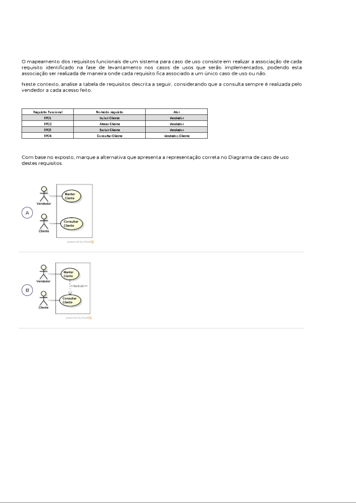 mapeamento dos requisitos funcionais de um sistema para caso de consiste em realizar a associação de cada requisito identificado na fase de levantamento nos casos de que serão podendo esta associação ser realizada de maneira onde cada requisito fica associado a um único caso de ou não. Neste contexto, analise a tabela de requisitos descrita a seguir, considerando que a consulta sempre é realizada pelo vendedor a cada acesso feito. Requisito Funcional requisito Ator Incluir Cliente Vendedor Cliente Excluir Cliente RF04 Consultar Cliente Vendedo Cliente Com base no marque a alternativa que apresenta a representação correta no Diagrama de caso de destes requisitos. Manter Clente Vendedor A Consultar Cliente Cliente powered by Manter Vendedor Consultar Cliente Cliente powered byManter Ciente Vendedor C Consultar Cliente Cliente powered by Manter Vendedor Consultar Cliente powered by Manter Ciente Vendedor E Consultar Cliente Cliente powered by
