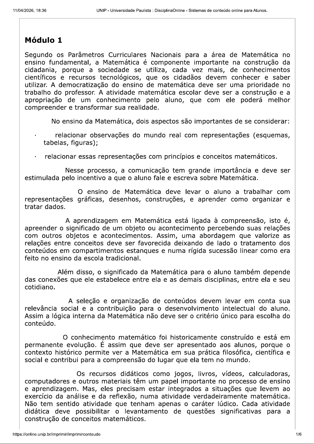 11/04/2026, 18:36 UNIP Universidade Paulista DisciplinaOnline Sistemas de conteúdo online para Alunos. Módulo 1 Segundo os Parâmetros Curriculares Nacionais para a área de Matemática no ensino fundamental, a Matemática é componente importante na construção da cidadania, porque a sociedade se utiliza, cada vez mais, de conhecimentos científicos e recursos tecnológicos, que os cidadãos devem conhecer e saber utilizar. A democratização do ensino de matemática deve ser uma prioridade no trabalho do professor. A atividade matemática escolar deve ser a construção e a apropriação de um conhecimento pelo aluno, que com ele poderá melhor compreender e transformar sua realidade. No ensino da Matemática, dois aspectos são importantes de se considerar: relacionar observações do mundo real com representações (esquemas, tabelas, figuras); relacionar essas representações com princípios e conceitos matemáticos. Nesse processo, a comunicação tem grande importância e deve ser estimulada pelo incentivo a que aluno fale e escreva sobre Matemática. ensino de Matemática deve levar aluno a trabalhar com representações gráficas, desenhos, construções, e aprender como organizar e tratar dados. A aprendizagem em Matemática está ligada à compreensão, isto é, apreender significado de um objeto ou acontecimento percebendo suas relações com outros objetos e acontecimentos. Assim, uma abordagem que valorize as relações entre conceitos deve ser favorecida deixando de lado tratamento dos conteúdos em compartimentos estanques e numa rígida sucessão linear como era feito no ensino da escola tradicional. Além disso, significado da Matemática para aluno também depende das conexões que ele estabelece entre ela e as demais disciplinas, entre ela e seu cotidiano. A seleção e organização de conteúdos devem levar em conta sua relevância social e a contribuição para desenvolvimento intelectual do aluno. Assim a lógica interna da Matemática não deve ser critério único para escolha do conteúdo. conhecimento matemático foi historicamente construído e está em permanente evolução. É assim que deve ser apresentado aos alunos, porque o contexto histórico permite ver a Matemática em sua prática filosófica, científica e social e contribui para a compreensão do lugar que ela tem no mundo. Os recursos didáticos como jogos, livros, vídeos, calculadoras, computadores e outros materiais têm um papel importante no processo de ensino e aprendizagem. Mas, eles precisam estar integrados a situações que levem ao exercício da análise e da reflexão, numa atividade verdadeiramente matemática. Não tem sentido atividade que tenham apenas caráter lúdico. Cada atividade didática deve possibilitar levantamento de questões significativas para a construção de conceitos matemáticos. 1/611/04/2026, 18:36 UNIP Universidade Paulista DisciplinaOnline Sistemas de conteúdo online para Alunos. A avaliação é parte do processo de ensino e aprendizagem. Ela contempla vários aspectos relativos ao desempenho dos alunos, como aquisição de conceitos, domínio de procedimentos e desenvolvimento de atitudes. A evolução do ensino de Matemática Nos últimos anos, vêm ocorrendo no Brasil e em outros países, discussões cujo objetivo tem sido adequar trabalho escolar a uma nova realidade, marcada pela crescente presença da Matemática em diversos campos da atividade humana. Para melhor compreender este movimento é importante rever a trajetória das reformas curriculares ocorridas nos últimos anos e fazer uma breve analise da situação atual do ensino de Matemática no Brasil. Nas décadas de 60/70, ensino de Matemática, em diferentes países, foi influenciado pela Matemática Moderna. A Matemática Moderna nasceu como um movimento educacional inscrito numa política de modernização econômica e foi posta na linha de frente por se considerar que, juntamente com a área de Ciências Naturais, ela se constituía via de acesso privilegiada para pensamento científico e tecnológico. De acordo com o pensamento da época, a Matemática a ser ensinada era aquela concebida como lógica, compreendida a partir das estruturas, valorizando a linguagem matemática. Os formuladores dos currículos dessa época insistiam na necessidade de uma reforma pedagógica, incluindo a pesquisa de materiais novos e métodos de ensino renovados, resultando na ênfase dada à Didática da Matemática. Este movimento que aproximou a Matemática escolar da Matemática pura, centrando ensino nas estruturas e fazendo uso de uma linguagem unificadora, deixou de considerar um fator muito importante que gerou seu maior problema: tipo de ensino que se propunha estava fora do alcance dos alunos, principalmente nas séries iniciais do ensino fundamental, porque passou a ter preocupações excessivas com abstrações internas à própria Matemática, valorizando mais a teoria do que a prática. A linguagem da teoria dos conjuntos, por exemplo, foi introduzida com tal ênfase que a aprendizagem de símbolos e o excesso de formalismo comprometiam a compreensão dos conceitos em conteúdos relacionados ao cálculo, à geometria e às medidas. No Brasil, a Matemática Moderna foi veiculada principalmente pelos livros didáticos e teve grande influência no ensino que se fazia nas escolas. movimento Matemática Moderna esmoreceu a partir da constatação da inadequação de alguns de seus princípios e das distorções ocorridas na sua implantação. Atividade 1: Você, futuro professor, deve se lembrar desses fatos descritos acima, pois conviveu com eles em sua época de estudante no ensino fundamental, não é mesmo? Reflita como era para você este tipo de ensino de Matemática. Pense nos pontos positivo e negativos, pois a sua experiência passada também pode ajudá-lo na sua formação de professor. Em 1980, surge documento "Agenda para Ação", publicado pelo National Council of Teachers of Mathema