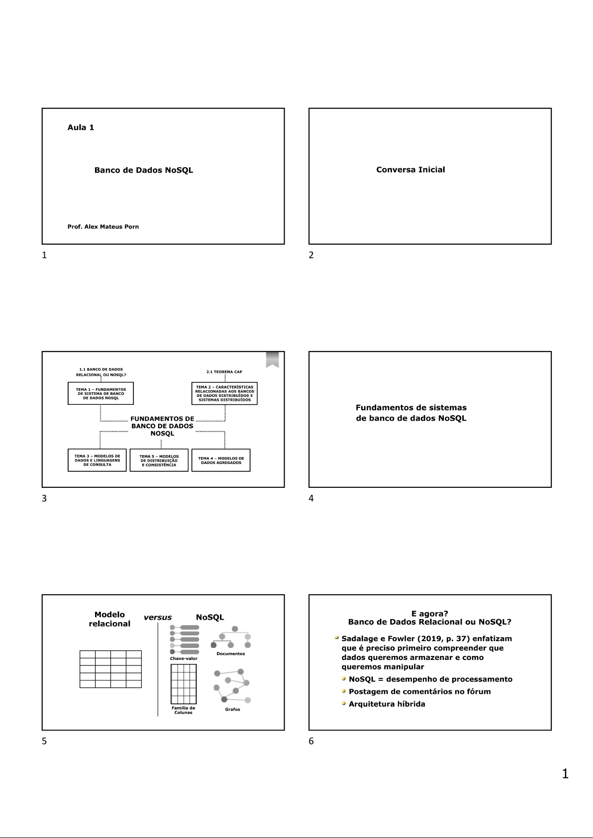 Aula 1 Banco de Dados NoSQL Conversa Inicial Prof. Alex Mateus Porn 1 2 1.1 BANCO DE DADOS 2.1 TEOREMA CAP RELACIONAL OU NOSQL? TEMA CARACTERÍSTICAS TEMA FUNDAMENTOS AOS BANCOS DE SISTEMA DE BANCO DE DADOS DISTRIBUÍDOS E DE DADOS NOSQL SISTEMAS DISTRIBUÍDOS Fundamentos de sistemas FUNDAMENTOS DE de banco de dados NoSQL BANCO DE DADOS NOSQL TEMA MODELOS DE TEMA MODELOS TEMA MODELOS DE DADOS LINGUAGENS DE DISTRIBUIÇÃO DADOS AGREGADOS DE CONSULTA E CONSISTÊNCIA 3 4 Modelo versus NoSQL E agora? relacional Banco de Dados Relacional ou NoSQL? Sadalage e Fowler (2019, 37) enfatizam que é preciso primeiro compreender que Documentos Chave-valor dados queremos armazenar e como queremos manipular NoSQL = desempenho de processamento Postagem de comentários no fórum Arquitetura híbrida Família de Grafos Colunas 5 6 1Banco de Dados Relacional Banco de Dados NoSQL Aplicações descentralizadas, por Aplicações centralizadas, por exemplo, Web, Mobile, Big Data, exemplo, ERP, CRM. Iot. Requerem alta disponibilidade, A disponibilidade precisa ser quando necessário. contínua, sem interrupção. Características relacionadas Dados são gerados em Dados gerados em alta aos bancos de dados velocidades moderadas. velocidade, por exemplo, Dados gerados a partir de sensores. poucas fontes. Dados gerados a partir de múltiplas fontes, semi ou não Dados estruturados. estruturados. Transações complexas. Moderado volume de dados. Transações simples. Alto volume de dados. 7 8 Características relacionadas aos bancos de Teorema CAP dados distribuídos e sistemas distribuídos Disponibilidade, para compartilhamento dos dados e Manter consistência após a execução de uma escalabilidade, em virtude do contínuo aumento do volume operação destas bases Disponibilidade do sistema mantê-lo em Escalabilidade horizontal operação sistema distribuído é expandido, adicionando Sistema em funcionamento mesmo que por nodos para armazenamento e processamento falhas ocorra a partição de nodos de dados à medida que volume de dados aumenta 9 10 Consistência Disponibilidade Todos clientes sistema continua a veem dados atuais, CA operar conforme independentemente esperado, mesmo de atualizações ou com falhas nos nós exclusões N/A Modelos de dados e linguagens de consulta CP AP Tolerância partições sistema continua a operar conforme esperado, apesar das falhas na rede ou nas mensagens 11 12 2Modelos de dados Linguagem de consulta Não utilizam esquema Vantagem Dados semiestruturados, aceitando novos dados Não podem realizar consultas com tantas sem realizar alterações condições e restrições na estrutura do banco Desvantagem Mariyani Sugianto, Shutterstock Não há integridade de dados 13 14 Modelo em que banco organiza os seus Modelos de dados agregados dados Categorias chave-valor, documento e família de colunas 15 16 Modelo relacional para um website de comércio eletrônico Agregação de dados para um website de comércio eletrônico /em Clientes Cliente Pedido "id":1, Id Nome Id ClienteId EnderecoEntregaId "nome" "enderecoCobranca" [{"Cidade" "Chicago"}] 1 Martin 99 1 77 } Produto EnderecoCobranca em Pedidos Id Nome Id ClienteId EndecoCobranca "id" :99, 27 NoSQL Distilled 55 1 77 "clienteId" :1, "itemPedido":[ ItemPedido Endereco "produtoId" :27, "preco" Id PedidoId ProdutoId Preco Id Cidade "produtoNome" "NoSQL Distilled" 100 99 27 32.45 77 Chicago "Cidade" "Chicago"}] "pagamentoPedido" { PagamentoPedido "numeroCartao" "1000-1000", "txnId" "abelif879rft" EnderecoCobranc Id PedidoId NumeroCartao txnId "enderecoCobranca" {"Cidade": "Chicago"} aId 33 99 1000-1000 55 abelif879rft Fonte: Sadalage Fowler, 2019, 45 17 18 3Não há uma regra universal para determinar as agregações, depende de como os dados Composto por um conjunto de objetos serão manipulados relacionados que são tratados como uma Uma única agregação do exemplo anterior unidade, facilitando a execução no cluster indica que todos os pedidos do cliente serão Quanto mais agregados estiverem os dados, acessados ao mesmo tempo menor será número de nodos, melhorando A agregação em duas partes possibilita a execução de dados pelo cluster acessar um pedido por vez 19 20 Modelo de distribuição Não use distribuição! Modelos de distribuição Um único servidor é mais facilmente e consistência gerenciado e menos complexo para os desenvolvedores Usar quando: Escalabilidade Melhoria de desempenho 21 22 Fragmentação Quanto mais agregado estiverem os dados, Copia os mesmos dados em múltiplos nodos menor será número de nodos, melhorando Distribuição a execução de dados pelo cluster Replicação Coloca dados diferentes em nodos diferentes 23 24 4Fragmentação Escalabilidade horizontal, direcionando acesso a diferentes partes de dados em Ambas as técnicas podem ser usadas de diferentes servidores forma isolada ou em conjunto Cada servidor desempenha papel de gerenciar um subconjunto de dados, que representa um fragmento, qual lê e grava seu próprio dado 25 26 Fragmentação c modelo de dados deve ser projetado com a agregação mais adequada Cada segmento lê e grava possível, possibilitando os seus próprios dados ao servidor encontrar a maior parte dos dados em um nodo Shutterstock Fonte: Elaborado com base em Sadalage Fowler, 2019, 75 27 28 Replicação Replicação mestre-escravo Mestre Copia os dados para múltiplos servidores, Todas as permitindo acesso aos dados em múltiplos atualizações são feitas no mestre As leituras podem lugares ser feitas no mestre As alterações se ou no escravo propagam para Diminui tempo de recuperação de os escravos informações e propicia escalabilidade Replicação Mestre-escravo e ponto a ponto Escravos Fonte: Elaborado com base em Sadalage Fowler, 2019, 78 29 30 5Replicação ponto a ponto Consistência Teorema CAP Distribuído = tolerância a partição Todos os nodos leem gravam Consistência eventual Os nodos todos dados comunicam suas gravações Criar recurso