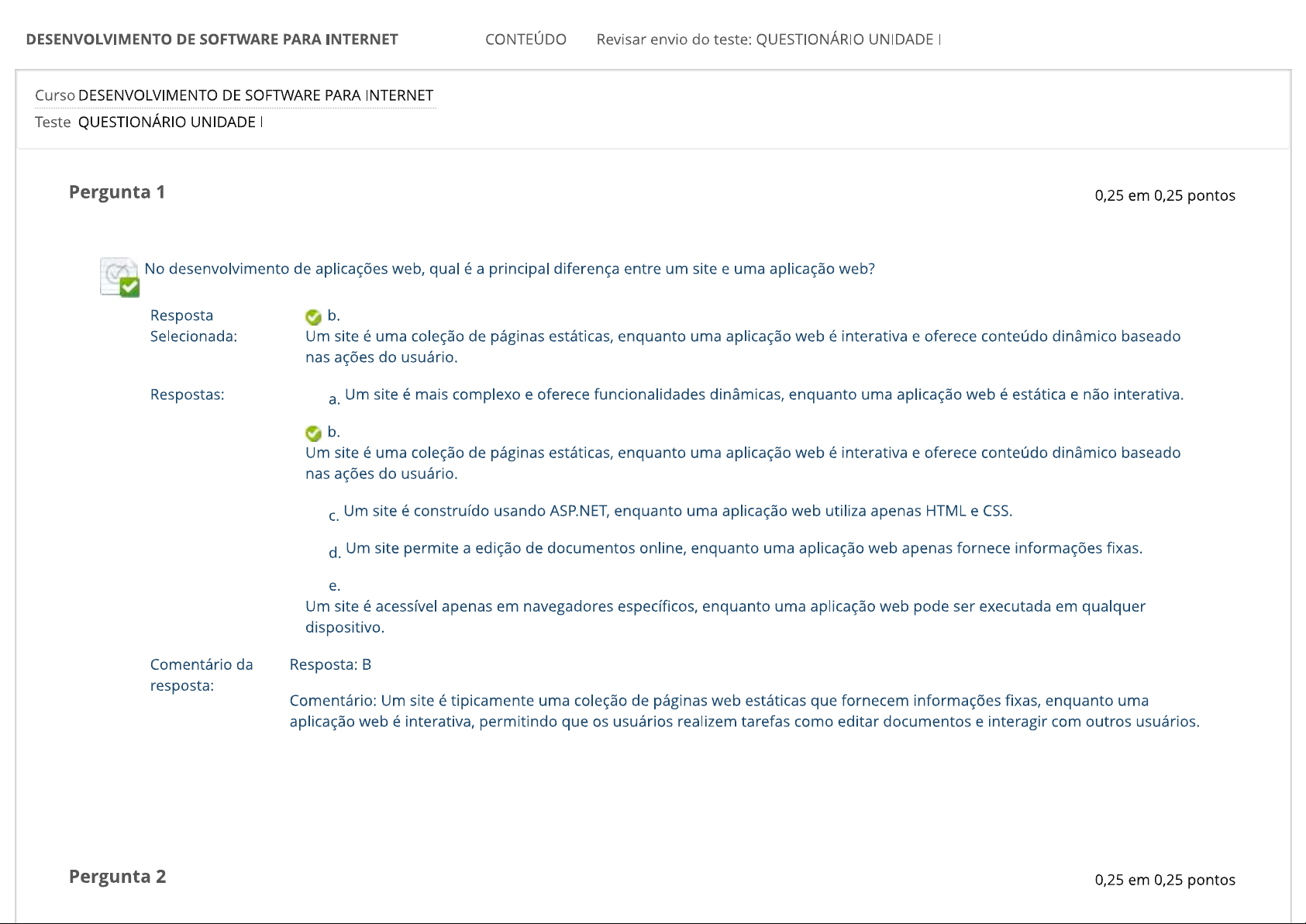 DESENVOLVIMENTO DE SOFTWARE PARA INTERNET CONTEÚDO Revisar envio do teste: QUESTIONÁRIO UNIDADE Curso DESENVOLVIMENTO DE SOFTWARE PARA INTERNET Teste QUESTIONÁRIO UNIDADE Pergunta 1 0,25 em 0,25 pontos No desenvolvimento de aplicações web, qual é a principal diferença entre um site e uma aplicação web? Resposta b. Selecionada: Um site é uma coleção de páginas estáticas, enquanto uma aplicação web é interativa e oferece conteúdo dinâmico baseado nas ações do usuário. Respostas: a. Um site é mais complexo e oferece funcionalidades dinâmicas, enquanto uma aplicação web é estática e não interativa. b. Um site é uma coleção de páginas estáticas, enquanto uma aplicação web é interativa e oferece conteúdo dinâmico baseado nas ações do usuário. C. Um site é construído usando ASP.NET, enquanto uma aplicação web utiliza apenas HTML e CSS. d. Um site permite a edição de documentos online, enquanto uma aplicação web apenas fornece informações fixas. e. Um site é acessível apenas em navegadores específicos, enquanto uma aplicação web pode ser executada em qualquer dispositivo. Comentário da Resposta: resposta: Comentário: Um site é tipicamente uma coleção de páginas web estáticas que fornecem informações fixas, enquanto uma aplicação web é interativa, permitindo que os usuários realizem tarefas como editar documentos e interagir com outros usuários. Pergunta 2 0,25 em 0,25 pontosque é uma API no contexto do desenvolvimento de aplicações web? Resposta Selecionada: b. Um conjunto de regras e ferramentas para construir e integrar software de aplicações. Respostas: a. Um tipo de banco de dados usado para armazenar dados da aplicação. b. Um conjunto de regras e ferramentas para construir e integrar software de aplicações. C. Um serviço que hospeda sites estáticos na web. d. Uma linguagem de programação usada para desenvolver aplicações web. e. Um protocolo de segurança para proteger dados durante a transmissão. Comentário da Resposta: resposta: Comentário: Uma API (Interface de Programação de Aplicações) é um conjunto de regras, protocolos e ferramentas para construir software e permitir que diferentes aplicações se comuniquem entre si. Pergunta 3 0,25 em 0,25 pontos Qual é a função principal do middleware em uma aplicação ASP.NET Core? Resposta Selecionada: C. Inserir lógica customizada no pipeline de processamento de requisições HTTP. Respostas: a. Gerenciar a autenticação e autorização de usuários. b. Servir arquivos estáticos como HTML, CSS e JavaScript. C. Inserir lógica customizada no pipeline de processamento de requisições HTTP. d. Configurar ambiente de desenvolvimento da aplicação. e. Realizar a compilação e execução da aplicação em modo de depuração. Comentário da Resposta: resposta:Comentário: middleware permite a inserção de lógica customizada no pipeline de processamento de requisições facilitando a implementação de funcionalidades como autenticação e autorização. Pergunta 4 0,25 em 0,25 pontos Qual é uma vantagem importante do ASP.NET Core em relação ao ASP.NET Framework? Resposta Selecionada: C. O ASP.NET Core oferece suporte para desenvolvimento multiplataforma. Respostas: a. ASP.NET Core suporta apenas a linguagem de programação C#. b. ASP.NET Core é restrito ao sistema operacional Windows. C. ASP.NET Core oferece suporte para desenvolvimento multiplataforma. d. O ASP.NET Core não suporta a criação de APIs RESTful. e. ASP.NET Core não possui integração com bibliotecas de terceiros. Comentário da Resposta: resposta: Comentário: Uma das principais vantagens do ASP.NET Core é sua capacidade multiplataforma, permitindo que aplicações web sejam desenvolvidas e executadas em Windows, Linux e macOS. Pergunta 5 0,25 em 0,25 pontos que caracteriza uma aplicação web dinâmica? Resposta Selecionada: d. Adapta o conteúdo exibido com base nas ações e interações do usuário, utilizando tecnologias de servidor. Respostas: a. Utiliza apenas HTML e CSS para apresentar conteúdo.b. Não interage com usuário e não muda de acordo com suas ações. C. Fornece conteúdo fixo que não muda, independentemente da interação do usuário. d. Adapta o conteúdo exibido com base nas ações e interações do usuário, utilizando tecnologias de servidor. e. Não requer a instalação de um servidor web para funcionar. Comentário da Resposta: D resposta: Comentário: Uma aplicação web dinâmica adapta conteúdo exibido com base nas ações e interações do usuário, utilizando tecnologias de servidor como ASP.NET, PHP, Java, ou Node.js. Pergunta 6 0,25 em 0,25 pontos Qual é a principal função do arquivo appsettings.json em um projeto ASP.NET Core? Resposta Selecionada: d. Armazenar as configurações da aplicação, como strings de conexão e configurações de ambiente. Respostas: a. Armazenar os controladores e modelos da aplicação. b. Configurar os serviços e pipeline de processamento de requisições. C. Gerenciar as dependências e bibliotecas do projeto. d. Armazenar as configurações da aplicação, como strings de conexão e configurações de ambiente. e. Facilitar a integração com serviços externos como APIs de terceiros. Comentário da Resposta: D resposta: Comentário: arquivo appsettings.json armazena as configurações da aplicação, como strings de conexão e configurações de ambiente, permitindo uma gestão centralizada e flexível das configurações.Pergunta 7 0,25 em 0,25 pontos Quais são os elementos fundamentais do design web que garantem a criação de sites visualmente agradáveis e funcionais? Resposta Selecionada: a. Tipografia, paleta de cores, hierarquia visual e usabilidade. Respostas: a. Tipografia, paleta de cores, hierarquia visual e usabilidade. b. Tipografia, hierarquia visual, acessibilidade e otimização de imagens. C. Paleta de cores, hierarquia visual, otimização de imagens e responsividade. d. Hiera