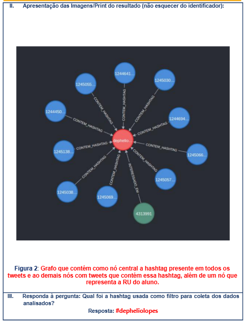 II. Apresentação das Imagens/Print do resultado (não esquecer do identificador): 1244641 1245030 1245055 1244450 CONTEM CONTEM_HASHTAG 1244694 HASHTAG HASHTAG CONTEM 1245138 CONTEM 1245066 CONTEM 1245057 1245038 1245069 4313991 Figura 2: Grafo que contém como central a hashtag presente em todos tweets e ao demais com tweets que contém essa hashtag, além de um no que representa a RU do aluno. III. Responda à pergunta: Qual foi a hashtag usada como filtro para coleta dos dados analisados? Resposta: #depheliolopes
