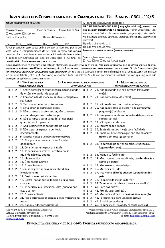 INVENTÁRIO DOS COMPORTAMENTOS DE CRIANÇAS ENTRE 1½ E 5 ANOS CBCL 1½/5 NOME COMPLETO DA CRIANÇA: ID (para uso exclusivo do aplicador): TIPO DE TRABALHO DOS PAIS (ocupação habitual), mesmo que SEXO DA CRIANÇA IDADE DA CRIANÇA ETNIA E COR DE PELE não estejam trabalhando no momento. (Favor, especificar por MASCULINO FEMININO exemplo: mecânico de automóveis, professor(a) de ensino DATA DA AVALIAÇÃO: DATA DE NASCIMENTO: médio, dona de casa, operário, vendedor de sapato, sargento do exército). DIA MÊS ANO DIA MÊS Tipo de trabalho do Favor preencher esse questionário de acordo com seu ponto de Tipo de trabalho da mãe: vista sobre comportamento de seu filho, mesmo que outras FORMULÁRIO PREENCHIDO POR (NOME COMPLETO): pessoas não concordem. Comentários adicionais são bem vindos e podem ser anotados ao lado de cada item e no final do SUA RELAÇÃO COM A CRIANÇA: questionário. FAVOR RESPONDER TODOS ITENS. MÃE PAI OUTRO (ESPECIFIQUE): Logo abaixo, você encontrará uma lista de afirmações que descrevem crianças. Para cada afirmação que descreva seu/sua filho(a) neste momento ou nos últimos dois meses, circule 2 se for MUITO VERDADEIRA FREQUENTEMENTE VERDADEIRA. Circule 1 se a afirmação for UM POUCO VERDADEIRA ALGUMAS VEZES VERDADEIRA em relação ao seu/sua filho(a). Se a afirmação NÃO FOR VERDADEIRA em relação ao seu/sua filho(a), circule 0. Por favor, responda a todas as afirmações da melhor maneira possível, mesmo que algumas não pareçam se aplicar ao seu/sua filho(a). 0 = NÃO É VERDADEIRA 1 = UM POUCO VERDADEIRA OU ALGUMAS 2 = MUITO VERDADEIRA OU (TANTO QUANTO SABE) VEZES VERDADEIRA FREQUENTEMENTE VERDADEIRA 0 1 2 1. Sente dores (sem causa médica, não incluir dor 0 1 2 23. Não responde quando pessoas falam com de estômago ou dor de cabeça) ele(a) 0 1 2 2. Comporta-se de maneira muito infantil para a 0 1 2 24. Não come bem (descreva): sua idade 0 1 2 3. Tem medo de tentar coisas novas 0 1 2 25. Não se dá bem com outras crianças 0 1 2 4. Evita olhar outros nos olhos 0 1 2 26. Não sabe como se divertir; age como um(a) 0 1 2 5. Não consegue se concentrar, não consegue pequeno(a) adulto(a) prestar atenção por muito tempo 0 1 2 27. Não parece sentir-se culpado(a) depois de se 0 1 2 6. Não consegue parar sentado(a), não para comportar mal quieto(a) ou é hiperativo 0 1 2 28. Não quer sair de casa 0 1 2 7. Não suporta ter as coisas fora do lugar 0 1 2 29. Frustra-se facilmente 0 1 2 8. Não suporta esperar; quer tudo 0 1 2 30. Sente ciúmes ou inveja com facilidade imediatamente 0 1 2 31. Come ou bebe coisas que não são alimentos 0 1 2 9. Mastiga coisas que não são comestíveis não incluir doces (descreva): 0 1 2 10. Fica grudado nos adultos ou é muito dependente 0 1 2 32. Tem medo de certos animais, situações ou 0 1 2 11. Constantemente procura ajuda lugares (descreva): 0 1 2 12. Tem prisão de ventre, intestino preso (quando não está doente) 0 1 2 33. Magoa-se facilmente 0 1 2 13. Chora muito 0 1 2 34. Machuca-se com freqüência, tem tendência a 0 1 2 14. É cruel com animais sofrer acidentes 012 15. É desafiador(a) 0 1 2 35. Mete-se em muitas brigas 0 1 2 16. Suas exigências devem ser atendidas 0 1 2 36. Mete-se em tudo imediatamente 0 1 2 37. Fica muito aflito(a) quando separado(a) dos 0 1 2 17. Destrói suas próprias coisas pais 0 1 2 18. Destrói coisas de sua família ou de outras 0 1 2 38. Tem dificuldade para dormir crianças 0 1 2 39. Tem dores de cabeça (sem causa médica) 0 1 2 19. Tem diarréia ou intestino solto (quando não 0 1 2 40. Bate nos outros está doente) 0 1 2 41. Prende sua respiração 0 1 2 20. É desobediente 0 1 2 42. Machuca animais ou pessoas sem intenção 012 21. Fica perturbado(a) com qualquer mudança na 0 1 2 43. Parece infeliz sem um bom motivo rotina 0 1 2 44. É mal-humorado(a) 0 1 2 22. Não quer dormir sozinho(a) 0 1 2 45. Tem náuseas, (sem causa médica) Copyright 2000 T Achenbach & L Rescorla Versão brasileira do "Child Behavior Checklist for ages ASEBA, University of Vermont traduzida por: EFM Silvares, MM Rocha & MBM Linhares (2010) 1 South Prospext St., Burlington, VT 05401-3456 E-mail: www.ASEBA.org REPRODUZIDA SOB LICENÇA N° 201-12-04-06. PROIBIDA A REPRODUÇÃO NÃO AUTORIZADA. Baixado por Gabriele Gris (grisgabriele@gmail.com)FAVOR RESPONDER TODOS os ITENS. 0 = NÃO É VERDADEIRA 1 = UM POUCO VERDADEIRA OU ALGUMAS 2 = MUITO VERDADEIRA OU (TANTO QUANTO SABE) VEZES VERDADEIRA FREQUENTEMENTE VERDADEIRA 0 1 2 46. Tem movimentos repetitivos que não consegue 0 1 2 75. Suja-se ou brinca com as fezes parar (tiques) (descreva): 012 76. Tem problema de fala (descreva): 0 1 2 47. É nervoso(a) ou tenso(a) 0 1 2 77. Fica com olhar parado ou parece 0 1 2 48. Tem pesadelos preocupado(a) 0 1 2 49. Come demais 0 1 2 78. Tem dores de estômago ou cólicas (sem causa 0 1 2 50. Sente-se cansado(a) demais médica) 0 1 2 51. Entra em pânico sem um bom motivo 0 1 2 79. Muda rapidamente entre tristeza e alegria 0 1 2 52. Sente dores intestinais (sem causa médica) 0 1 2 80. Tem comportamento estranho (descreva): 0 1 2 53. Ataca fisicamente as pessoas 0 1 2 54. Cutuca nariz, a pele ou outras partes do corpo (descreva): 0 1 2 81. É teimoso(a), mal-humorado(a) ou fácil de se irritar 0 1 2 55. Mexe demais nas partes íntimas 0 1 2 82. Tem mudanças repentinas de humor ou de 0 1 2 56. É desastrado(a), desajeitado(a) (má sentimentos coordenação motora) 0 1 2 83. Fica emburrado(a) facilmente 0 1 2 57. Tem problemas com os olhos (sem causa 0 1 2 84. Fala ou chora durante sono médica) (descreva): 0 1 2 85. Faz birra ou é esquentado(a) 0 1 2 86. É muito preocupado(a) com organização ou 0 1 2 58. Seu comportamento não muda com punição limpeza 0 1 2 59. Muda de uma atividade para outra 0 1 2 87. É muito medroso(a) ou ansioso(a) rapidamente 0 1 2 88. Não é cooperativo(a) 0 1 2 60. Tem assaduras ou outros problemas de pele 0 1 2 89. É pouco ativo(a), seus movimentos são lentos (sem cau