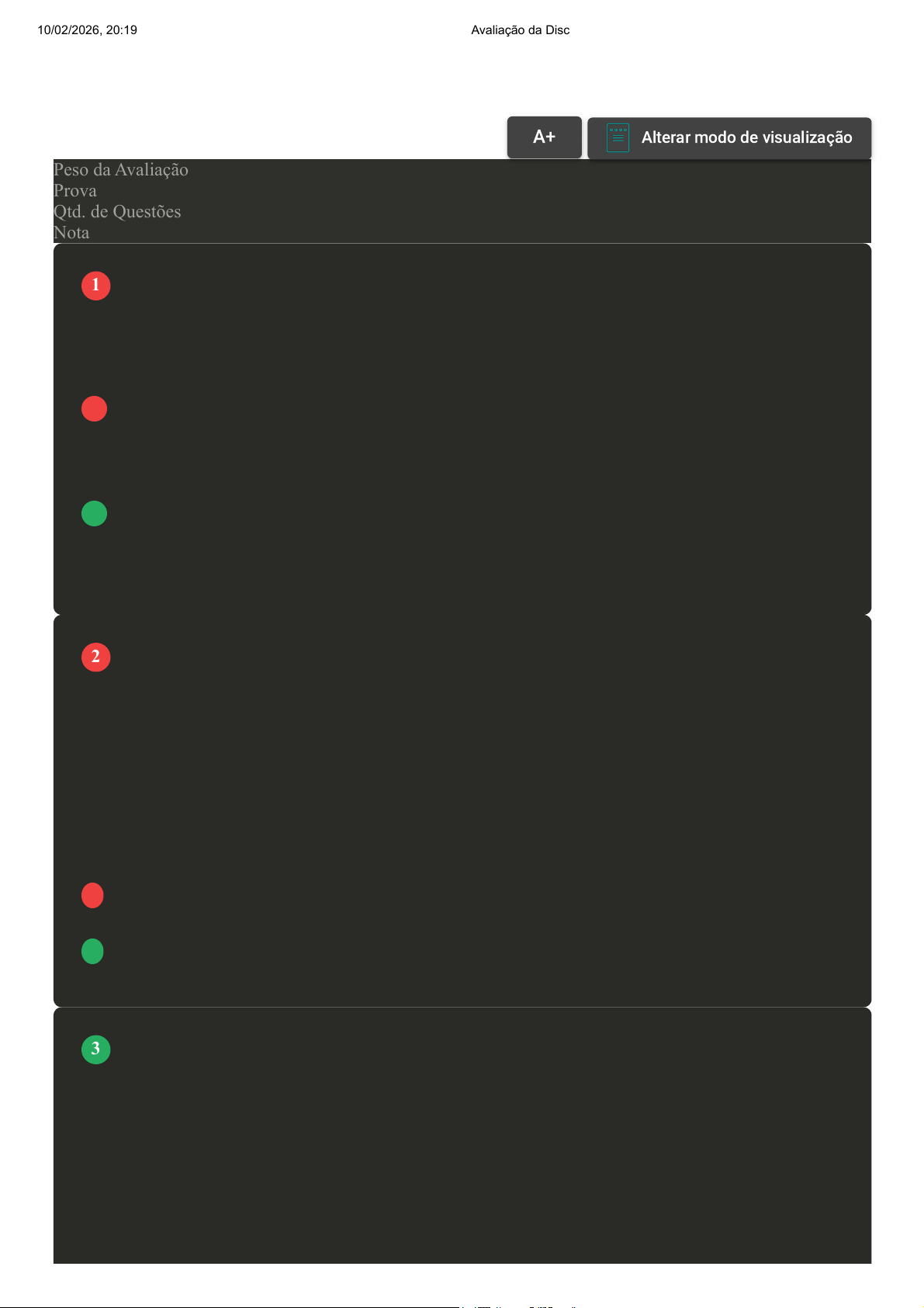 Prova Impressa GABARITO | Avaliação da Disciplina (Cod.:870005) Peso da Avaliação 10,00 Prova 113058845 Qtd. de Questões 20 Nota 6,50 O ferro é considerado o metal com maior importância para a saúde humana, tendo importante papel, como formar a hemoglobina e a mioglobina. Sua deficiência causa a anemia ferropriva, uma doença carencial muito presente em todo o mundo. Com relação à carência de ferro e à anemia ferropriva, assinale a alternativa CORRETA: A O aumento do consumo de alimentos fonte de ferro não heme cura a anemia ferropriva. B Alimentos fonte de ferro heme devem ser consumidos com fitatos para aumentar sua biodisponibilidade. C Na anemia ocorre baixa concentração de hemoglobina no sangue. D O aumento do consumo de alimentos fonte de ferro heme não cura a anemia ferropriva. As interações que ocorrem entre os micronutrientes podem prejudicar sua biodisponibilidade e, consequentemente, trazer prejuízos para a saúde como um todo. Essas interações podem ocorrer de forma direta ou indireta, sendo importante que os profissionais de saúde saibam reconhecê-las. Sobre o exposto, assinale a alternativa CORRETA: A Interações diretas dizem respeito à interferência que um micronutriente pode exercer no metabolismo de outro. B A ingestão em conjunto de dois ou mais micronutrientes não é um fator que afeta sua biodisponibilidade. C Interações indiretas dizem respeito à competição que pode ocorrer entre micronutrientes na absorção intestinal. D Interação de micronutrientes com fármacos administrados por via oral pode interferir em sua biodisponibilidade. Ao estudar o metabolismo de vitaminas, muita atenção é dada a deficiência destas substâncias, principalmente por ser mais frequente devido às baixas necessidades de ingestão. Entretanto, as hipervitaminoses também ocorrem e podem ser prejudiciais à saúde. Considerando as hipervitaminoses e seus efeitos, assinale a alternativa CORRETA: A A hipervitaminose da vitamina B3 pode levar à dermatite. B A hipervitaminose da vitamina C pode levar à redução da absorção de ferro. VOLTAR A+ Alterar modo de visualização 1 2 3 10/02/2026, 20:19 Avaliação da Disciplina about:blank 1/8 C A hipervitaminose da vitamina B12 pode levar ao enrijecimento muscular. D A hipervitaminose da vitamina D pode levar à calcificação óssea. A água é um composto líquido, incolor, inodoro e insípido. Estudos demonstraram que a água compõe cerca de 50% a 60% de um organismo adulto, sendo sua falta incompatível com a vida. Com relação à água, assinale a alternativa CORRETA: A A água apresenta diversos micronutrientes, principalmente minerais, que atuarão como micronutrientes reguladores no organismo. B A água corporal é igual em homens e mulheres, sendo a recomendação de sua ingestão igual em ambos os sexos. C A água é essencial para o funcionamento do organismo, assim é perdida somente em casos de doenças que levam à desidratação. D A água deve ser ingerida com cautela por indivíduos com dieta focando emagrecimento. A vitamina A pode ser considerada a vitamina mais antiga, pois foi a primeira a ser identificada. Também é conhecida como retinol, devido a sua atuação benéfica para a retina dos olhos. Com relação à vitamina A, classifique V para as sentenças verdadeiras e F para as falsas: ( ) A deficiência de vitamina A pode ocasionar problemas sérios à córnea ocular. ( ) Apresenta importante função no desenvolvimento e resistência do esqueleto. ( ) Participa da síntese de hormônios esteroides. ( ) Deixa o organismo susceptível a infecções. Assinale a alternativa que apresenta a sequência CORRETA: A V - F - F - V. B V - V - V - F. C F - F - V - V. D F - V - V - F. As vitaminas são micronutrientes orgânicos importantes para o desenvolvimento das funções do corpo humano. Desde de que foram identificadas pela primeira vez em 1911, já foram consideradas essenciais para a vida, despertando o interesse para seu estudo. Considerando as características principais das vitaminas, analise as seguintes sentenças: I- Produzem energia. II- Regulam processos metabólicos. III- Oxidam na presença de oxigênio. IV- Atuam como coenzimas. Assinale a alternativa CORRETA: A Somente a afirmativa IV está correta. B Somente a afirmativa I está correta. C As afirmativas I, II e III estão corretas. 4 5 6 10/02/2026, 20:19 Avaliação da Disciplina about:blank 2/8 D As afirmativas II, III e IV estão corretas. A biodisponibilidade representa a quantidade de um nutriente ingerido que realmente atuará no organismo, exercendo seus efeitos potencialmente benéficos. Ela influenciará tanto o efeito benéfico quanto a toxicidade que o nutriente poderá apresentar. Considerando os fatores que podem interferir na biodisponibilidade de um nutriente, analise as seguintes sentenças: I- Estrutura do nutriente associada ou não a outro componente químico. II- Quantidade ingerida. III- Ingestão isolada de um nutriente. IV- Matriz alimentar. Assinale a alternativa CORRETA: A Somente a afirmativa IV está correta. B As afirmativas I, II e IV estão corretas. C As afirmativas II e III estão corretas. D As afirmativas I e III estão corretas. Os microminerais ou microelementos são minerais necessários ao organismo em pequenas quantidades. Entretanto, suas funções são essenciais para a homeostase corporal. Considerando alguns principais micronutrientes e suas funções, associe os itens, utilizando o código a seguir: I- Flúor. II- Iodo. III- Cromo. ( ) Participa da síntese dos hormônios da tireoide. ( ) Importante componente do esmalte dental. ( ) Potencializa a ação da insulina. Assinale a alternativa que apresenta a sequência CORRETA: A I - II - III. B II - I - III. C II - III - I. D III - I - II. Os carboidratos são macronutrientes formados por hidratos de carbono e glicídios, sendo uma fonte rápida de energia para o funcionamento celular e corporal. Estão muito presentes em v