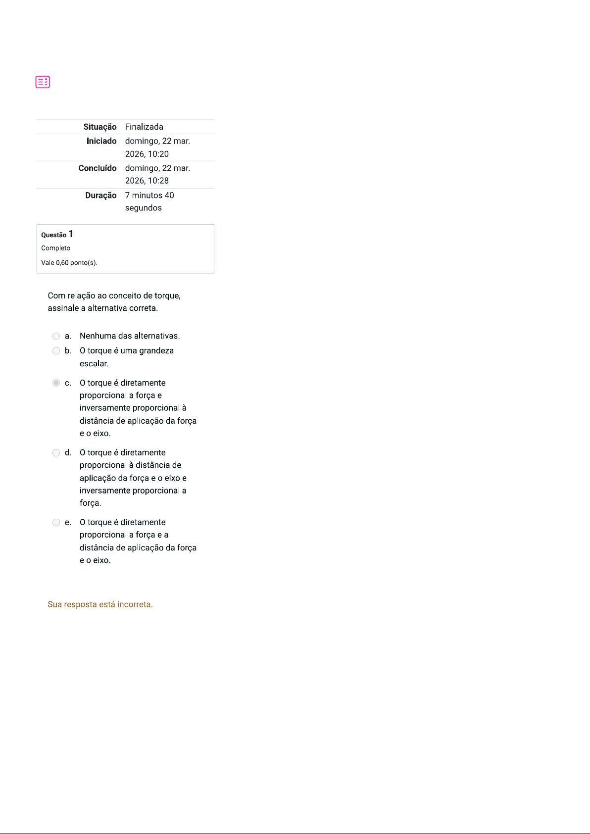 Situação Finalizada Iniciado domingo, 22 mar. 2026, 10:20 Concluído domingo, 22 mar. 2026, 10:28 Duração 7 minutos 40 segundos Questão 1 Completo Vale 0,60 ponto(s). Com relação ao conceito de torque, assinale a alternativa correta. a. Nenhuma das alternativas. b. torque é uma grandeza escalar. torque é diretamente proporcional a força e inversamente proporcional à distância de aplicação da força e o eixo. d. torque é diretamente proporcional à distância de aplicação da força e o eixo e inversamente proporcional a força. e. torque é diretamente proporcional a força e a distância de aplicação da força e o eixo. Sua resposta está incorreta.Questão 2 Completo Vale 0,60 ponto(s). Com base no que foi estudado das expressões matemáticas das energias, marque a alternativa correta. a. A energia cinética pode ser nula. b. A energia cinética é proporcional à altura do objeto. A energia cinética de um corpo é igual ao produto da massa pela aceleração ao quadrado. d. A energia potencial gravitacional é proporcional a massa do objeto. e. A energia potencial gravitacional é inversamente proporcional a velocidade. Sua resposta está incorreta. Questão 3 Completo Vale 0,60 ponto(s). equilíbrio de um ponto material é dado por: a. A somatória dos torques é mínima. b. A somatória das forças deve ser igual a infinito. Nenhuma das alternativas. d. A somatória das forças deve ser igual a zero. e. A somatória dos torques é máxima. Sua resposta está correta.Questão 4 Completo Vale 0,60 ponto(s). Uma partícula está em repouso, com relação a isso, é correto afirmar que. a. Só existe repouso se não há forças sobre o corpo. b. A resultante das forças atuando sobre o corpo é nula. Nenhuma das alternativas. d. A força que atua sobre o corpo é nula. e. A velocidade é diferente de zero. Sua resposta está correta. Questão 5 Completo Vale 0,60 ponto(s). Com relação ao conceito de energia mecânica, assinale a alternativa correta. a. A energia mecânica nunca pode ser constante. b. A energia mecânica é constante em um sistema conservativo. Mesmo com atrito a energia mecânica é constante. d. Nenhuma das alternativas. e. A energia mecânica é igual à energia cinética quando uma bola está caindo de um prédio durante todo o movimento. Sua resposta está correta.Questão 6 Completo Vale 0,60 ponto(s). Dada a função horária abaixo: = 10 + Onde se localiza o móvel na origem dos tempos? a. 10 m. b. 3,5 m. d. e. Nenhuma das alternativas. Sua resposta está correta. Questão 7 Completo Vale 0,60 ponto(s). Um jogador de tênis, ao acertar a bola com a raquete, devolve-a para o campo do adversário. Sobre essa situação, é correto afirmar que, de acordo com: a. Nenhuma das alternativas. b. A Terceira Lei de Newton, a força que a bola exerce sobre a raquete é igual, em módulo, à força que a raquete exerce sobre a bola. A Primeira Lei de Newton, a bola teve o seu movimento alterado devido à força exercida pela raquete. d. A Primeira Lei de Newton, após o impacto com a raquete, a aceleração da bola é grande, porque a sua massa é pequena. e. A Terceira Lei de Newton, a raquete adquire, em módulo, a mesma aceleração que a bola. Sua resposta está correta.Questão 8 Completo Vale 0,60 ponto(s). Com base no que foi aprendido nessa unidade sobre colisões mecânicas, assinale a alternativa correta. a. Na colisão perfeitamente elástica o coeficiente de restituição é igual a zero. b. Na colisão parcialmente elástica o coeficiente de restituição é menor do que zero. Em qualquer tipo de colisão mecânica, a quantidade de movimento total do sistema se conserva. d. coeficiente de restituição pode ser escrito em termos da velocidade relativa de afastamento e a energia cinética. e. Na colisão inelástica, o coeficiente de restituição é igual a 1. Sua resposta está correta. Questão 9 Completo Vale 0,60 ponto(s). A função horária dos espaços de um corpo é: Determine o (s) instante (s) em que o corpo passa pela origem dos espaços. a. 1 e 2 segundos. b. 4 e 8 segundos. 3 e 6 segundos. d. 0 e 9 segundos. e. 5 e 8 segundos. Sua resposta está correta.Questão 10 Completo Vale 0,60 ponto(s). Um avião parte do repouso de uma plataforma de lançamento, com aceleração escalar de 440 m/s², suposta constante, que é mantida nos primeiros 19,8 m da subida. Calcule a velocidade escalar do avião no final desse deslocamento. a. v = 212 m/s b. = 132 m/s v = 63 m/s d. v = 96 m/s e. v = 39 m/s Sua resposta está correta.