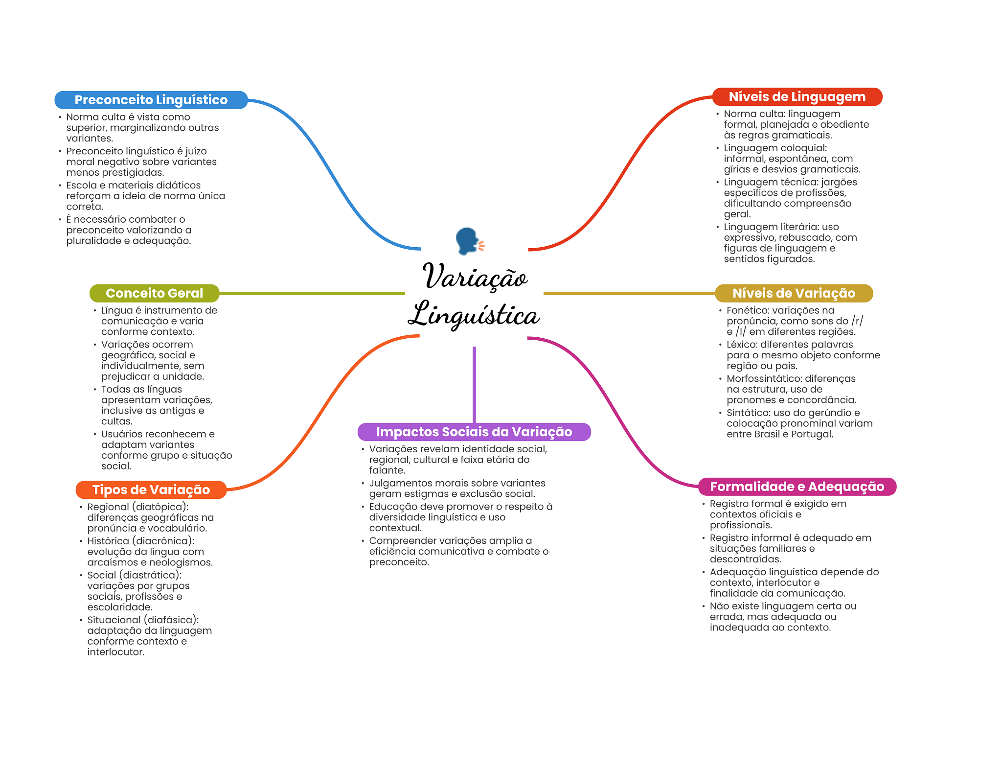 Preconceito Linguístico Níveis de Linguagem Norma culta é vista como Norma culta: linguagem superior, marginalizando outras formal, planejada e obediente variantes. às regras gramaticais. Preconceito linguístico é juízo Linguagem coloquial: moral negativo sobre variantes informal, espontânea, com menos prestigiadas. gírias e desvios gramaticais. Escola e materiais didáticos Linguagem técnica: jargões reforçam a ideia de norma única específicos de profissões, correta. dificultando compreensão É necessário combater geral. preconceito valorizando a Linguagem literária: uso pluralidade e adequação. expressivo, rebuscado, com figuras de linguagem e sentidos figurados. Variação Conceito Geral Níveis de Variação Língua é instrumento de Linguística Fonético: variações na comunicação e varia pronúncia, como sons do /r/ conforme contexto. e em diferentes regiões. Variações ocorrem Léxico: diferentes palavras geográfica, social e para mesmo objeto conforme individualmente, sem região ou país. prejudicar a unidade. Morfossintático: diferenças Todas as línguas na estrutura, uso de apresentam variações, pronomes e concordância. inclusive as antigas e Sintático: uso do gerúndio e cultas. colocação pronominal variam Usuários reconhecem e Impactos Sociais da Variação entre Brasil e Portugal. adaptam variantes Variações revelam identidade social, conforme grupo e situação regional, cultural e faixa etária do social. falante. Julgamentos morais sobre variantes Tipos de Variação Formalidade e Adequação geram estigmas e exclusão social. Regional (diatópica): Educação deve promover respeito à Registro formal é exigido em diferenças geográficas na diversidade linguística e uso contextos oficiais e pronúncia e vocabulário. contextual. profissionais. Histórica (diacrônica): Compreender variações amplia a Registro informal é adequado em evolução da língua com eficiência comunicativa e combate situações familiares e arcaísmos e neologismos. preconceito. descontraídas. Social (diastrática): Adequação linguística depende do variações por grupos contexto, interlocutor e sociais, profissões e finalidade da comunicação. escolaridade. Não existe linguagem certa ou Situacional (diafásica): errada, mas adequada ou adaptação da linguagem inadequada ao contexto. conforme contexto e interlocutor.