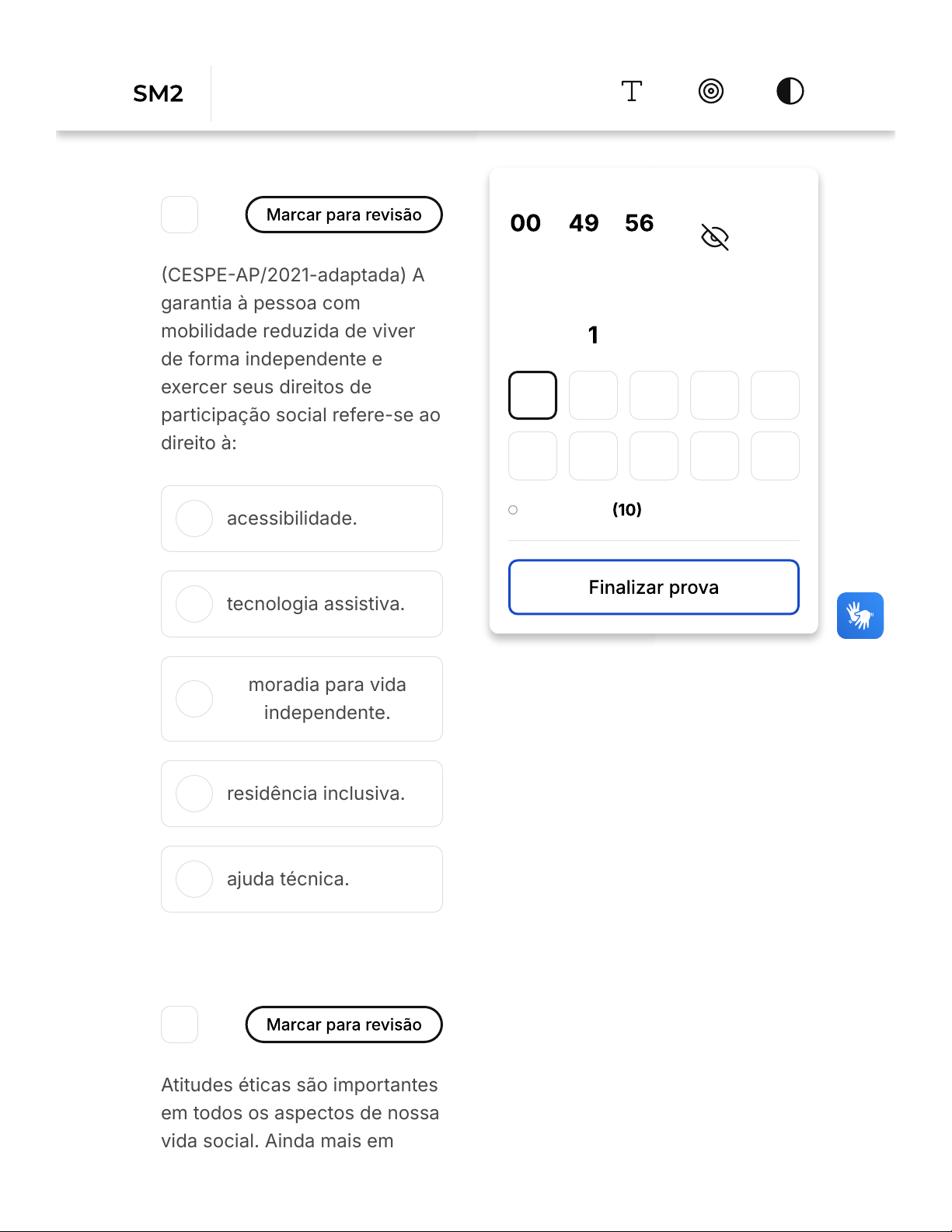 A B C D E 1 �CESPE�AP/2021-adaptada) A garantia à pessoa com mobilidade reduzida de viver de forma independente e exercer seus direitos de participação social refere-se ao direito à: acessibilidade. tecnologia assistiva. moradia para vida independente. residência inclusiva. ajuda técnica. 2 Atitudes éticas são importantes em todos os aspectos de nossa vida social. Ainda mais em hora : min : seg Ocultar Questão de 10 Em branco 1 2 3 4 5 6 7 8 9 10 Exercicio Profissional Em Fisioterapia Firefox https://estacio.saladeavaliacoes.com.br/prova/69b02d86b97141f58535847b/ 1 of 14 10/03/2026, 11:41 A B momentos de extremas dificuldades. Diante da pandemia do Novo Coronavírus �Covid-19�, que se alastra pelo mundo, fazendo milhares de vítimas fatais e gerando um imenso caos econômico e social, nossas condutas e atitudes devem ser pautadas pela ética. Sabendo disso, assinale o item que representa uma atitude em que há uma postura ética em relação ao assunto pandemia de Covid-19. Guardar distância das pessoas, higienizar as mãos conforme preconizado pelas autoridades de saúde e usar máscara no contato com outras pessoas. Repassar para pessoas e grupos todas as mensagens que chegarem para você sobre o assunto, dar conselhos e emitir juízos sobre a pandemia dentro de suas crenças e valores, e ter uma postura destemida e desafiadora diante do problema. Firefox https://estacio.saladeavaliacoes.com.br/prova/69b02d86b97141f58535847b/ 2 of 14 10/03/2026, 11:41 C D E Manter-se em contato físico contínuo com seus pais, avós e pessoas mais velhas. Ser solidário com quem precisa, ajudando com doações, ficando à disposição para ir às casas e estar em contato com as pessoas. Ir em festas e reuniões de grupos, para ficar próximo dos seus amigos. 3 Leia com atenção o texto a seguir. "A malária da Amazônia torna- se representativa numericamente a partir da década de 1970, quando essa região passa a ser povoada por migrantes do Sul, Sudeste e Nordeste do país, em busca de trabalho nas obras de infraestrutura (hidrelétricas, rodovias, projetos de mineração), no garimpo, na Firefox https://estacio.saladeavaliacoes.com.br/prova/69b02d86b97141f58535847b/ 3 of 14 10/03/2026, 11:41 extração de madeira e nos projetos agropecuários. A abertura das fronteiras norte e oeste à ocupação e ao desenvolvimento econômico não constava dos planos do programa de erradicação da malária proposto no início da década de 1950, e uma adaptação do plano não foi feita para essa nova circunstância no processo de desenvolvimento do país. Desse modo, a incidência da malária, após atingir o seu nadir no início da década de 1970, inverte a tendência de queda imposta pela campanha de erradicação e inicia um crescimento que somente se interromperia no início do século XXI. Apesar desse crescimento nos casos de malária num espaço de tempo de menos de duas décadas, a malária na porção extra-amazônica do país, onde se concentra a quase totalidade da população, virtualmente desapareceu. A campanha de erradicação da malária iniciada nos anos 50 foi um sucesso, o crescimento da doença na Amazônia foi resultado da inexistência de um projeto específico de controle, as estratégias da campanha foram delineadas para uma parte do país e contemplavam uma Amazônia praticamente Firefox https://estacio.saladeavaliacoes.com.br/prova/69b02d86b97141f58535847b/ 4 of 14 10/03/2026, 11:41 A B C D E despovoada, com uma população ribeirinha de pequena mobilidade." Fonte: SILVA, L. J. O controle das endemias no Brasil e sua história. Ciênc. Cult. v.55, n.1, p. 44�47. 2003. Disponível em: . Acesso em 21 set. 2021. Em relação ao Brasil, a Malaria pode ser classificada como: uma epidemia. uma endemia. uma Pandemia. um surto. endemia e epidemia. 4 Planejamento familiar é a política pública que leva em consideração a saúde e os direitos sexuais e reprodutivos da população como um todo. Seu foco é a prevenção e a orientação. Acerca dos métodos Firefox https://estacio.saladeavaliacoes.com.br/prova/69b02d86b97141f58535847b/ 5 of 14 10/03/2026, 11:41 A B C contraceptivos para planejamento familiar no âmbito do Sistema Único de Saúde- SUS, marque a alternativa correta. O SUS deve oferecer diferentes opções de métodos anticoncepcionais para todas as etapas da vida reprodutiva. O SUS, não deve garantir a atenção integral à saúde, que inclua a assistência à concepção e à contracepção, num contexto de respeito aos direitos sexuais e aos direitos reprodutivos. O dispositivo intrauterino �DIU) não é um método contraceptivo indicado pelo Ministério da Saúde. Firefox https://estacio.saladeavaliacoes.com.br/prova/69b02d86b97141f58535847b/ 6 of 14 10/03/2026, 11:41 D E Os métodos contraceptivos hormonais são classificados como irreversíveis ou definitivos. Os métodos contraceptivos são de uso obrigatório a todos que realizam atividade sexual. 5 A doação de órgãos e os transplantes são procedimentos importantes que vêm crescendo no país. Sobre a doação de órgãos, analise as assertivas a seguir: I. Maria, carioca de 19 anos, resolveu doar um dos seus rins para uma menina da mesma idade, que não era parente. Ela então foi solicitar uma autorização judicial para essa doação. Após a solicitação, ela foi ao hospital e foi informada que não precisava mais realizar exames, pois já tinha realizado o cadastro anteriormente. II. O doador vivo é uma pessoa maior de idade e juridicamente capaz, saudável e que Firefox https://estacio.saladeavaliacoes.com.br/prova/69b02d86b97141f58535847b/ 7 of 14 10/03/2026, 11:41 A B C D E concorde com a doação, desde que não prejudique a sua própria saúde. Podem ser doadores vivos não parentes, só com autorização judicial para doação de um dos rins. Como ela não apresenta parentesco, não precisa realizar exames pré- transplante. Marque a alternativa que apresenta a relação correta 