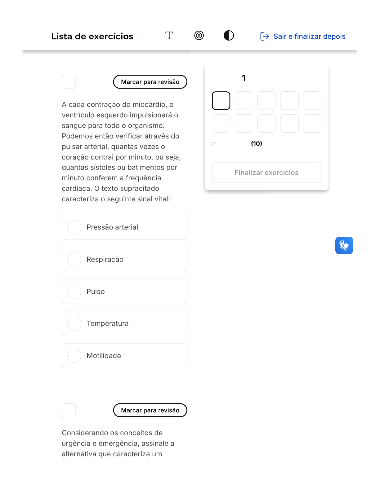 A B C D E 1 A cada contração do miocárdio, o ventrículo esquerdo impulsionará o sangue para todo o organismo. Podemos então verificar através do pulsar arterial, quantas vezes o coração contrai por minuto, ou seja, quantas sístoles ou batimentos por minuto conferem a frequência cardíaca. O texto supracitado caracteriza o seguinte sinal vital: Pressão arterial Respiração Pulso Temperatura Motilidade 2 Considerando os conceitos de urgência e emergência, assinale a alternativa que caracteriza um Questão de 10 Em branco 1 2 3 4 5 6 7 8 9 10 Introdução… Firefox https://estacio.saladeavaliacoes.com.br/exercicio/699ddb7047f1180eea... 1 of 9 24/02/2026, 14:10 A B C D E quadro de urgência. Situação onde há risco à vida, necessitando do transporte imediato da vítima para um hospital / clínica. Situação onde não há risco à vida, a vítima pode receber os cuidados imediatos no local onde se encontra. Situação onde não importa o estado da vítima, e a mesma pode receber os cuidados imediatos no local onde se encontra. Situação onde o atendimento procura chegar precocemente à vítima. Situação onde não há risco à vida, necessitando do transporte imediato da vítima para um hospital / clínica. 3 Em relação aos direitos da pessoa que estiver sendo atendida, o prestador de socorro deve ter em Firefox https://estacio.saladeavaliacoes.com.br/exercicio/699ddb7047f1180eea... 2 of 9 24/02/2026, 14:10 A B C D E mente que a vítima possui o direito de recusar o atendimento. No caso de adultos, esse direito existe quando eles estiverem conscientes e com clareza de pensamento. Isto pode ocorrer por diversos motivos, tais como: crenças religiosas ou falta de confiança no prestador de socorro que for realizar o atendimento. Assinale a alternativa que não se relaciona à tais direitos. Não discuta com a vítima. Questione suas razões, principalmente se elas forem baseadas em crenças religiosas. Não toque na vítima, isso poderá ser considerado como violação dos seus direitos. Converse com a vítima. Informe a ela que você possui treinamento em primeiros socorros, que irá respeitar o direito dela de recusar o atendimento, mas que está pronto para auxiliá- la no que for necessário. Arrole testemunhas de que o atendimento foi recusado por parte da vítima. Firefox https://estacio.saladeavaliacoes.com.br/exercicio/699ddb7047f1180eea... 3 of 9 24/02/2026, 14:10 A B C D E 4 No caso de crianças, a recusa do atendimento pode ser feita pelo pai, pela mãe ou pelo responsável legal. Se a criança é retirada do local do acidente antes da chegada do socorro especializado, o prestador de socorro deverá: Arrolar testemunhas que comprovem tal fato Impedir a retirada da vítima Convencer os responsáveis a permanecer com a vítima no local Transportar a vítima mesmo sem o consentimento dos responsáveis Apenas sinalizar o local do acidente 5 Os primeiros relatos históricos relacionados aos primeiros socorros datam do século XVIII, onde o suíço Jean Henry Dumant, administrador da Sociedade Anônima Moinhos de Mons-Djemile, foi a Paris com o Firefox https://estacio.saladeavaliacoes.com.br/exercicio/699ddb7047f1180eea... 4 of 9 24/02/2026, 14:10 A B C D E propósito de conseguir junto a Napoleão III, a autorização para instalar uma Companhia, o moinho, na Argélia, que pertencia ao domínio Francês. Considerando o texto supracitado, assinale o ano em que tal fato ocorreu. 1854. 1862. 1859. 1870. 1843. 6 A formação profissional de um socorrista não se restringe ao médico, podendo envolver outros profissionais da área de saúde como paramédicos, enfermeiros, auxiliares de enfermagem, entre outros. Relacionados com a segurança pública, bombeiros e policiais militares. A formação do profissional em questão depende de disciplinas específicas. Assinale a disciplina que não é necessária para sua formação. Firefox https://estacio.saladeavaliacoes.com.br/exercicio/699ddb7047f1180eea... 5 of 9 24/02/2026, 14:10 A B C D E A B C D Anatomia Emergências Médicas Sociologia Fisiologia Biossegurança 7 Quando a vítima verbaliza ou sinaliza que concorda com o atendimento, após o prestador de socorro ter se identificado como tal e ter informado à vítima que possui treinamento em primeiros socorros, caracteriza um atendimento. Informal Explícito Formal Implícito Firefox https://estacio.saladeavaliacoes.com.br/exercicio/699ddb7047f1180eea... 6 of 9 24/02/2026, 14:10 E A B C D E Casual 8 Sinal que pode ser notado através da coloração azul-arroxeada da pele, nos lábios e extremidades, caracterizando um comprometimento da insuficiência circulatória. Assinale a opção que corresponde à definição. Palidez Hiperemia Cianose Hipotermia Pirexia 9 Hemorragias, afogamentos, choques, coma, sonolência, face abatida, pulso filiforme, pele fria e pálida, situações traumáticas ou mesmo patológicas que geram um quadro de alteração da temperatura corporal são Firefox https://estacio.saladeavaliacoes.com.br/exercicio/699ddb7047f1180eea... 7 of 9 24/02/2026, 14:10 A B C D E A B C caracterizadas como: Pirexia Hipertermia Intermação Hipotermia Praxia 10 A saúde é direito de todos e dever do Estado, garantido mediante políticas sociais e econômicas que visem à redução do risco de doença e de outros agravos e ao acesso universal e igualitário às ações e serviços para sua promoção, proteção e recuperação. Considerando a Constituição brasileira, assinale o artigo em questão. 197. 145. 186. Firefox https://estacio.saladeavaliacoes.com.br/exercicio/699ddb7047f1180eea... 8 of 9 24/02/2026, 14:10 D E 193. 196. Firefox https://estacio.saladeavaliacoes.com.br/exercicio/699ddb7047f1180eea... 9 of 9 24/02/2026, 14:10