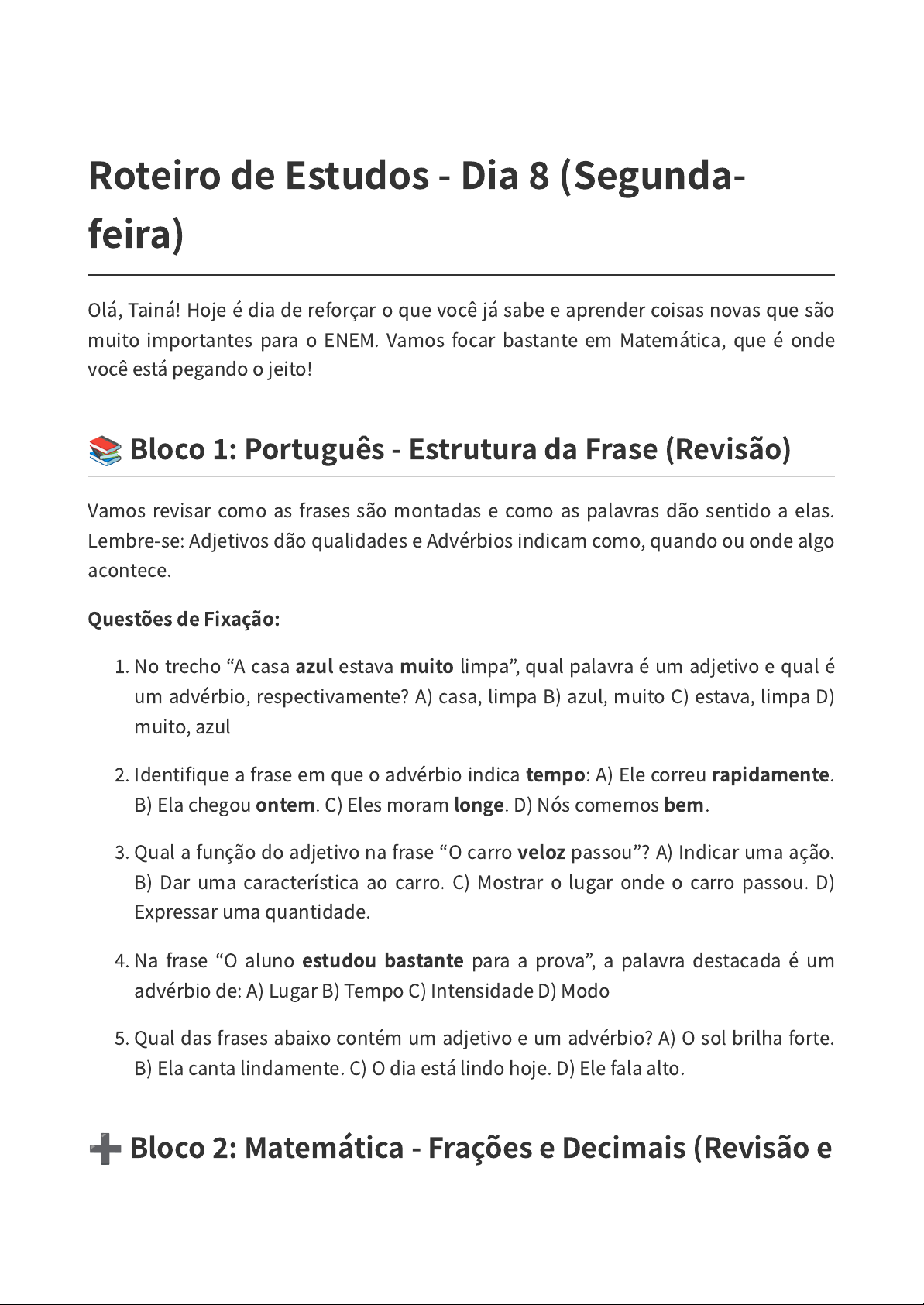 Roteiro de Estudos - Dia 8 (Segunda- feira) Olá, Tainá! Hoje é dia de reforçar o que você já sabe e aprender coisas novas que são muito importantes para o ENEM. Vamos focar bastante em Matemática, que é onde você está pegando o jeito! 📚 Bloco 1: Português - Estrutura da Frase (Revisão) Vamos revisar como as frases são montadas e como as palavras dão sentido a elas. Lembre-se: Adjetivos dão qualidades e Advérbios indicam como, quando ou onde algo acontece. Questões de Fixação: 1. No trecho “A casa azul estava muito limpa”, qual palavra é um adjetivo e qual é um advérbio, respectivamente? A) casa, limpa B) azul, muito C) estava, limpa D) muito, azul 2. Identifique a frase em que o advérbio indica tempo: A) Ele correu rapidamente. B) Ela chegou ontem. C) Eles moram longe. D) Nós comemos bem. 3. Qual a função do adjetivo na frase “O carro veloz passou”? A) Indicar uma ação. B) Dar uma característica ao carro. C) Mostrar o lugar onde o carro passou. D) Expressar uma quantidade. 4. Na frase “O aluno estudou bastante para a prova”, a palavra destacada é um advérbio de: A) Lugar B) Tempo C) Intensidade D) Modo 5. Qual das frases abaixo contém um adjetivo e um advérbio? A) O sol brilha forte. B) Ela canta lindamente. C) O dia está lindo hoje. D) Ele fala alto. ➕ Bloco 2: Matemática - Frações e Decimais (Revisão e Expressões) Hoje vamos misturar um pouco as operações com frações e decimais, e também aprender uma ferramenta super útil: a Regra de Três! Questões de Fixação: 1. Calcule: . A) 0,75 B) 0,25 C) 0,5 D) 1,0 2. Qual o resultado de ? A) 0,4 B) 0,8 C) 1,6 D) 0,2 3. Se você tem 2,5 litros de suco e quer dividir em copos de de litro, quantos copos você enche? A) 5 copos B) 8 copos C) 10 copos D) 12 copos 4. Transforme a fração em número decimal. A) 0,3 B) 0,5 C) 0,6 D) 0,8 5. Qual o valor de ? A) 1,0 B) 1,5 C) 0,75 D) 0,5 📏 Bloco 3: Matemática - Regra de Três Simples A Regra de Três nos ajuda a resolver problemas onde três valores são conhecidos e queremos descobrir um quarto valor. Ela pode ser direta (quando um aumenta, o outro também) ou inversa (quando um aumenta, o outro diminui). Questões de Fixação: 1. Se 3 pedreiros constroem um muro em 10 dias, quantos dias 6 pedreiros levariam para construir o mesmo muro? A) 20 dias B) 10 dias C) 5 dias D) 3 dias 2. Um carro percorre 100 km com 10 litros de gasolina. Quantos litros seriam necessários para percorrer 250 km? A) 15 litros B) 20 litros C) 25 litros D) 30 litros 3. Para pintar uma parede, 2 pintores levam 6 horas. Se fossem 4 pintores, quantas horas levariam? A) 12 horas B) 6 horas C) 3 horas D) 2 horas 4. Se 5 kg de arroz custam R 25,00 B) R 32,00 D) R$ 40,00 5. Uma máquina produz 50 peças em 2 horas. Quantas peças ela produziria em 5 horas? A) 100 peças B) 125 peças C) 150 peças D) 200 peças +4 1 0, 5 0, 8 × 2 1 4 1 5 3 1, 25 − 4 1 20, 00, quantocustariam8kgdomesmoarroz?A)R 30, 00C)R ⚔ Bloco 4: História - Invasões Estrangeiras no Brasil Depois que Portugal começou a explorar o Brasil, outros países europeus também quiseram um pedaço. Vamos ver quem tentou e por quê. Questões de Fixação: 1. Qual foi o principal motivo das invasões francesas e holandesas ao Brasil Colônia? A) Buscar ouro e pedras preciosas. B) Estabelecer colônias de povoamento. C) Participar do lucrativo comércio do açúcar. D) Apoiar a independência do Brasil. 2. A presença holandesa no Nordeste brasileiro, especialmente em Pernambuco, está ligada a qual atividade econômica? A) Extração de pau-brasil. B) Mineração de ouro. C) Produção e refino de açúcar. D) Criação de gado. 3. Qual figura histórica holandesa se destacou na administração de Pernambuco, promovendo o desenvolvimento urbano e cultural? A) D. João VI B) Maurício de Nassau C) Marquês de Pombal D) Pedro Álvares Cabral 4. As invasões francesas no Brasil ocorreram principalmente em qual região? A) Nordeste (Pernambuco). B) Sul (Rio Grande do Sul). C) Sudeste (Rio de Janeiro). D) Norte (Maranhão). 5. Qual foi a principal consequência da expulsão dos holandeses do Brasil para a economia açucareira colonial? A) Aumento da produção de açúcar no Brasil. B) Declínio da produção brasileira devido à concorrência holandesa nas Antilhas. C) Fortalecimento da aliança entre Portugal e Holanda. D) Descoberta de novas minas de ouro. 🏙 Bloco 5: Geografia - Urbanização Brasileira (Problemas Sociais) Vamos aprofundar nos desafios que o crescimento das cidades trouxe para a população brasileira. Questões de Fixação: 1. Qual o termo que descreve o crescimento desordenado de áreas urbanas, geralmente com moradias precárias e falta de infraestrutura? A) Metropolização B) Conurbação C) Favelização D) Gentrificação 2. A falta de acesso a serviços básicos como água tratada, esgoto e coleta de lixo em áreas urbanas é um problema de: A) Mobilidade urbana B) Saneamento básico C) Poluição atmosférica D) Segregação socioespacial 3. O que significa o conceito de “segregação socioespacial” nas cidades? A) A mistura de diferentes classes sociais em um mesmo bairro. B) A separação física e social de grupos por renda e acesso a serviços. C) A construção de parques e áreas verdes em todas as regiões. D) A descentralização dos serviços públicos para a periferia. 4. Qual das alternativas abaixo NÃO é um problema comum das grandes cidades brasileiras? A) Trânsito intenso B) Violência urbana C) Excesso de áreas verdes D) Poluição do ar 5. O êxodo rural, que impulsionou a urbanização brasileira, foi motivado principalmente pela busca de: A) Mais contato com a natureza. B) Melhores condições de vida e emprego nas cidades. C) Fugir da violência urbana. D) Acesso a terras para agricultura. ✍ Atividade de Desenvolvimento: Escrita e Vocabulário Instruções: Escolha um dos problemas urbanos que você estudou hoje (favelização, falta de saneament